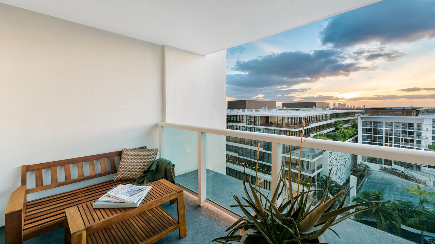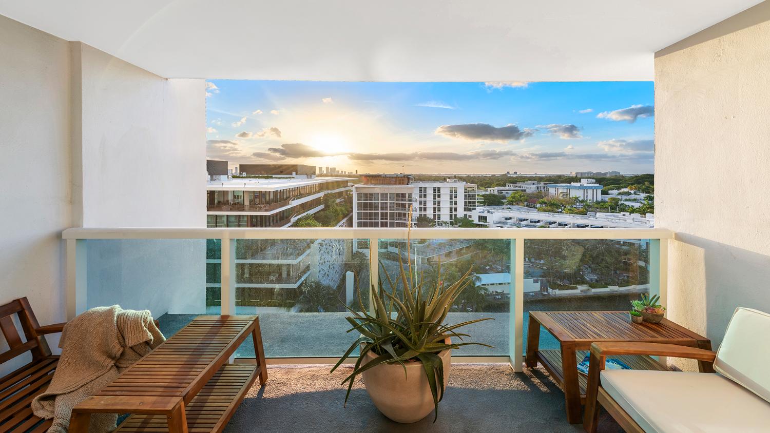 City & bay-facing vantage (unit 945): take in evening sunsets and the glitter of the Downtown Miami skyline.