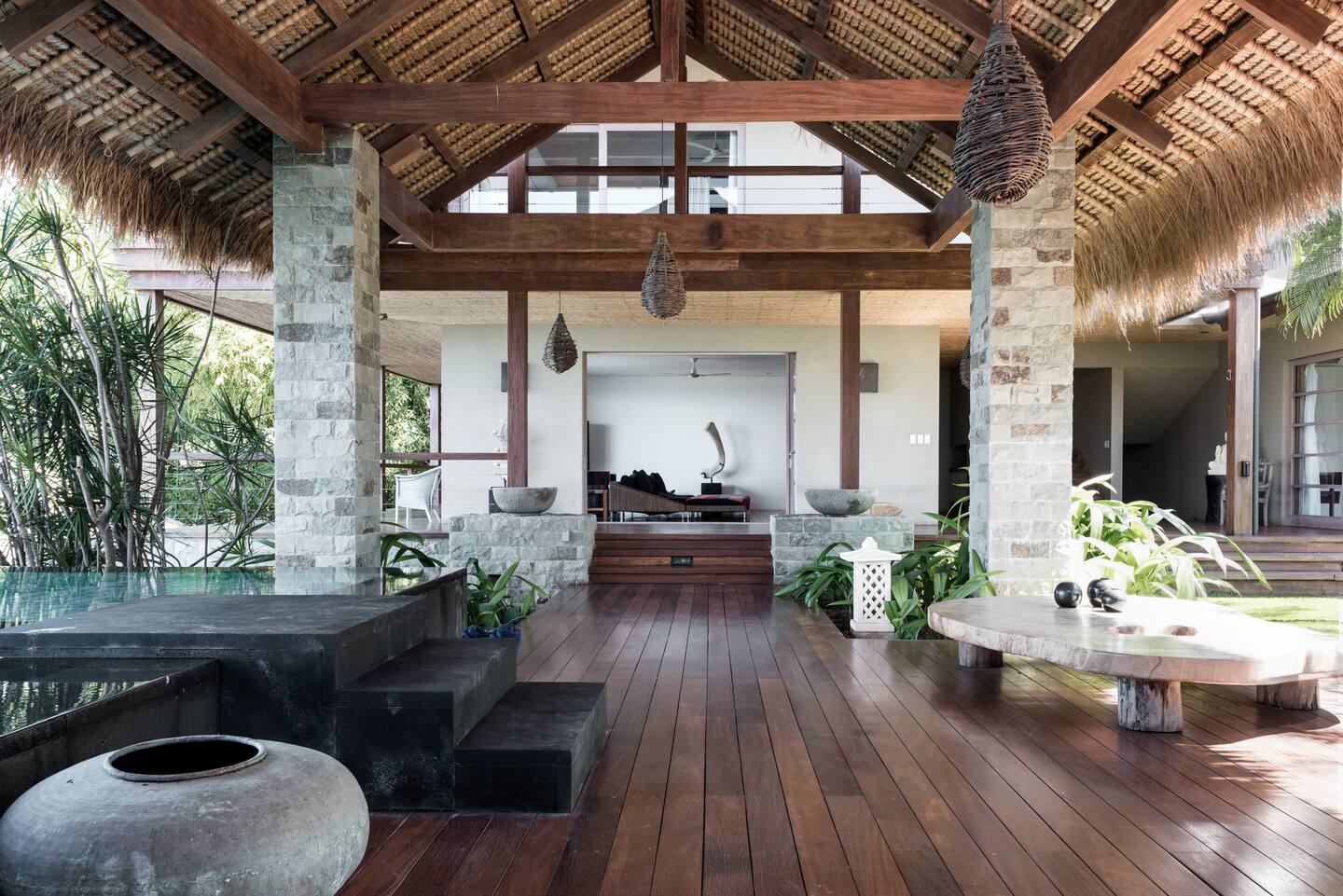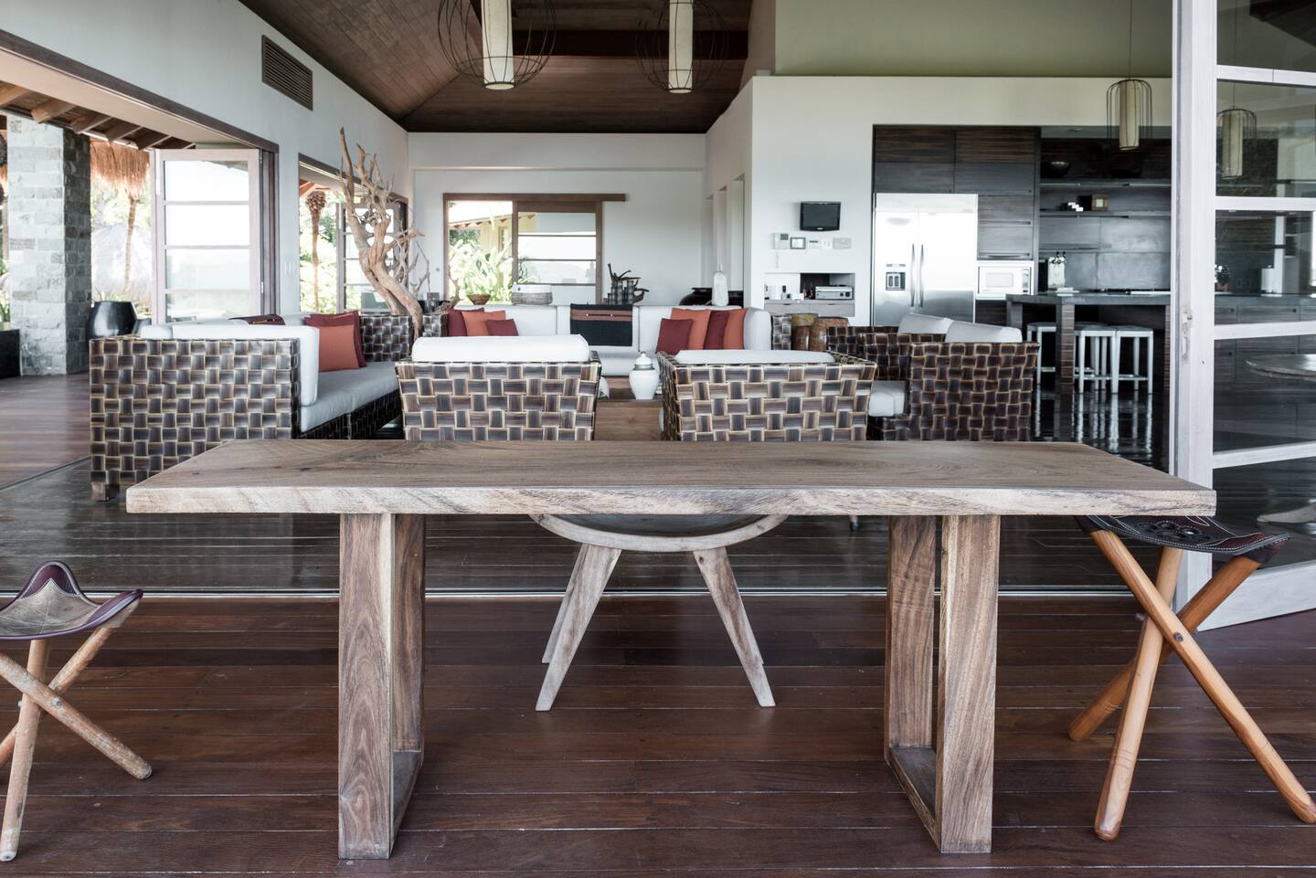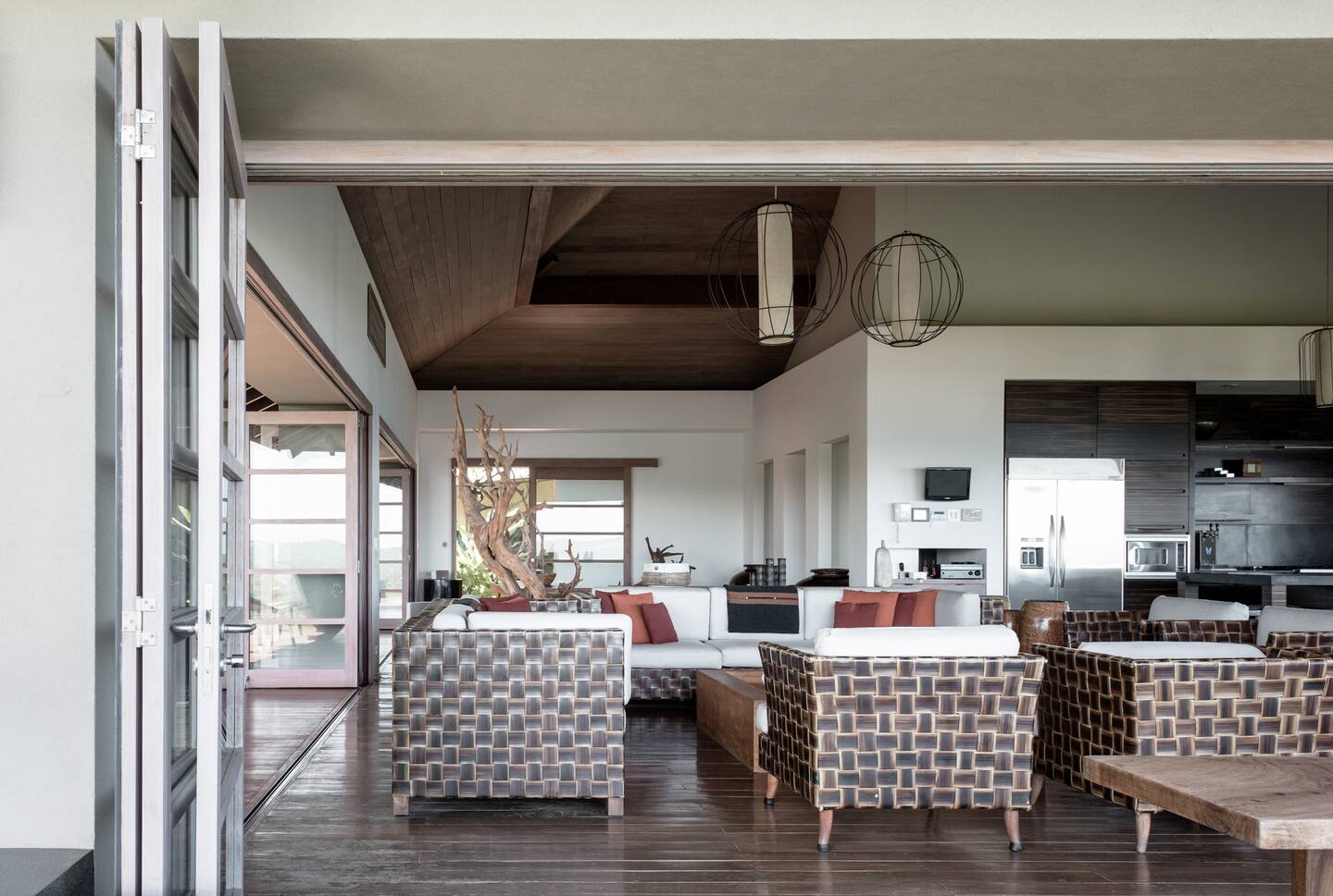 The outdoor area includes an outdoor shower and a barbecue nearby the alfresco dining area. The great room features a vaulted ceiling, woven sofas and chairs with sophisticated charcoal cushions.