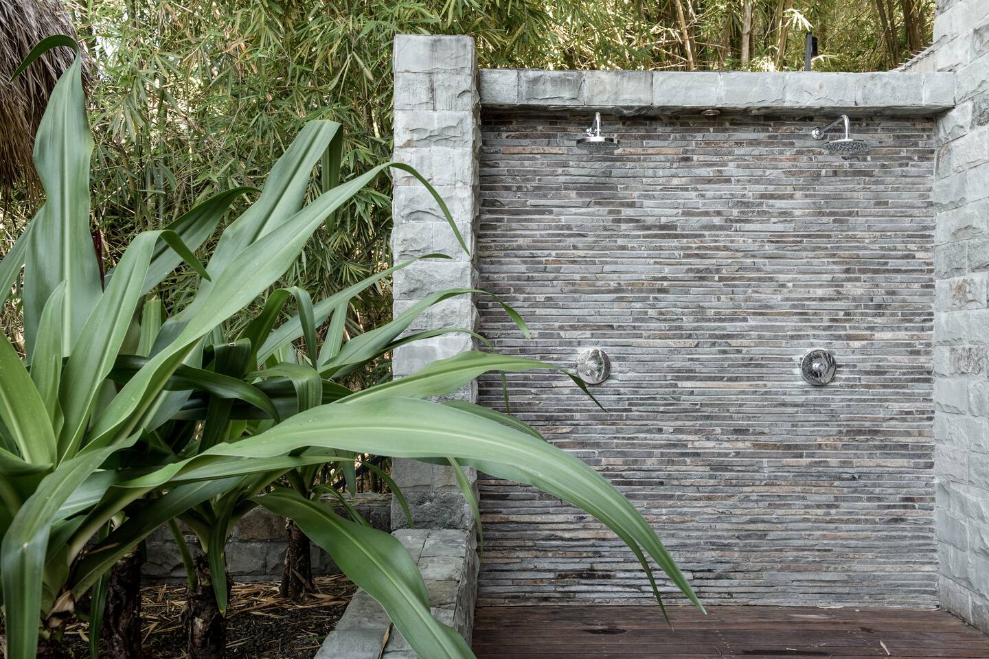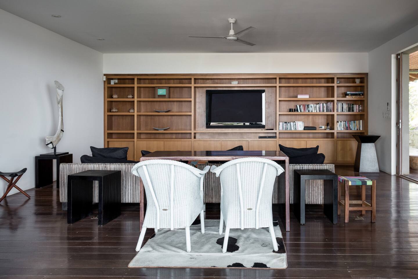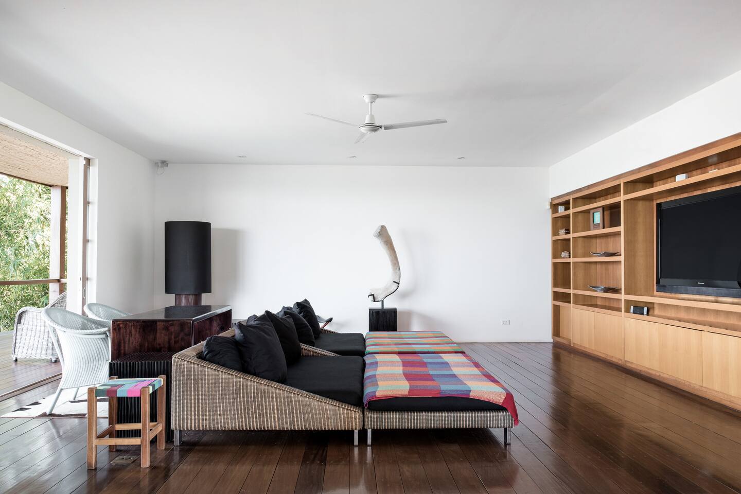 The outdoor area includes an outdoor shower and a barbecue nearby the alfresco dining area. The great room features a vaulted ceiling, woven sofas and chairs with sophisticated charcoal cushions.