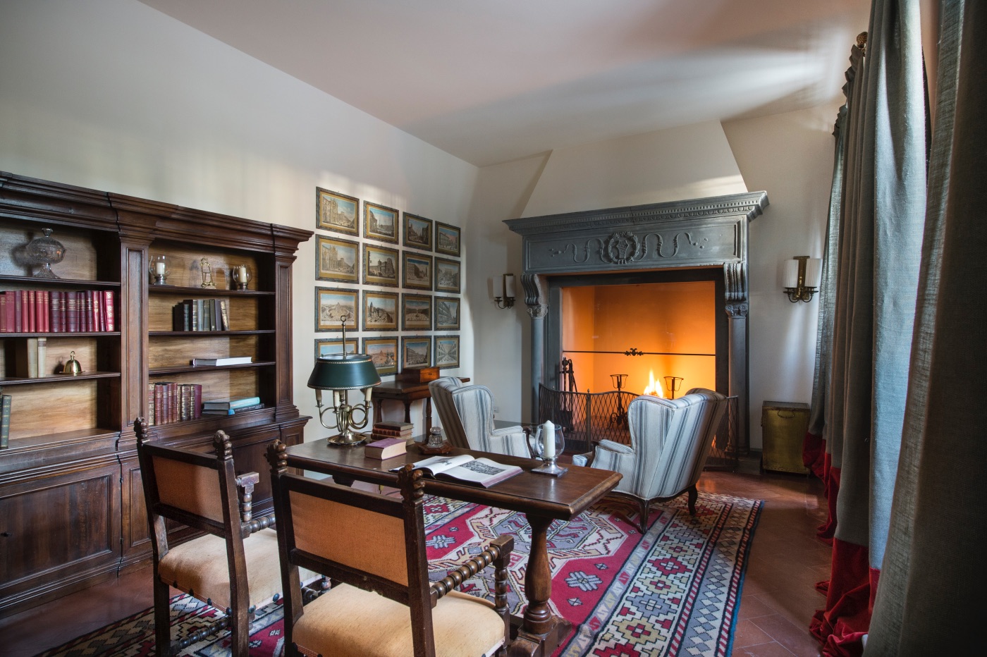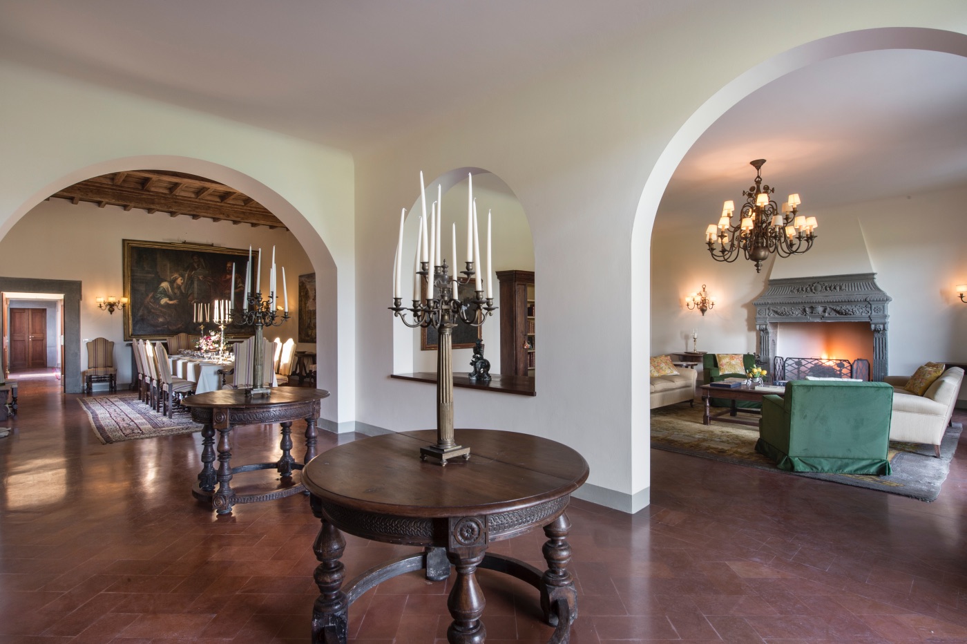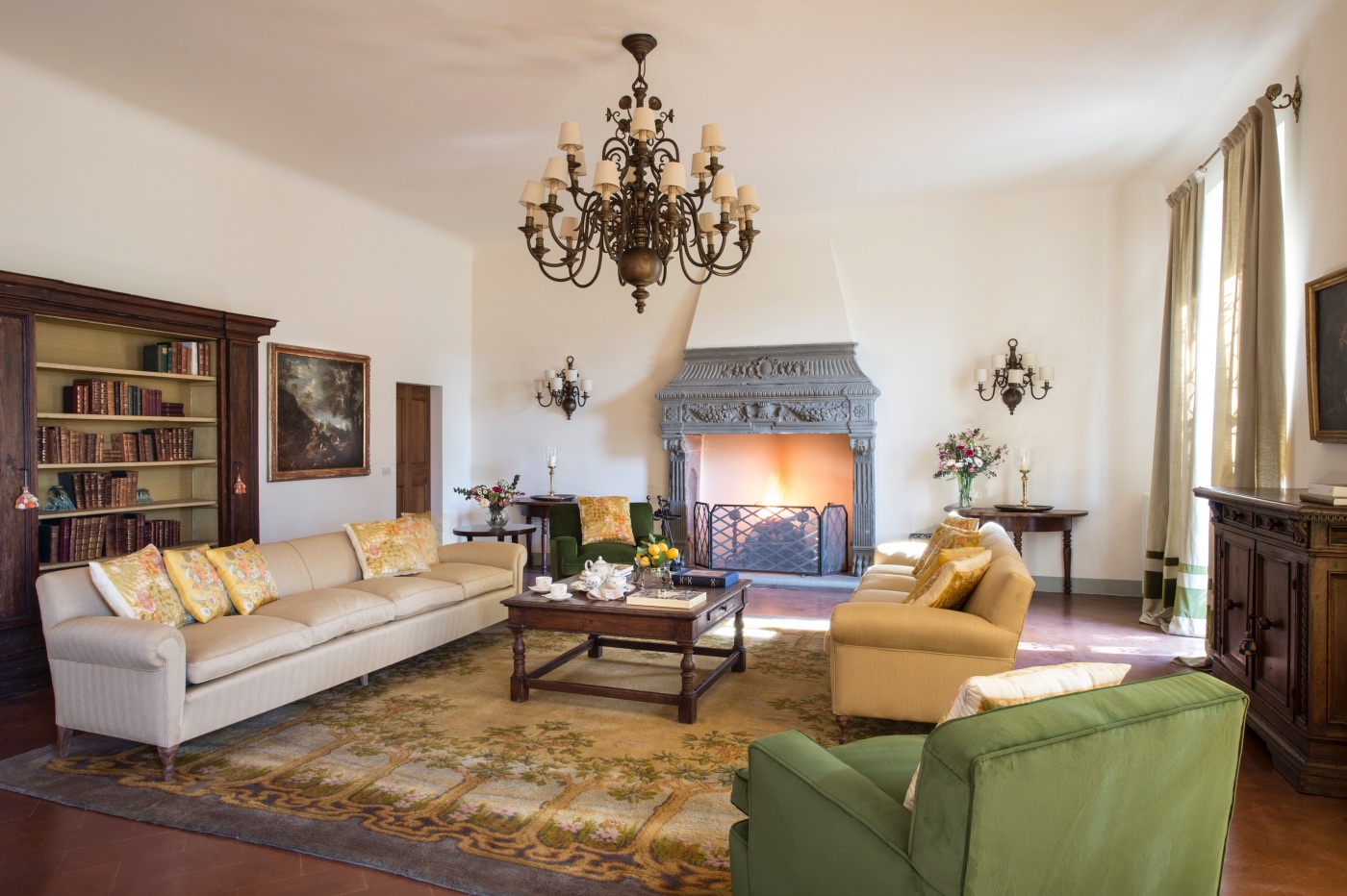 Ground Floor: The villa’s traditional décor is a mix of old and new, exquisitely selected from the owner’s family heirlooms. The elegant dining room, with a long table seating up to 12 and comfortable upholstered chairs, is perfect for formal dinners and opens onto a panoramic terrace. The adjacent spacious living room features ample seating and a romantic fireplace, while the large breakfast room has warm wood paneling, a red brick wall, and an open-hearth fireplace for an intimate feel. The contemporary kitchen serves both the dining and breakfast rooms, with the caring villa staff preparing your breakfasts and dinners. A cozy sitting room with a TV and a library with a fireplace are also located on this floor, offering perfect areas to enjoy some alone time. Two guest bathrooms complete this floor.