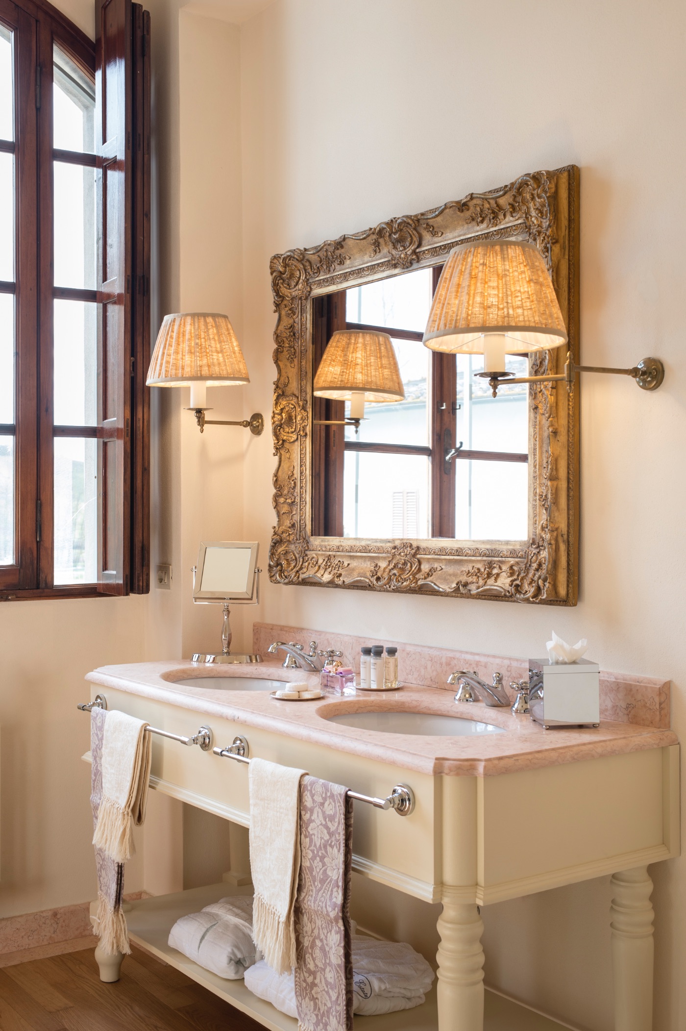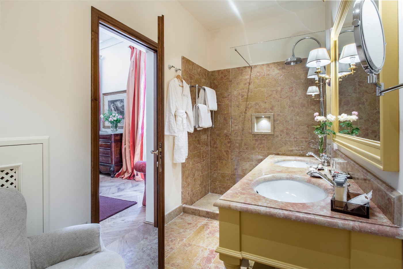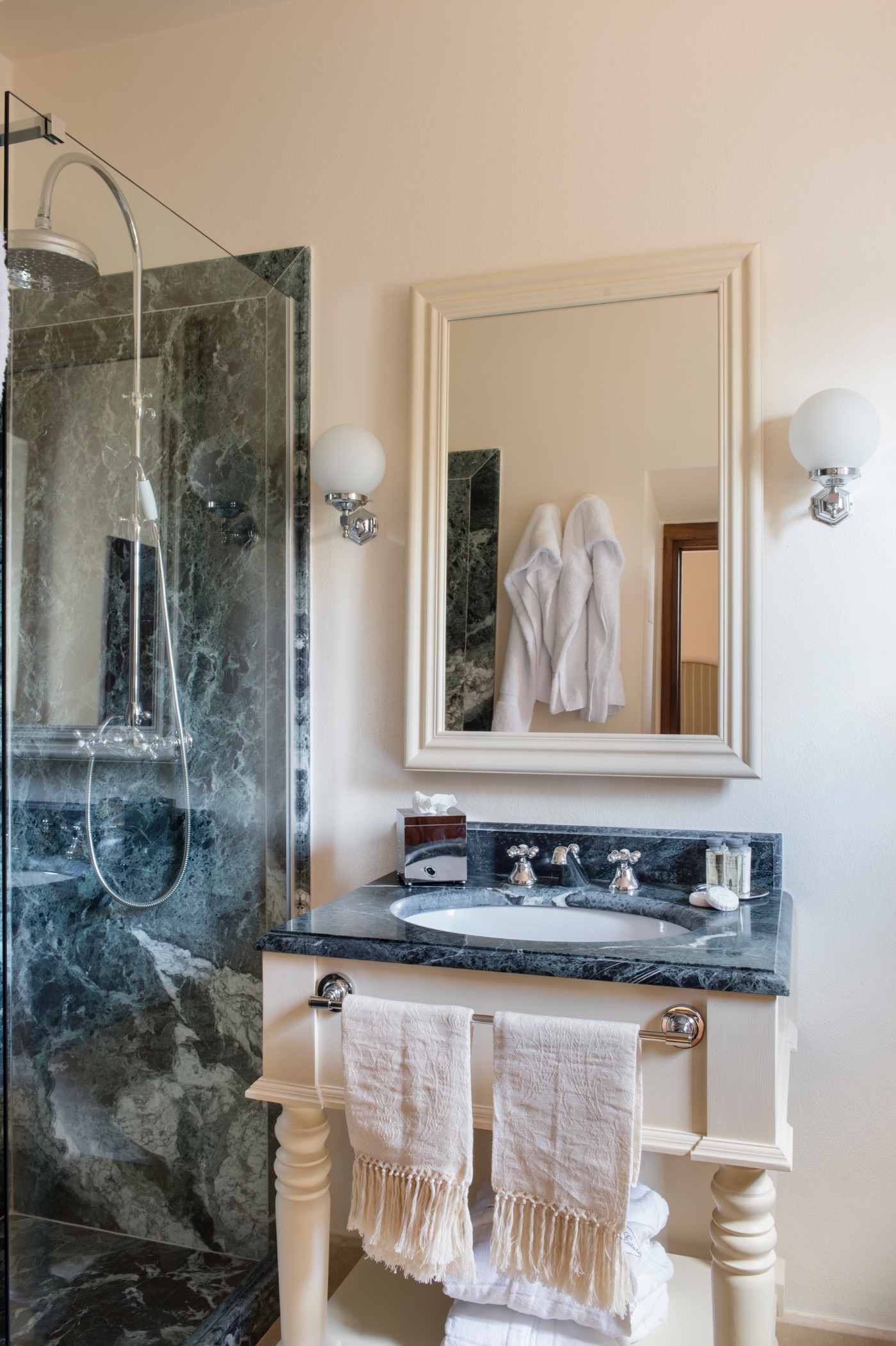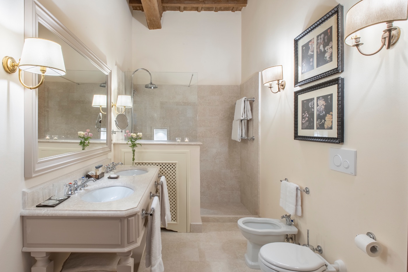 Ground Floor: The villa’s traditional décor is a mix of old and new, exquisitely selected from the owner’s family heirlooms. The elegant dining room, with a long table seating up to 12 and comfortable upholstered chairs, is perfect for formal dinners and opens onto a panoramic terrace. The adjacent spacious living room features ample seating and a romantic fireplace, while the large breakfast room has warm wood paneling, a red brick wall, and an open-hearth fireplace for an intimate feel. The contemporary kitchen serves both the dining and breakfast rooms, with the caring villa staff preparing your breakfasts and dinners. A cozy sitting room with a TV and a library with a fireplace are also located on this floor, offering perfect areas to enjoy some alone time. Two guest bathrooms complete this floor.