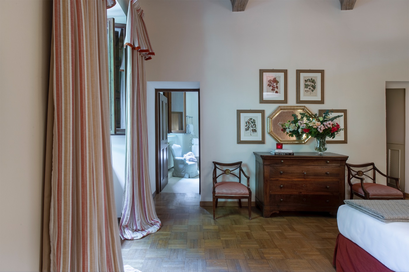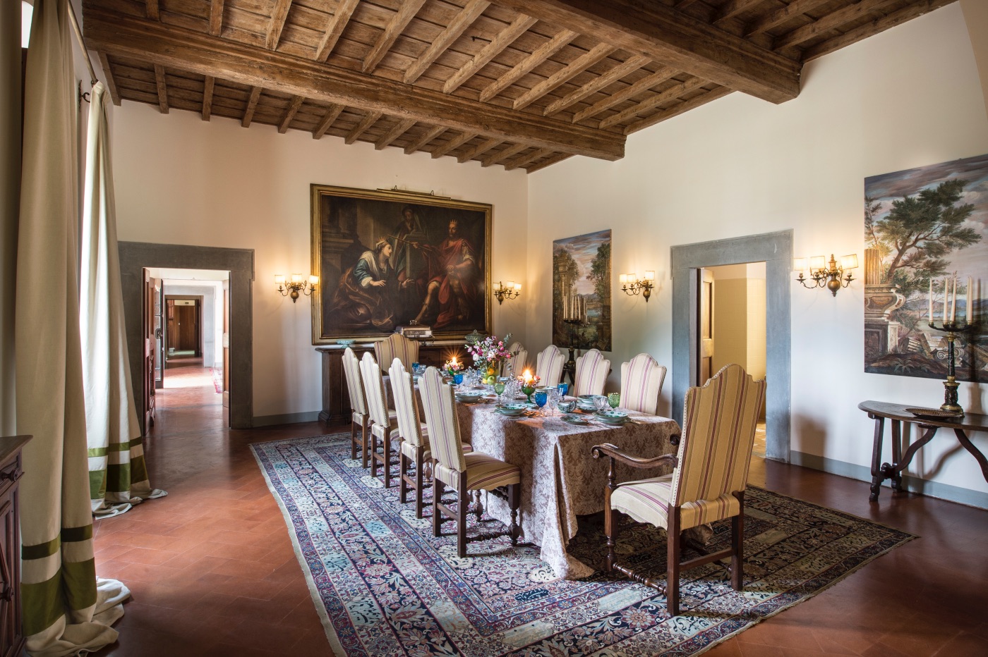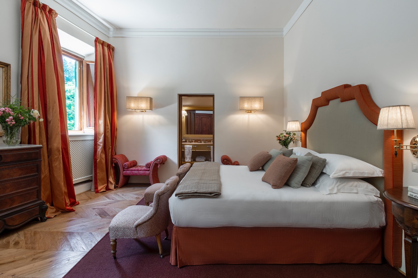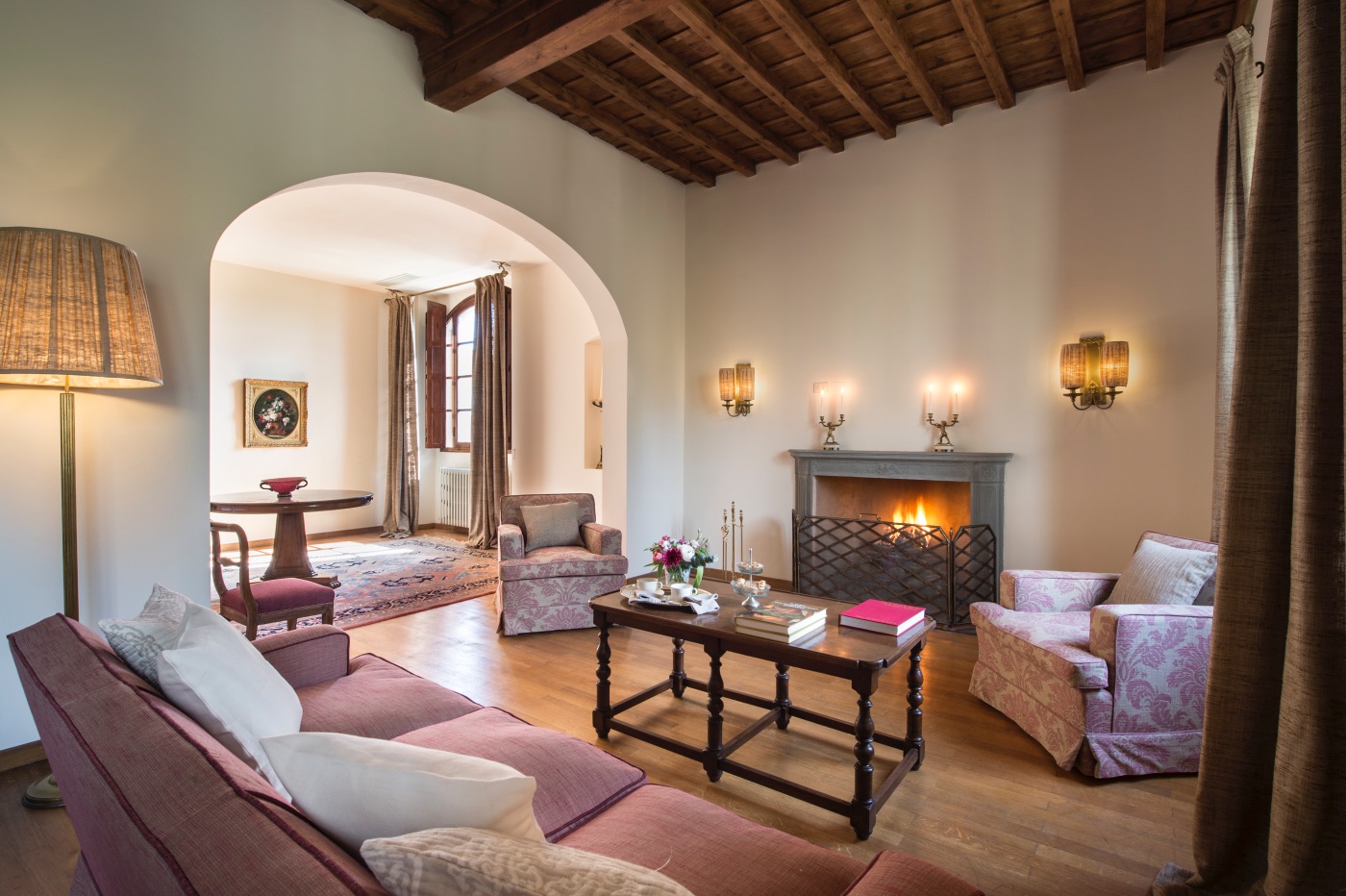 First Floor: The spacious sitting room with stunning frescoed walls provides a comfortable reading and relaxing spot, making it an ideal gathering place for a quiet conversation over a nightcap.
