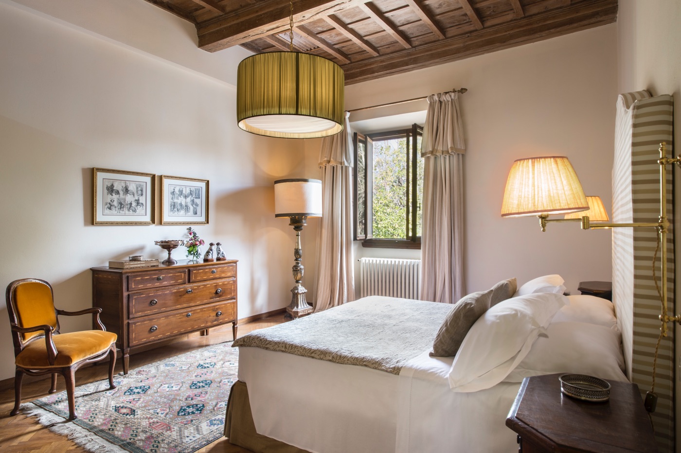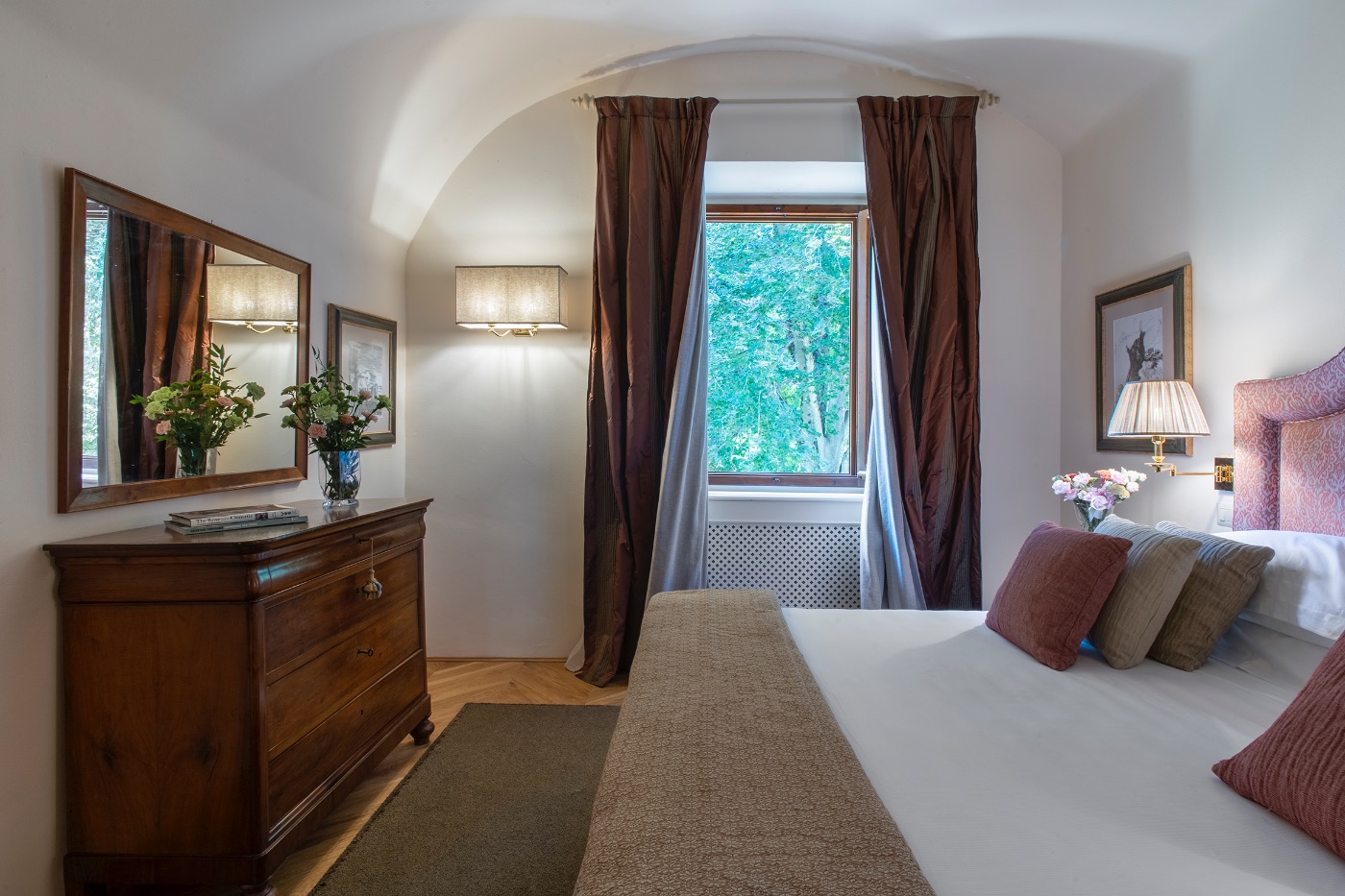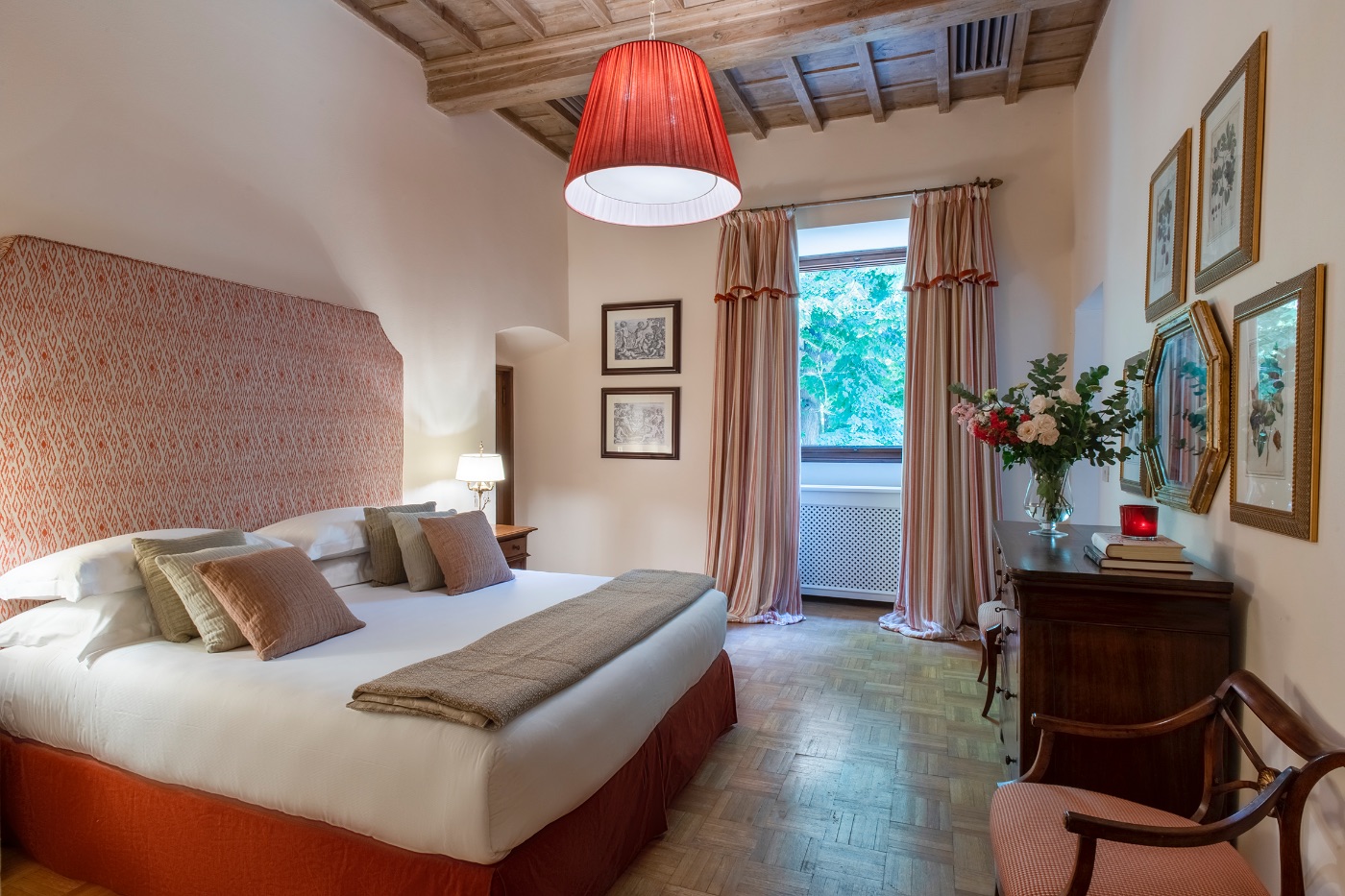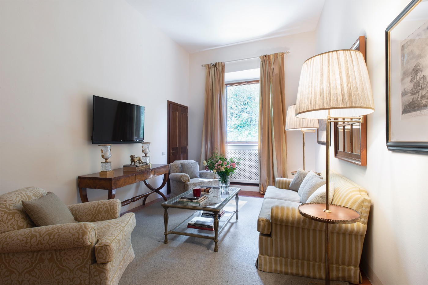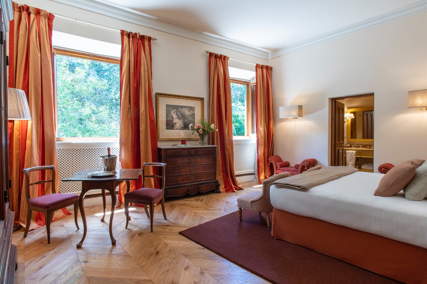 First Floor: The spacious sitting room with stunning frescoed walls provides a comfortable reading and relaxing spot, making it an ideal gathering place for a quiet conversation over a nightcap.
