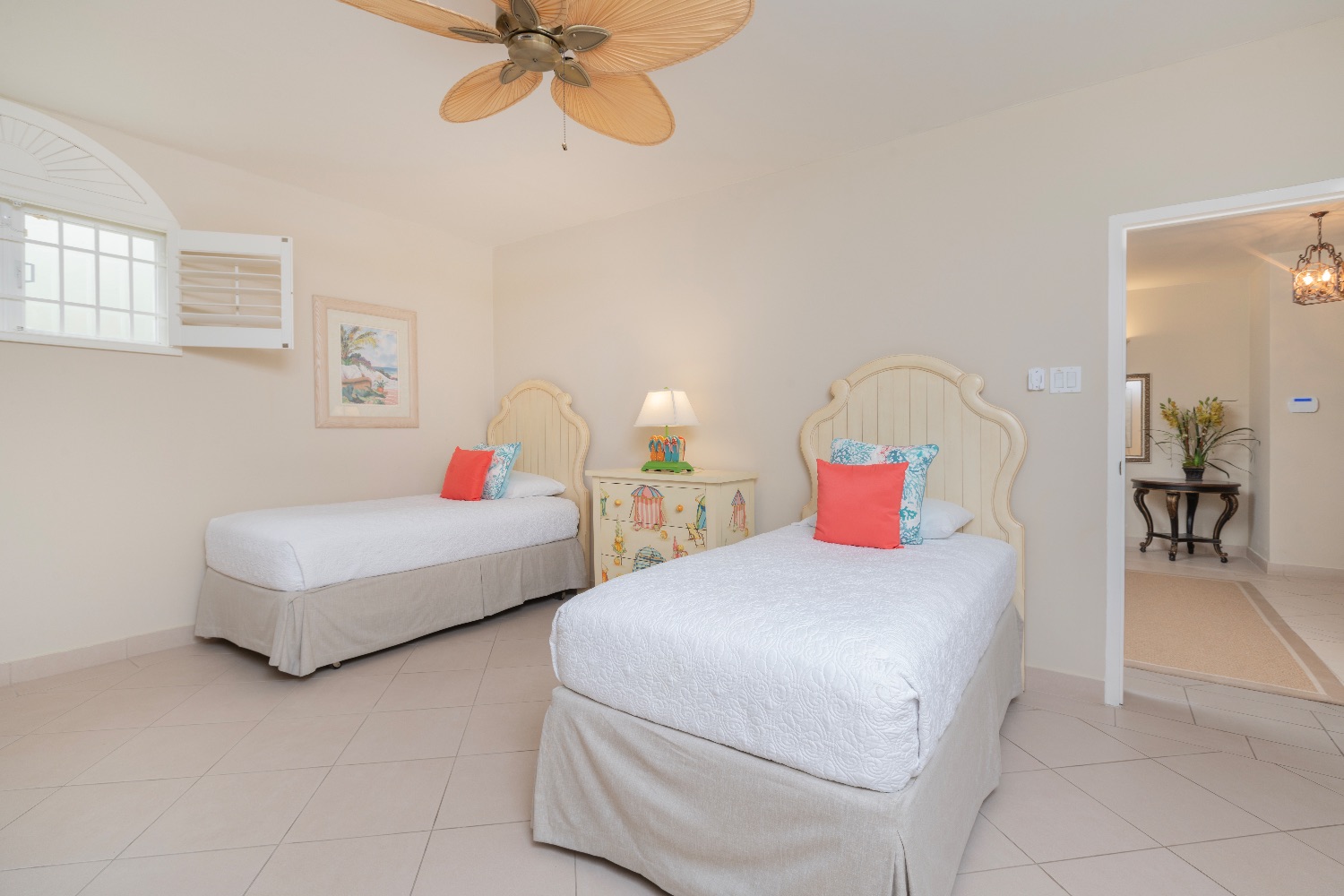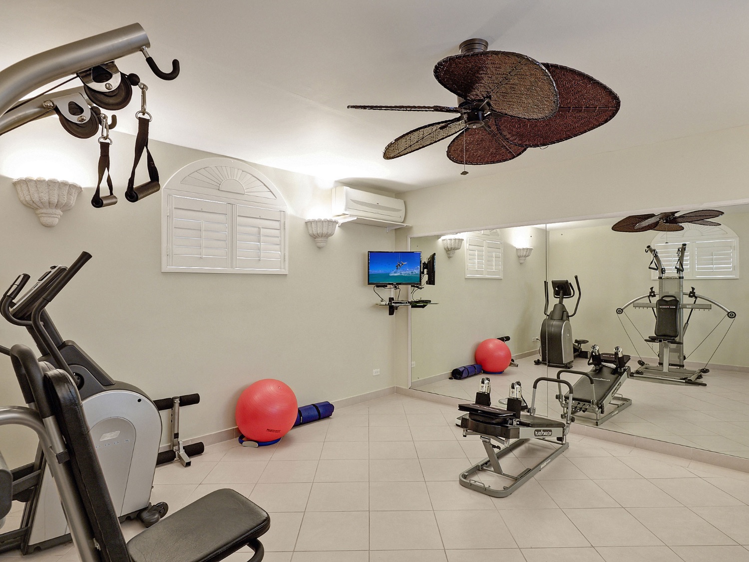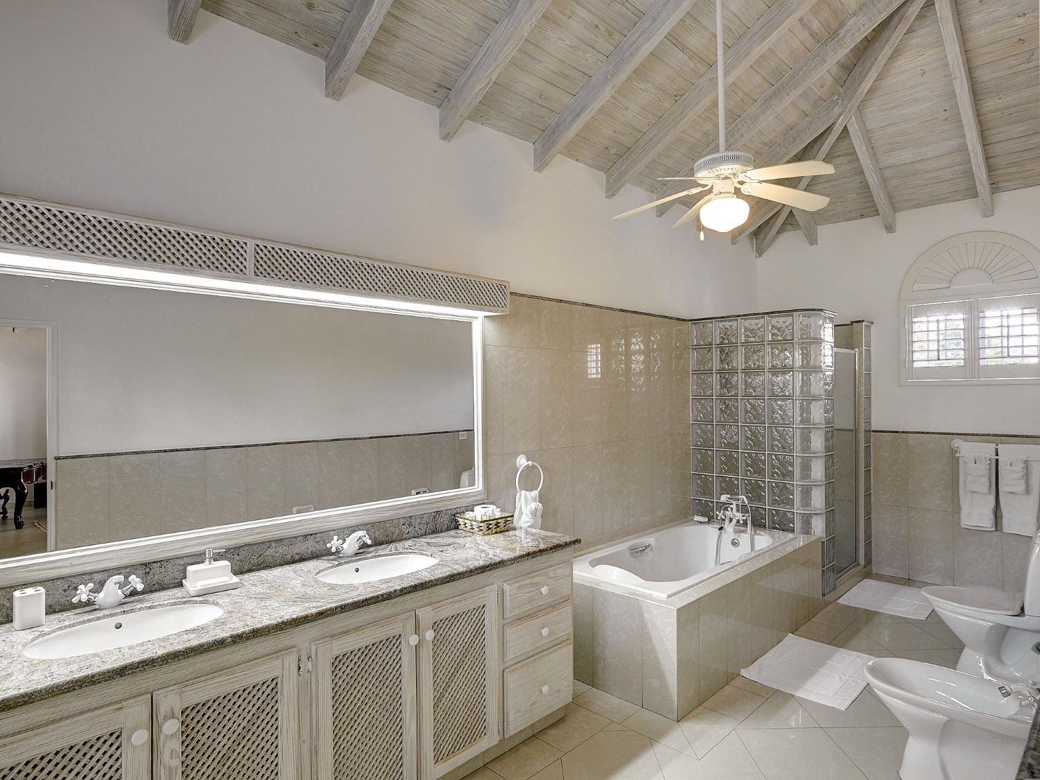 The design and decor of the villa emphasizes the airiness of the Caribbean location, and the mahogany furniture, pale palette, and English Baroque furnishings all enhance the overall experience in each room. There are nine bedrooms on the premises with accommodations for up to 18 visitors. Each bedroom has a luxury en suite bathroom, and they are distributed over the three levels of this elegant and tranquil villa.