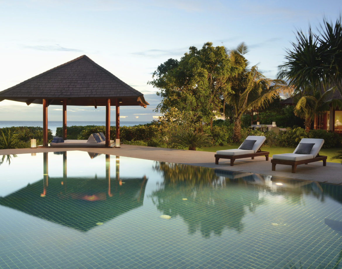 Every single villa features seamless indoor-outdoor living spaces arranged around a pool, including living and dining pavilion, outdoor lounge and kitchen.