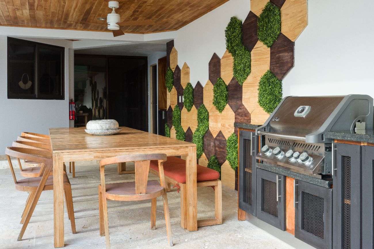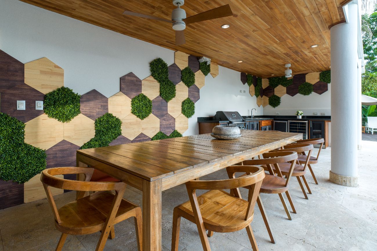 Design: Light-filled open living/dining/kitchen under soaring teak ceilings; seamless indoor–outdoor flow.