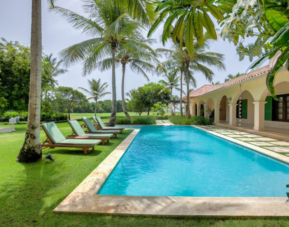 Nestled among mature palms in the peaceful Arrecife enclave, the villa’s only background noise is that of birds and leaves rather than nearby residents. Walking barefoot on the covered terrace in the morning as the pool comes to life, you drift between the lounger and the water by midday, stopping for a long, leisurely lunch under deep shade. In the evening, the lawns are illuminated, the garden is warmed by the aroma of the grill, and the sky turns indigo over a scene that is completely private. It’s a unique address among Punta Cana villas that can serve as a destination unto itself—a home that moves at your speed and conceals the inconveniences of travel.