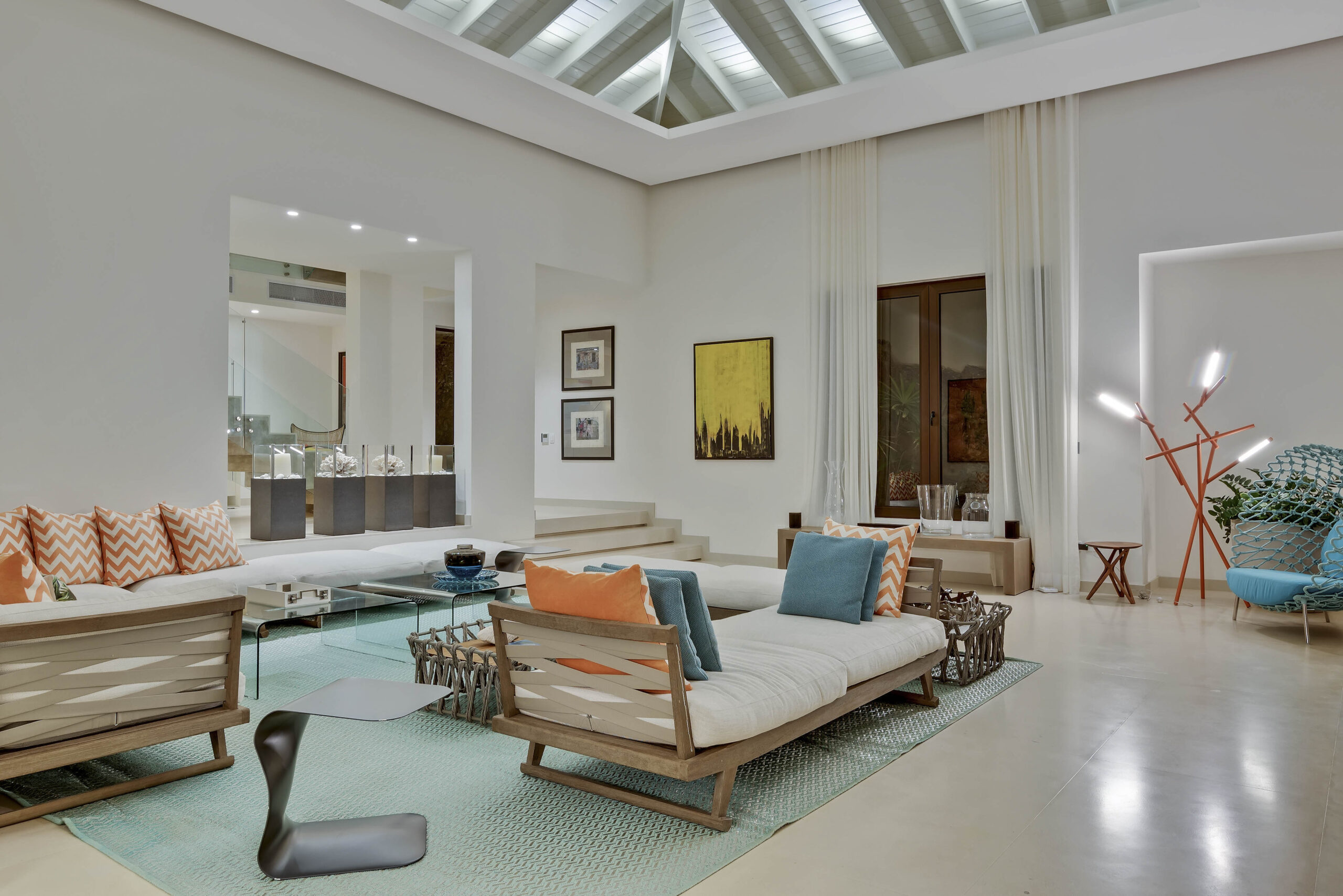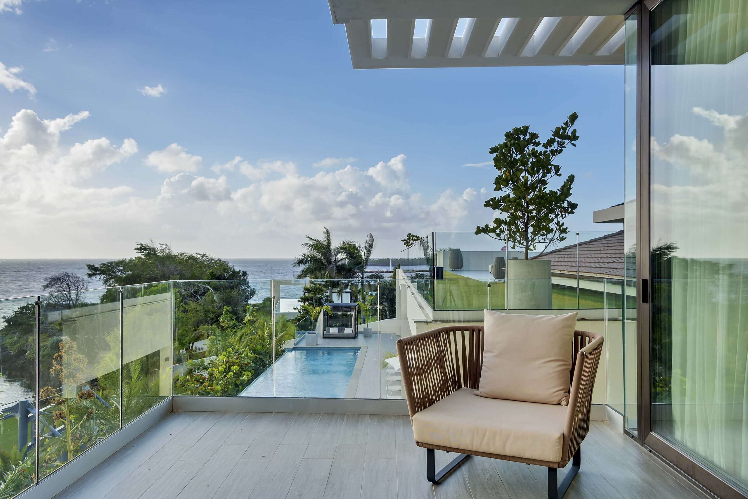 Arrecife Beach House makes an impression right away. The Caribbean is framed in crystal blue hues by a wall of floor-to-ceiling glass when you push open the grand front door. Sunlight floods the Persian marble floors, giving the villa’s well-designed interiors and simple architectural lines a gentle sheen. With deep sofas facing the horizon, the main living area blends comfort and color—warm greens, oranges, and turquoise—making sunsets a regular part of the evening routine.