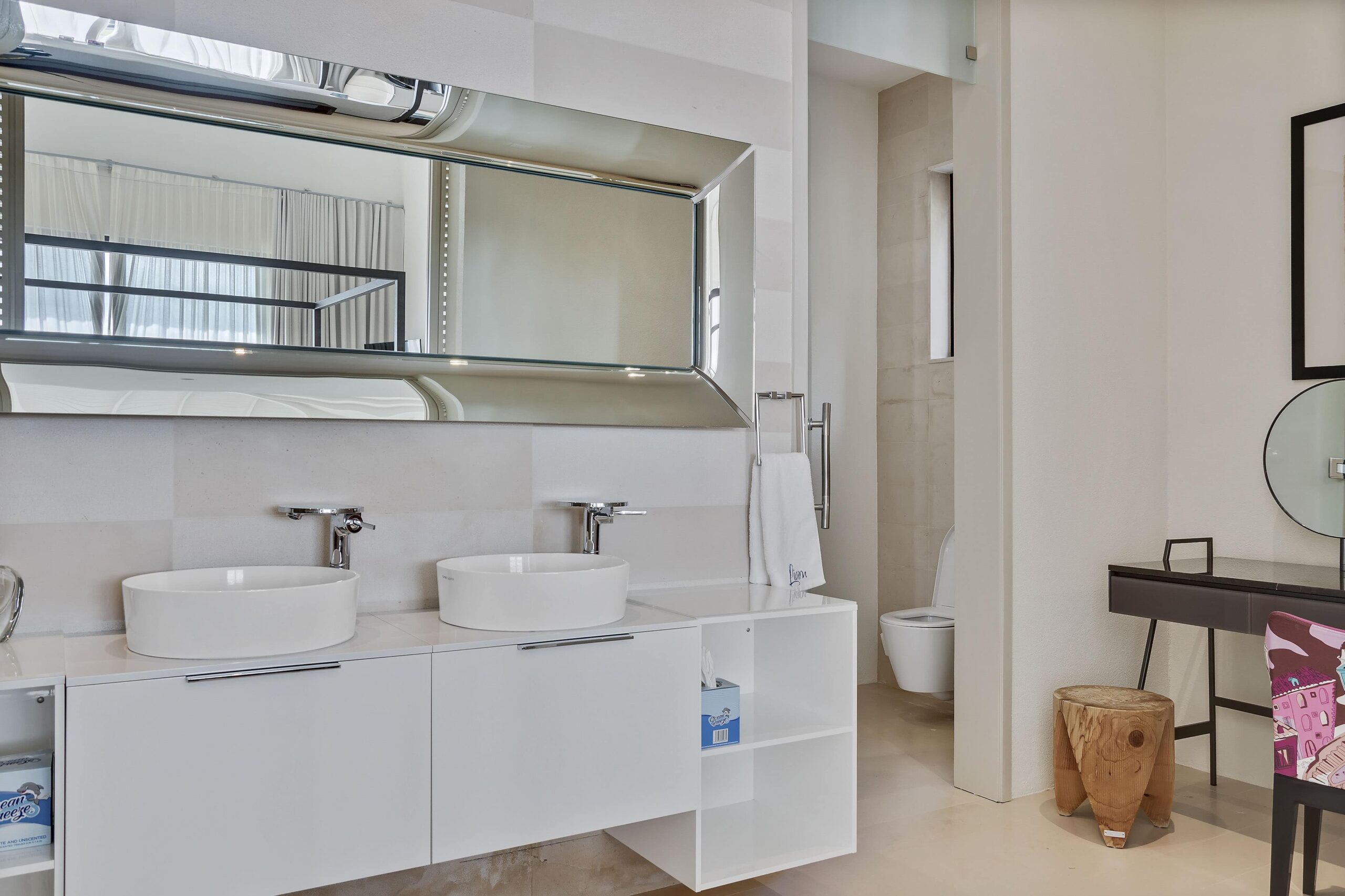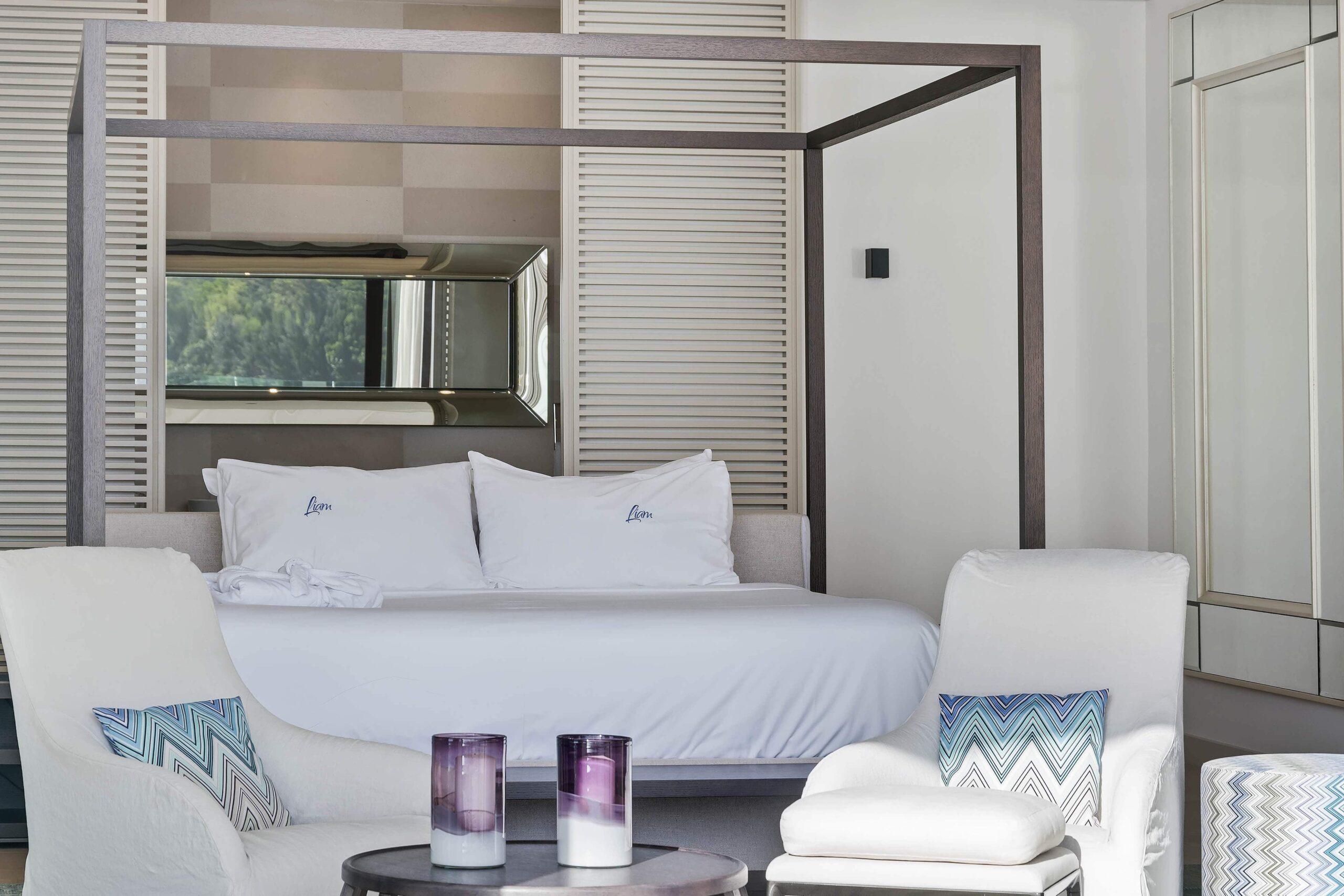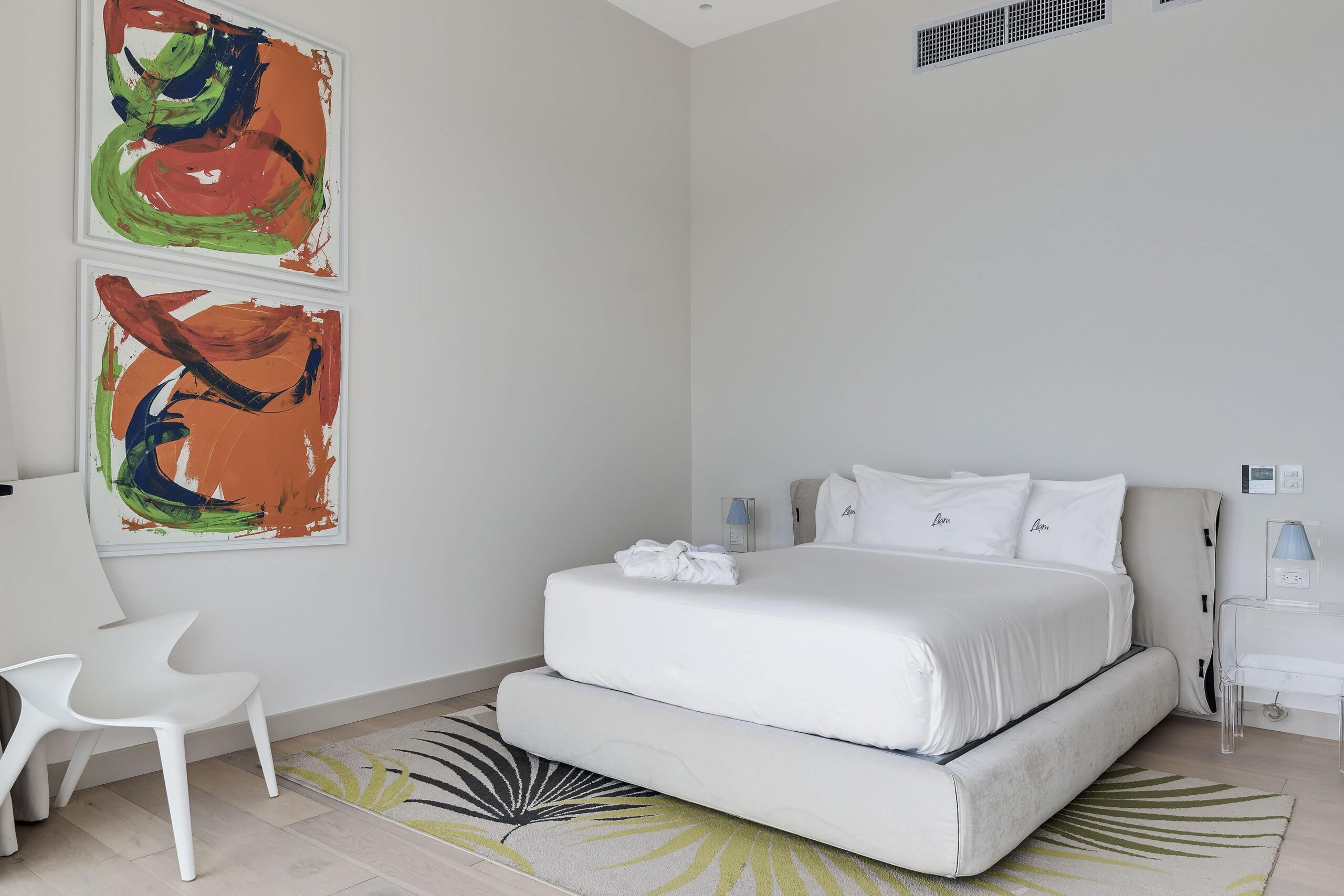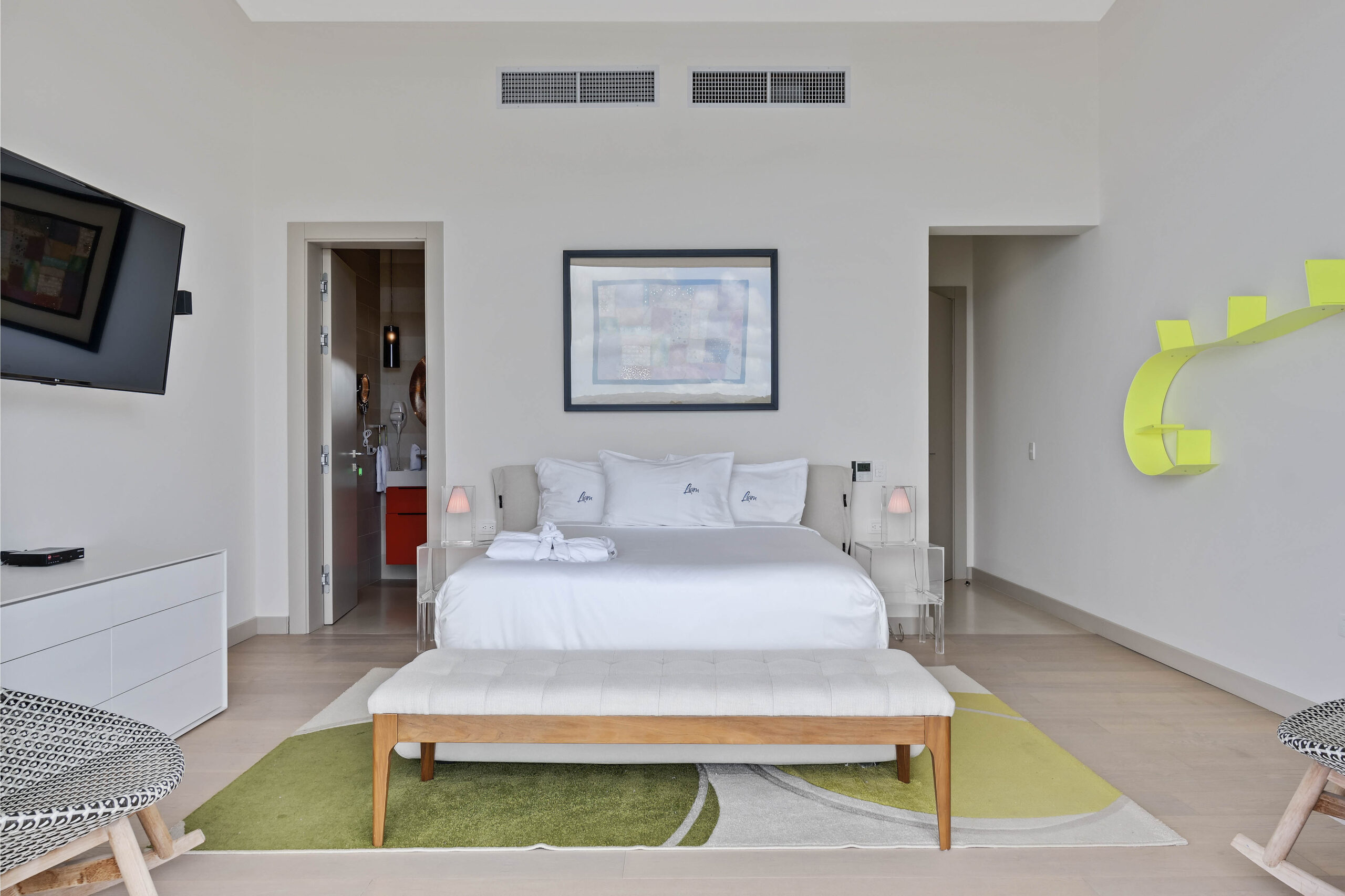 Arrecife Beach House enjoys its picturesque location overlooking Playa Morón outside. With daybeds and loungers scattered across stone and soft grass, a shimmering infinity pool seems to overflow into the sea. One by the pool for short cool-downs and another, dramatically cantilevered over the water on transparent glass—a surreal soak with aquamarine depths visible beneath your feet—are two eye-catching jacuzzis that invite contrast and play. The villa’s full bar and BBQ ensure a laid-back evening with grilled local lobster, crisp salads, clinking glasses, and constellations above. As twilight approaches, gather at the circular 12-seater alfresco table.