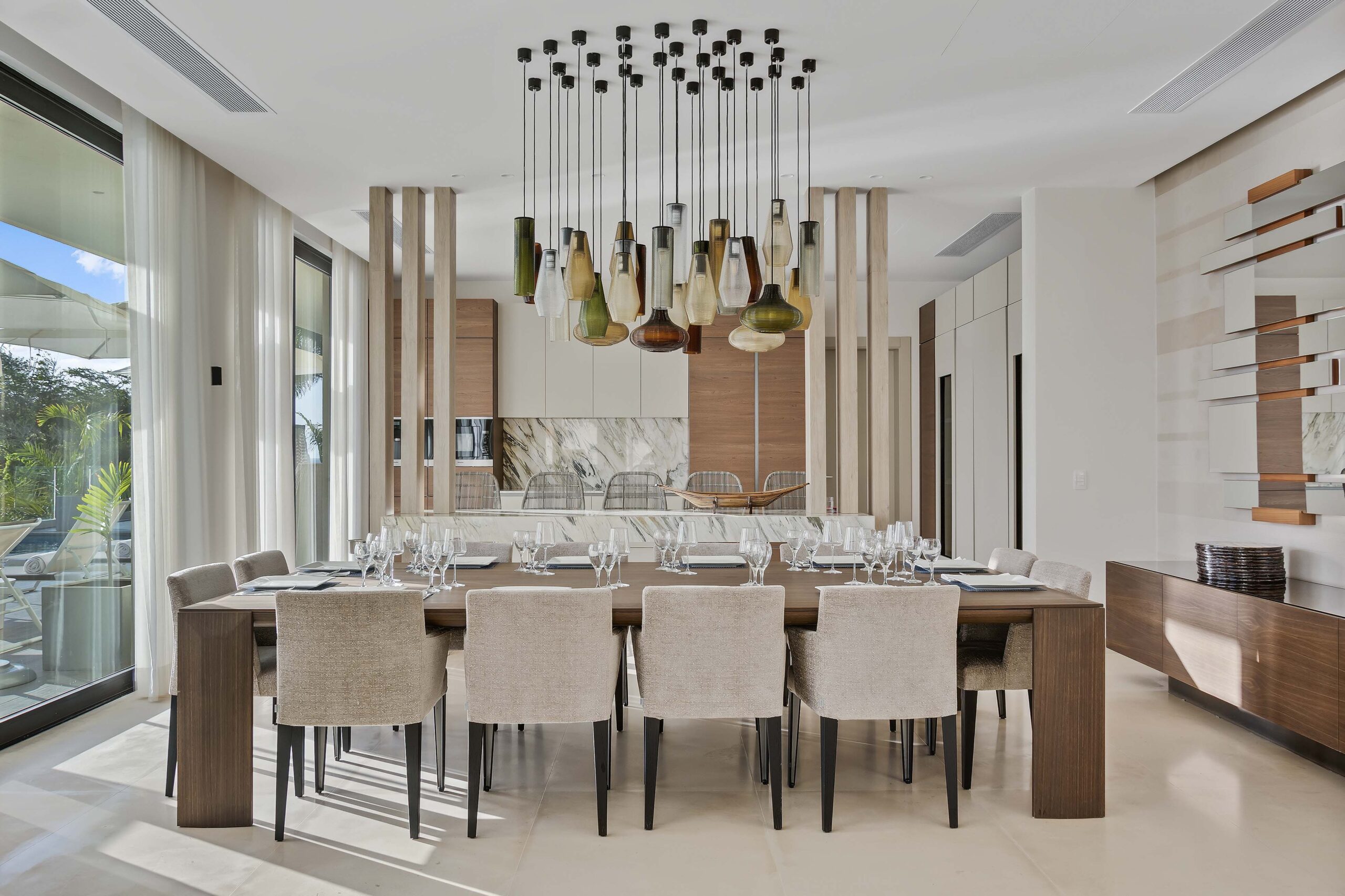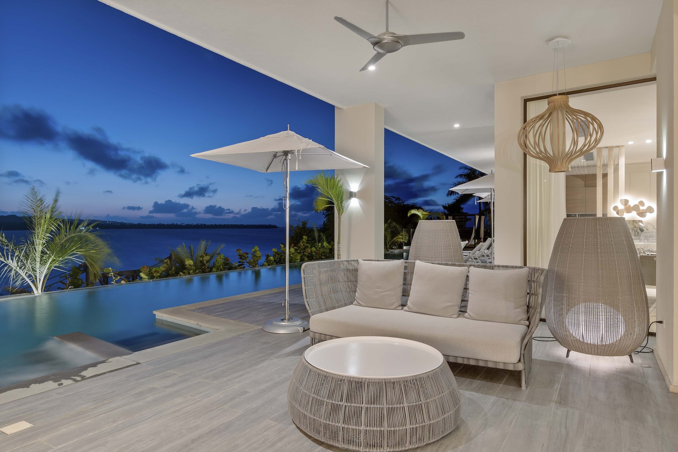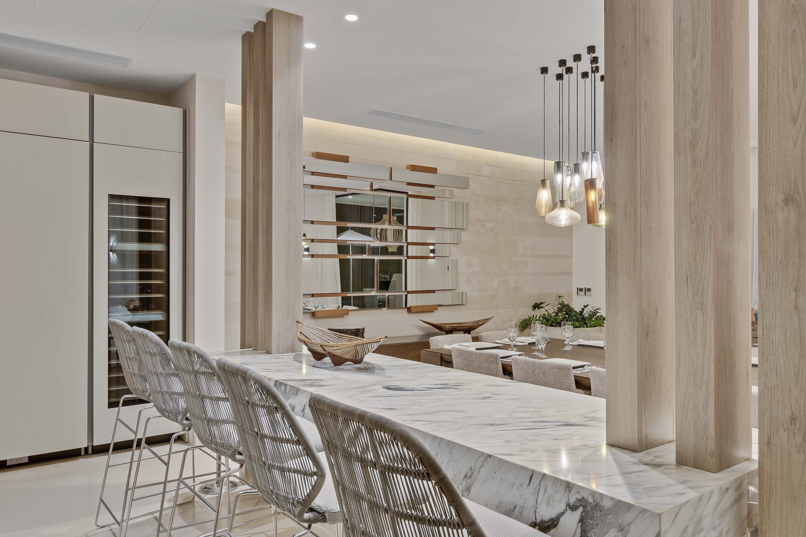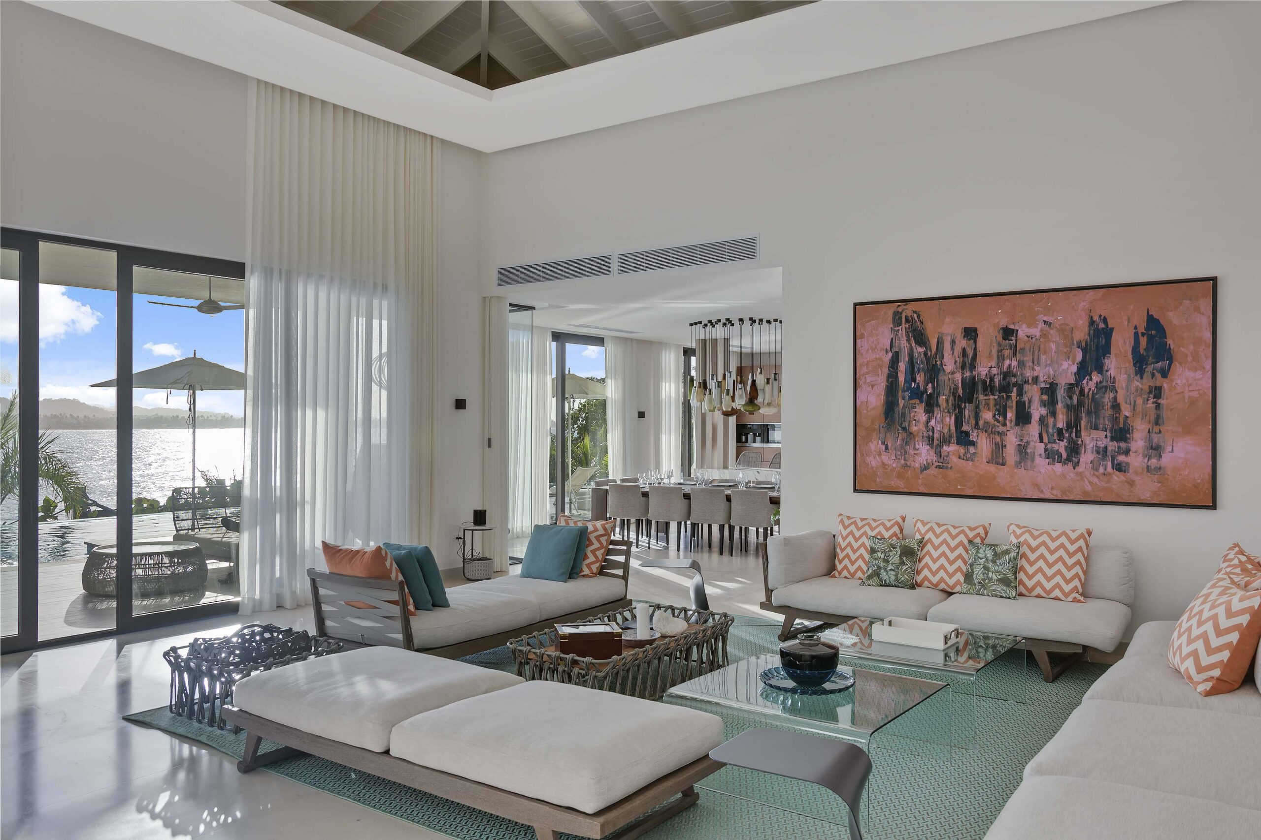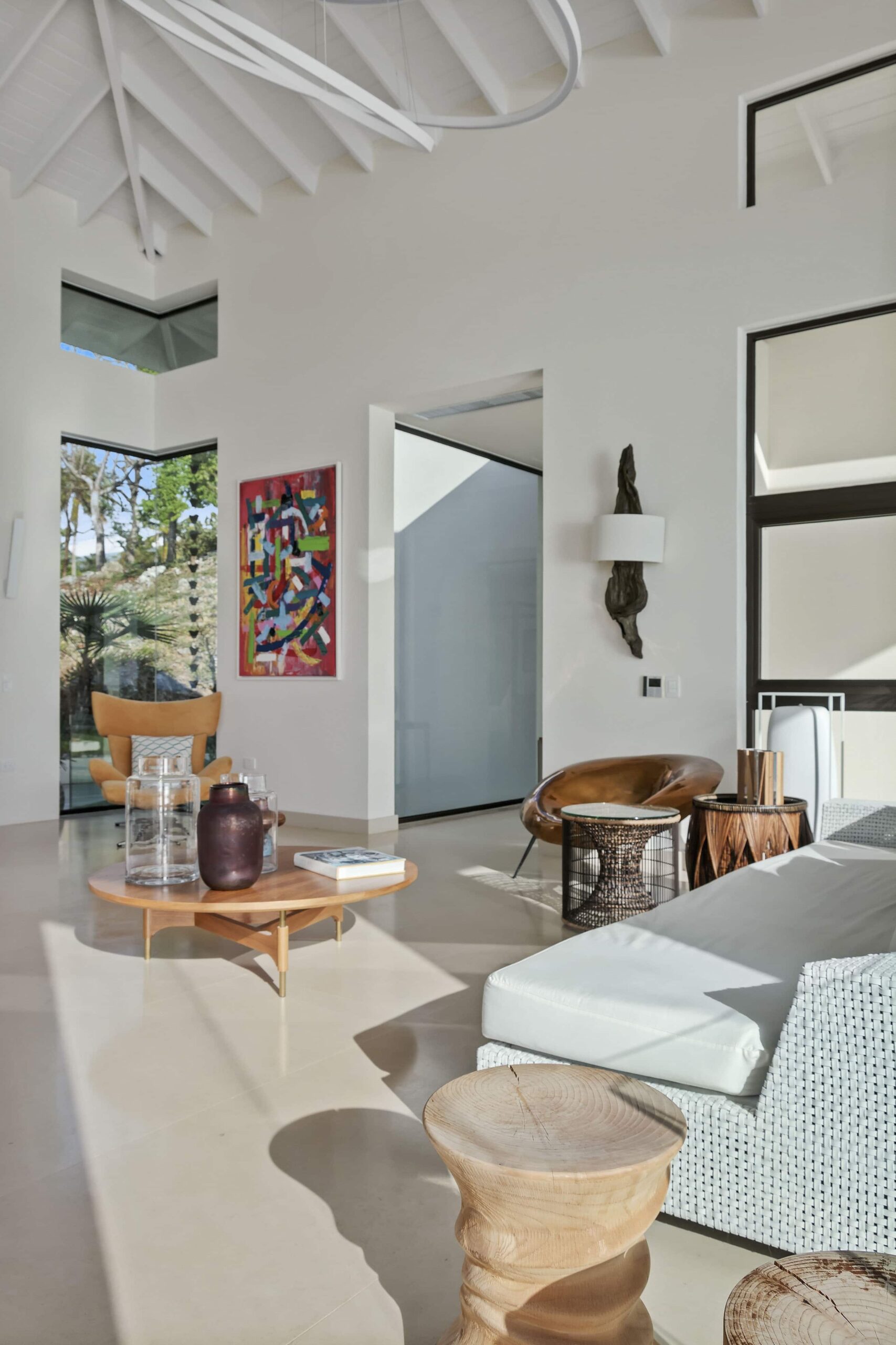 The open-concept layout of the villa facilitates easy social interaction. Through wide glass sliders, indoor and outdoor spaces flow together seamlessly, keeping the sea nearby and the airy. The group can spread out across several lounge areas, with friends sharing stories around the bar, children splashing in the pool, and a lone reader on the shaded terrace. When it’s time to reorganize, everyone congregates in the great room for cocktail hour, which is always accompanied by a breathtaking view of the ocean and sky.