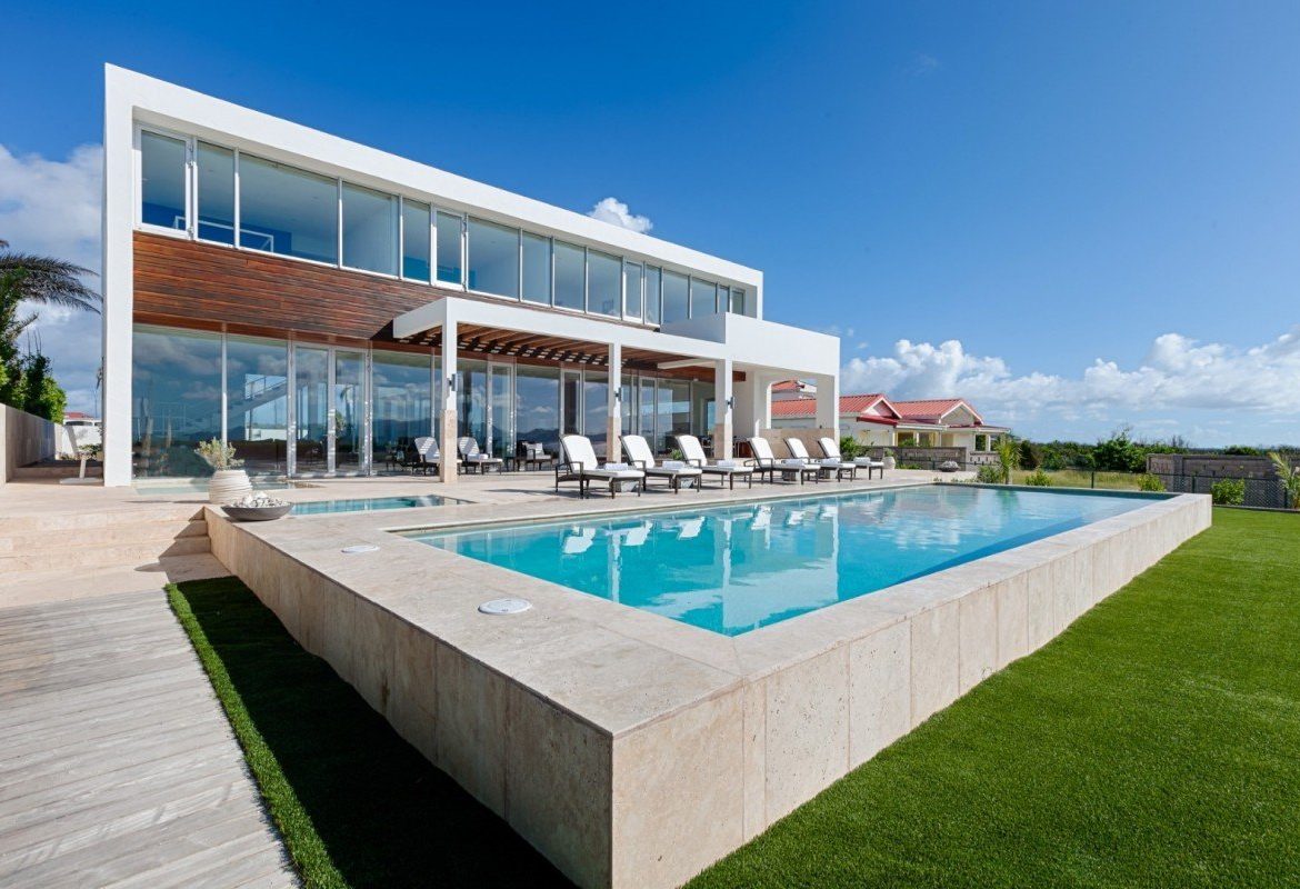 With expansive windows and stunning views of the Caribbean and mountains of St. Martin, guests experience exhilarating indoor/outdoor living. The two-story villa offers 5 bedrooms, a private pool, and a deck overlooking the shimmering Caribbean sea.