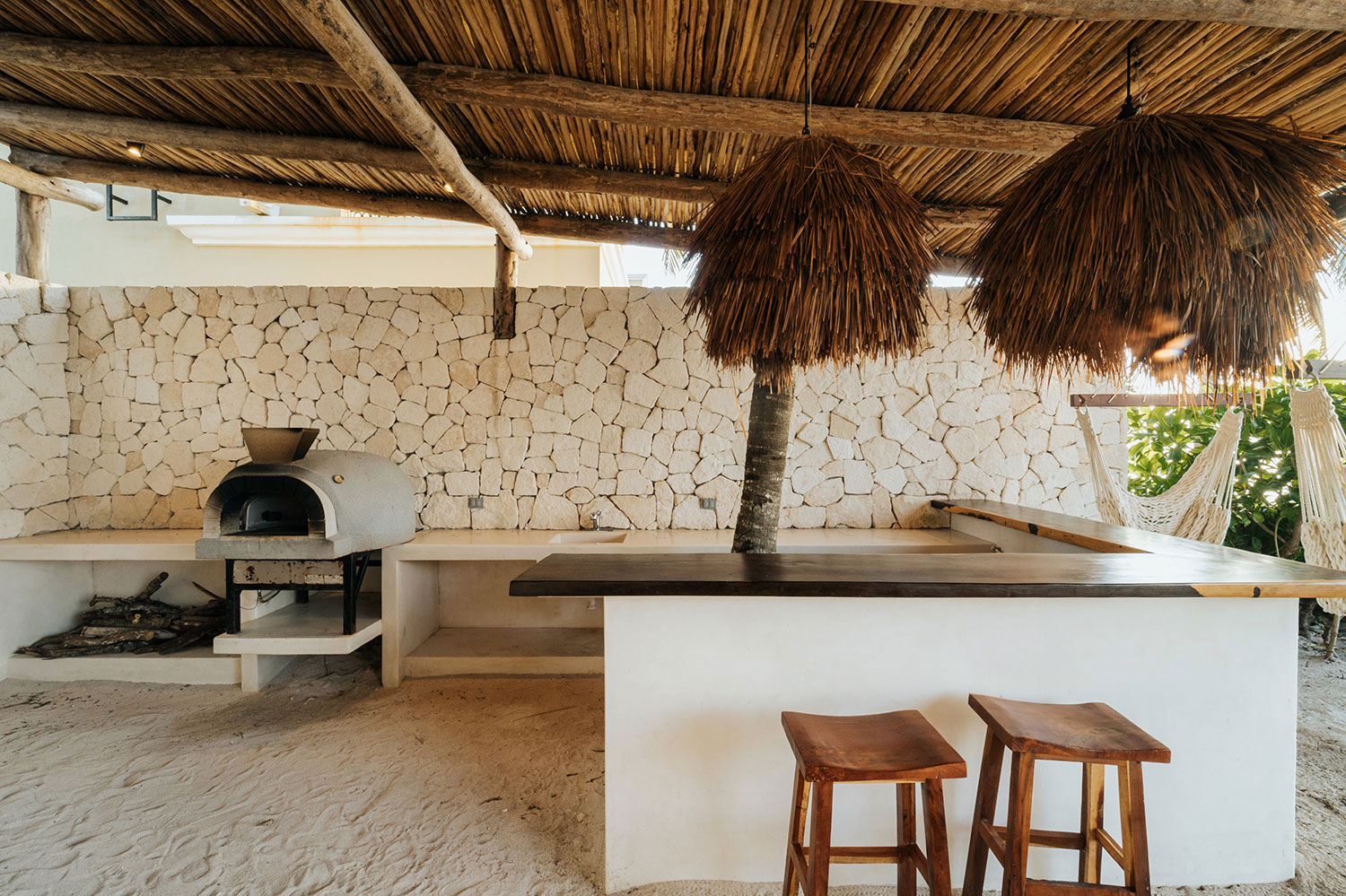The residence’s interiors bring in the sandy tone of the surroundings and combine it with elevated comforts, ranging from delightful living spaces to a bar and lounge equipped with a wine chiller. Every bedroom has an ensuite bathroom, while the ones on the second floor boast sea-facing balconies with hammocks ideal for spending laid-back afternoons.