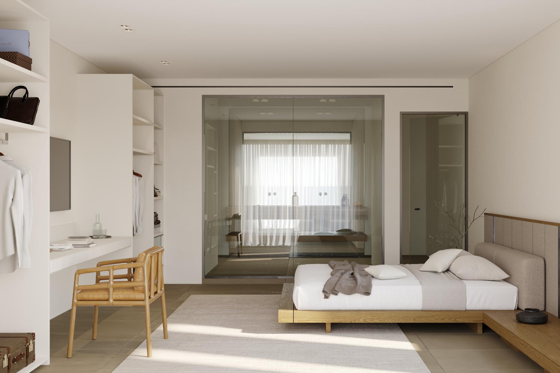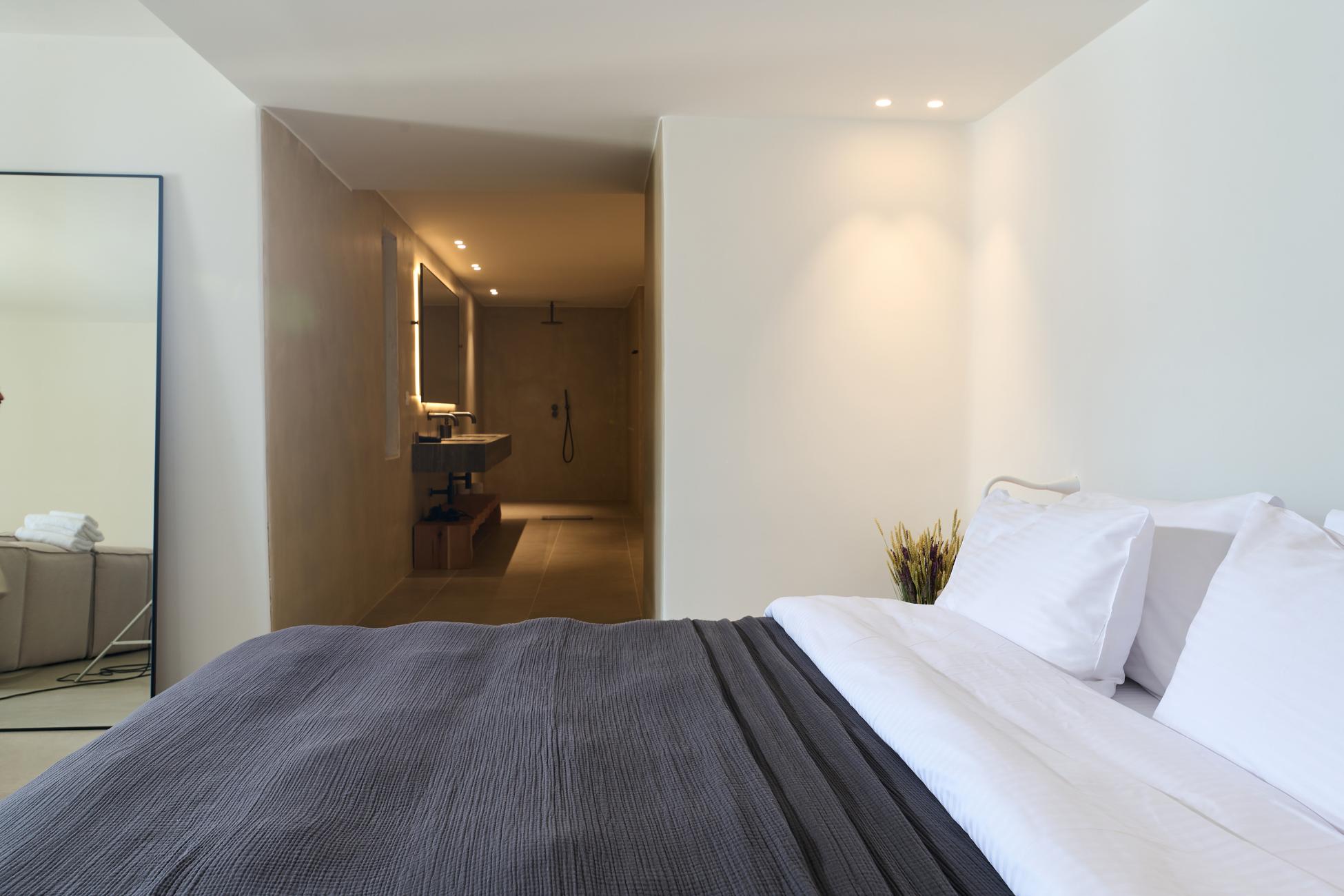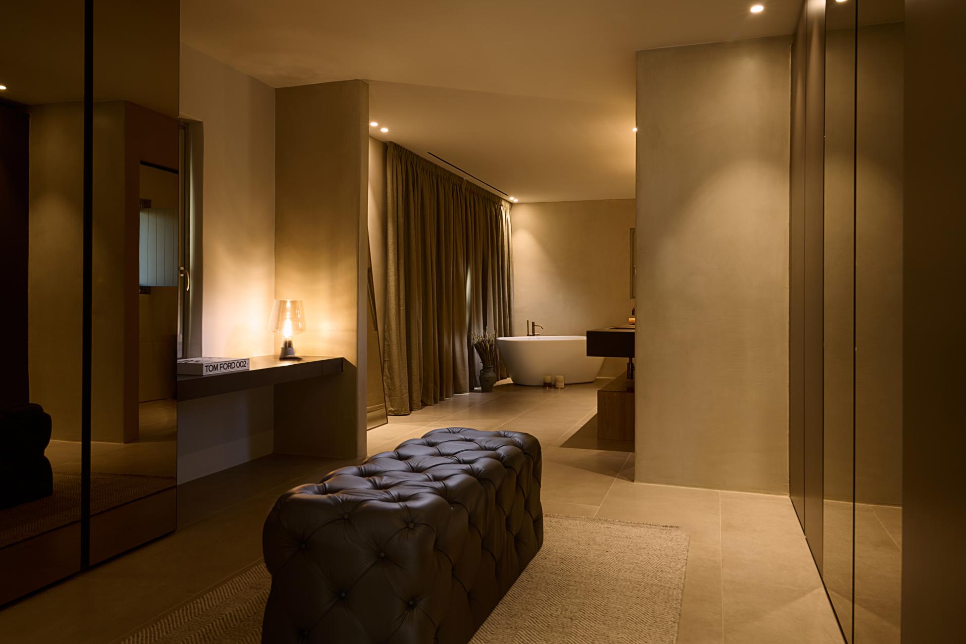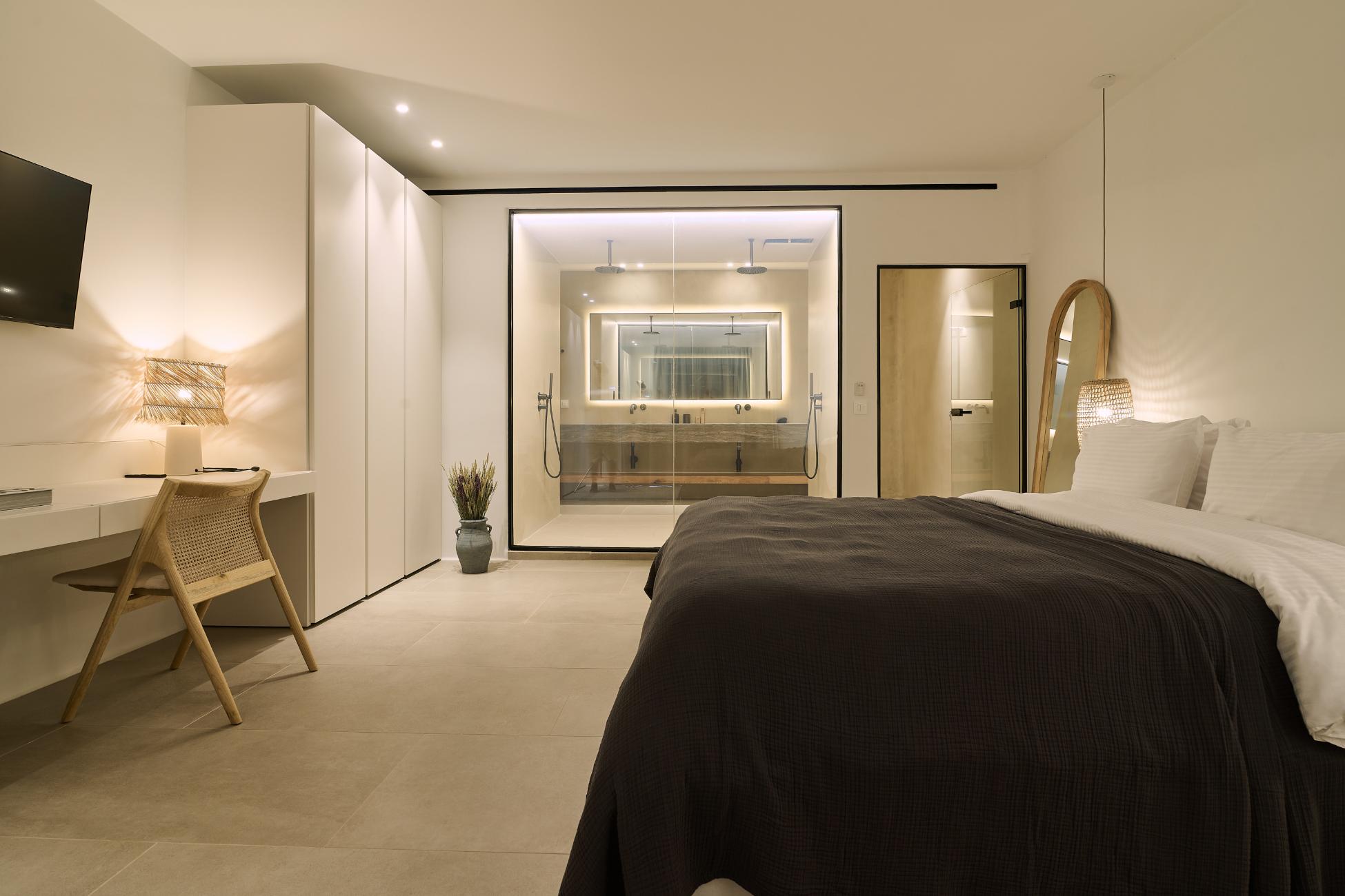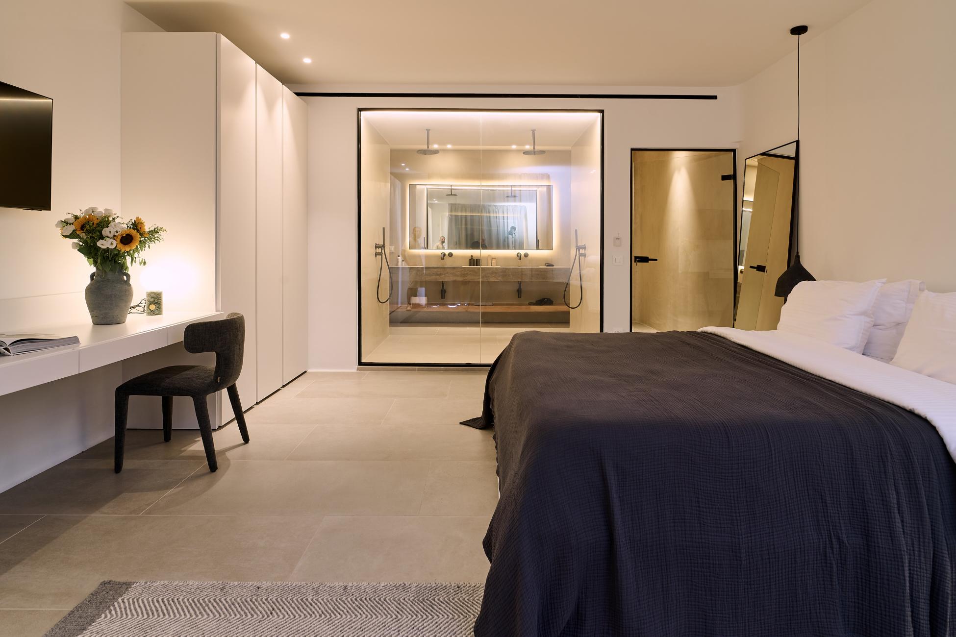 The upper level is reserved for the master suite, a true retreat within the retreat. A king-size bed faces wide windows and balcony doors that draw the horizon into the room, while a boudoir corner and lounge area create a calm rhythm between rest and reflection. The open-plan ensuite bathroom is generous and indulgent, with a double sink, walk-in shower, and a bathtub positioned to soak in both sea and pool views. A walk-in closet, in-room safe, TV, and full air-conditioning complete a space designed for long, unhurried mornings.