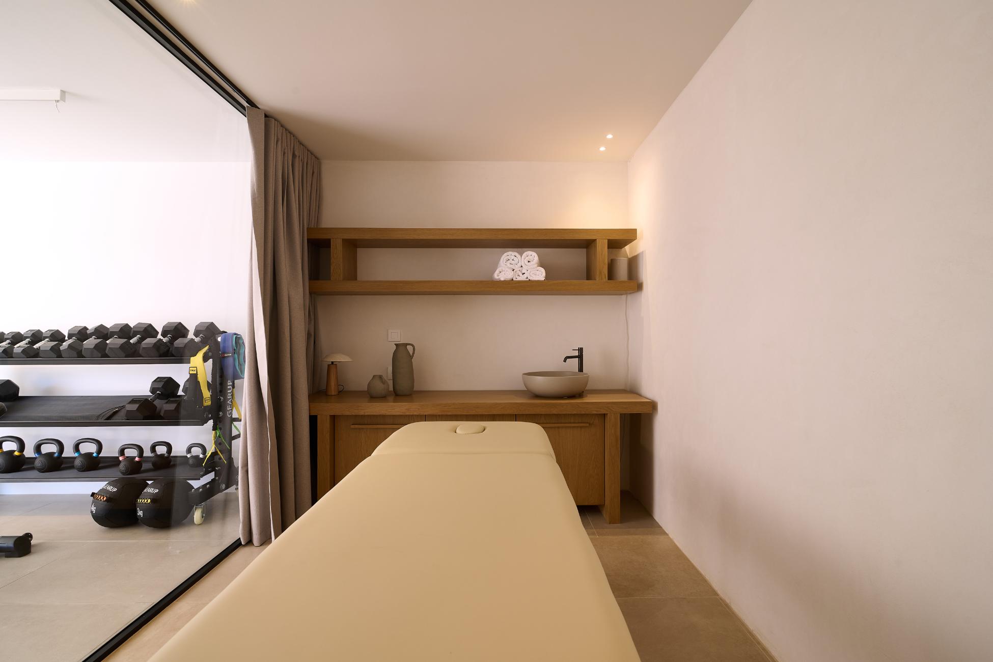 Below, at pool level, the villa reveals its full scale. A spacious open-plan living area with TV connects to an indoor dining space for up to fourteen guests, a sleek wine bar with cooler and high stools, and a secondary kitchenette. Wellness is woven into daily life here with a fully equipped gym and a separate massage room, while a professional-grade kitchen supports private chefs and events with ease.