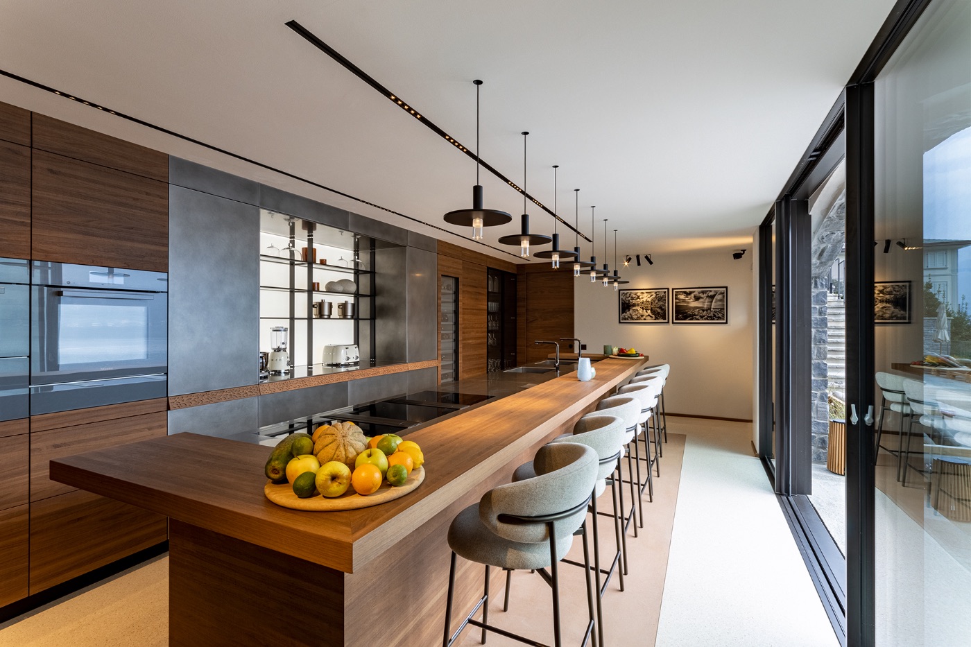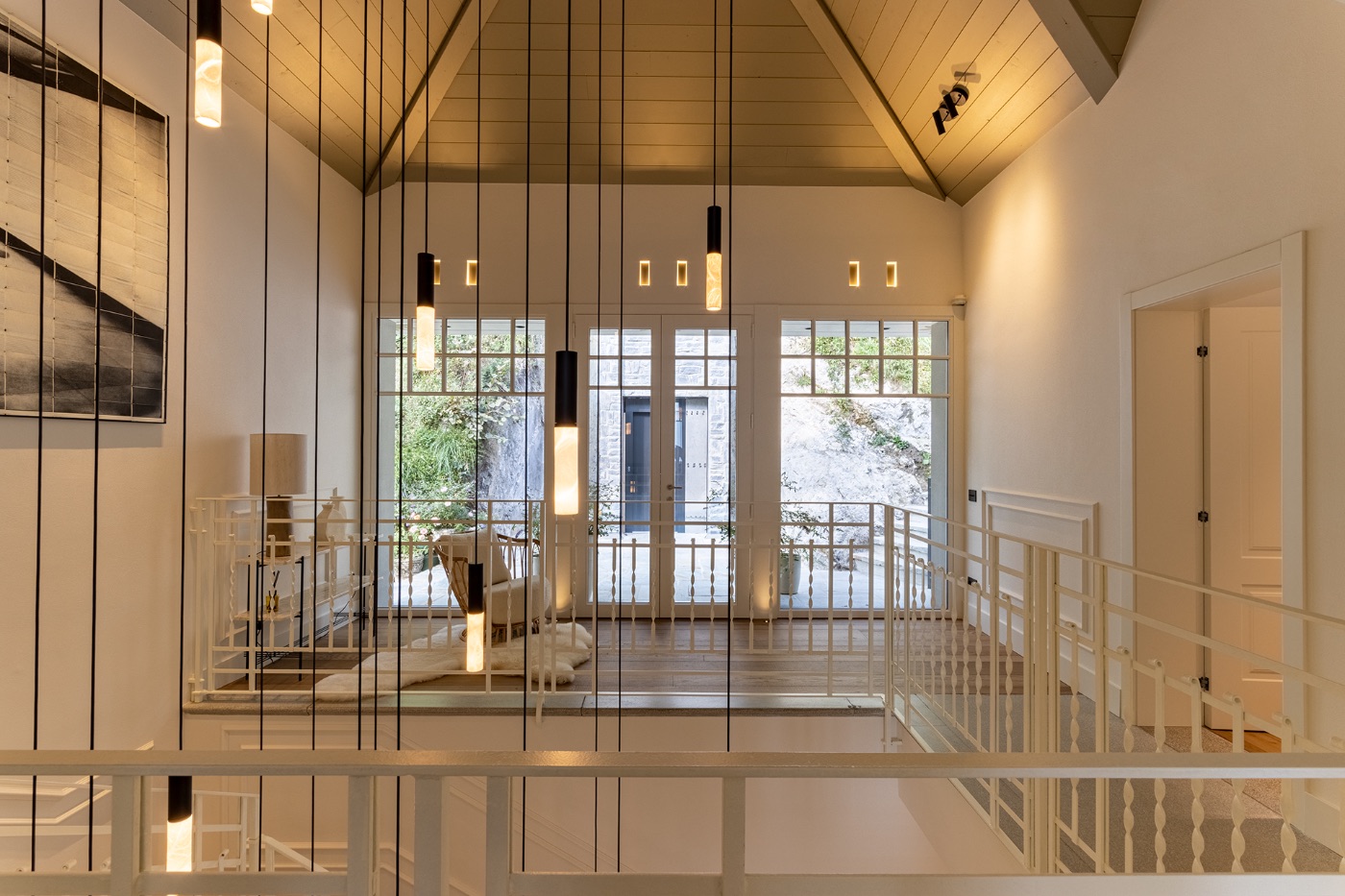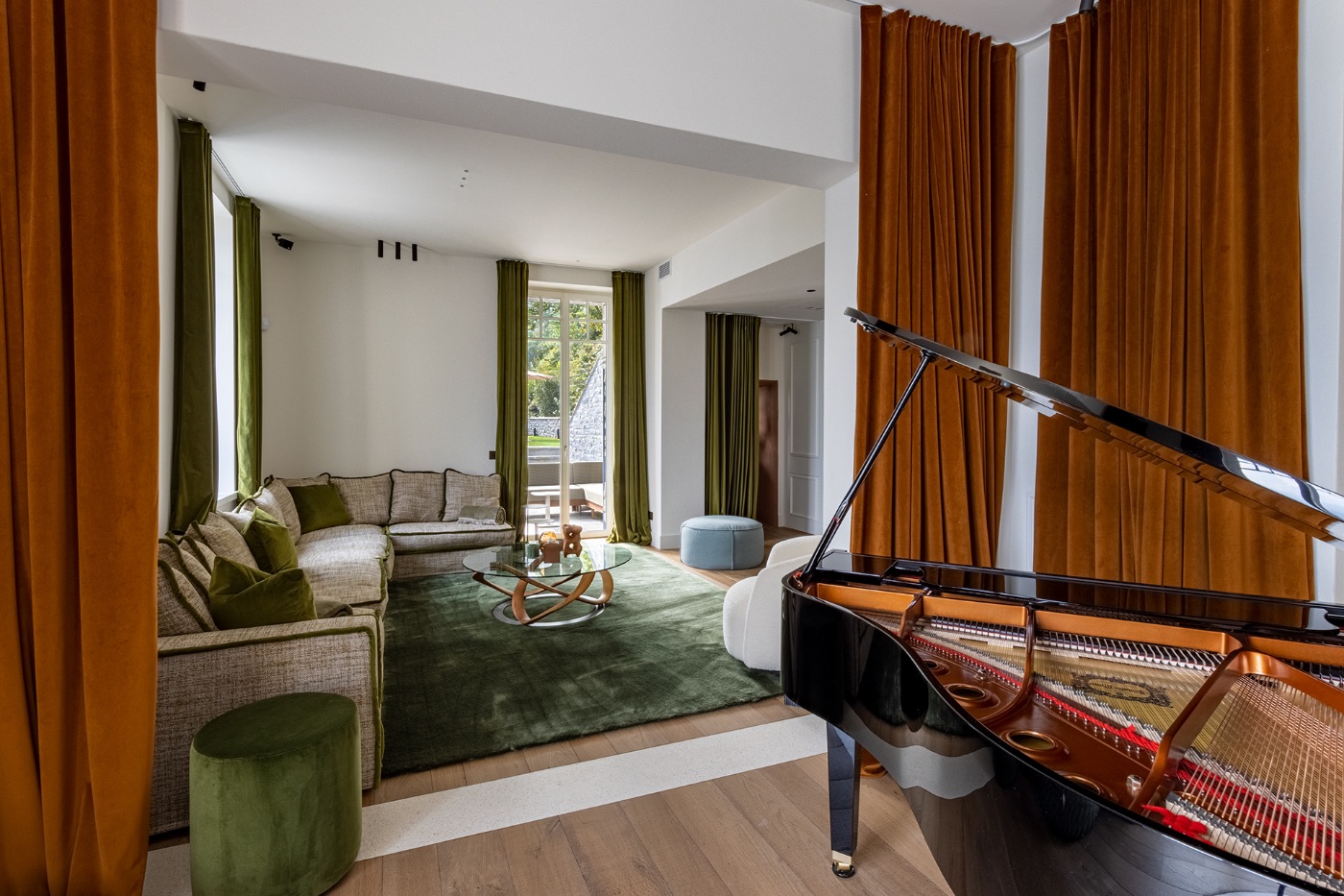 Inside, the atmosphere is refined yet inviting. Carefully preserved original features such as brick archways are paired with clean-lined contemporary furnishings and soft, natural tones. Light-filled living areas include a spacious lounge for film nights and a dining space set beside a grand piano, ideal for elegant dinner parties. The sleek, fully equipped kitchen with long breakfast bar, modern appliances, espresso machine and wine fridge is designed for both private chefs and guests who love to cook.