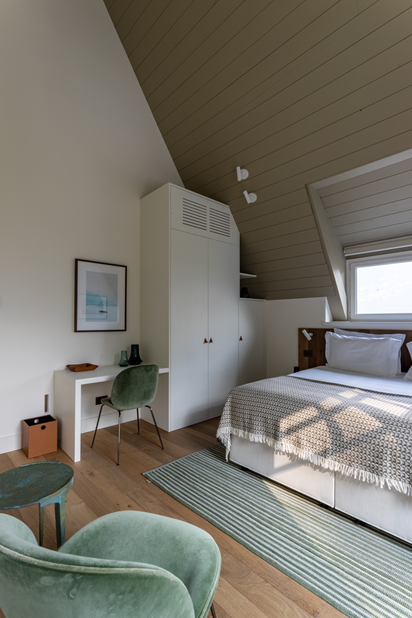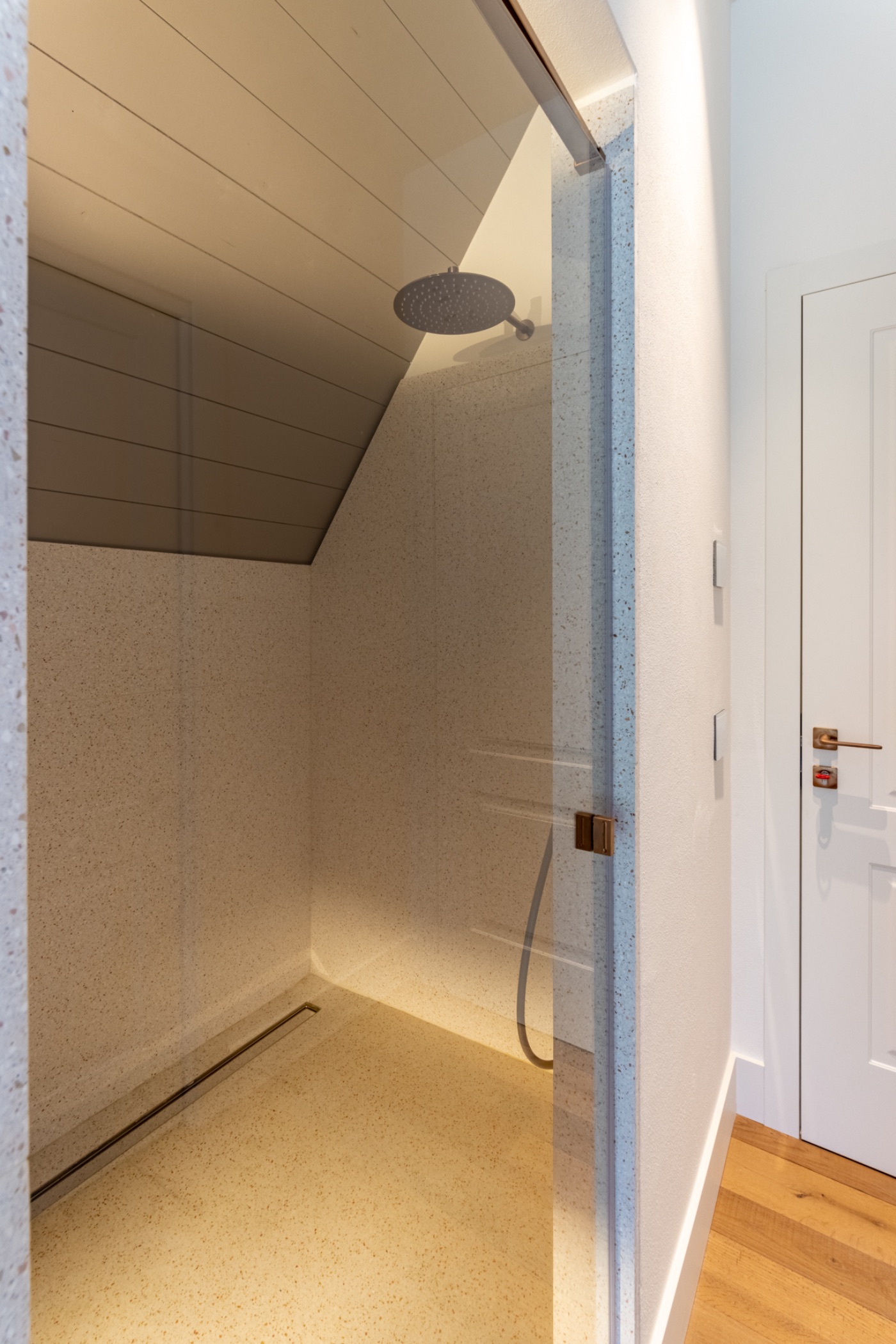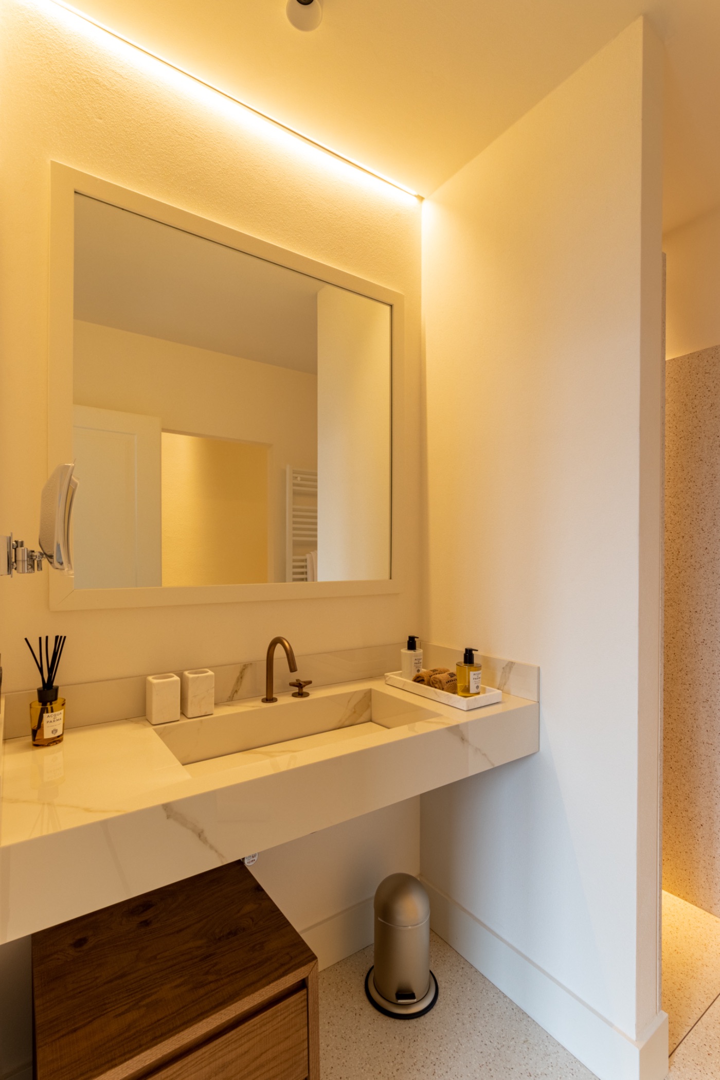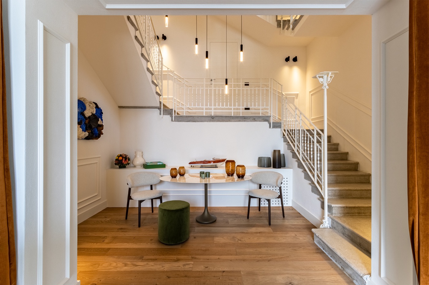 Inside, the atmosphere is refined yet inviting. Carefully preserved original features such as brick archways are paired with clean-lined contemporary furnishings and soft, natural tones. Light-filled living areas include a spacious lounge for film nights and a dining space set beside a grand piano, ideal for elegant dinner parties. The sleek, fully equipped kitchen with long breakfast bar, modern appliances, espresso machine and wine fridge is designed for both private chefs and guests who love to cook.