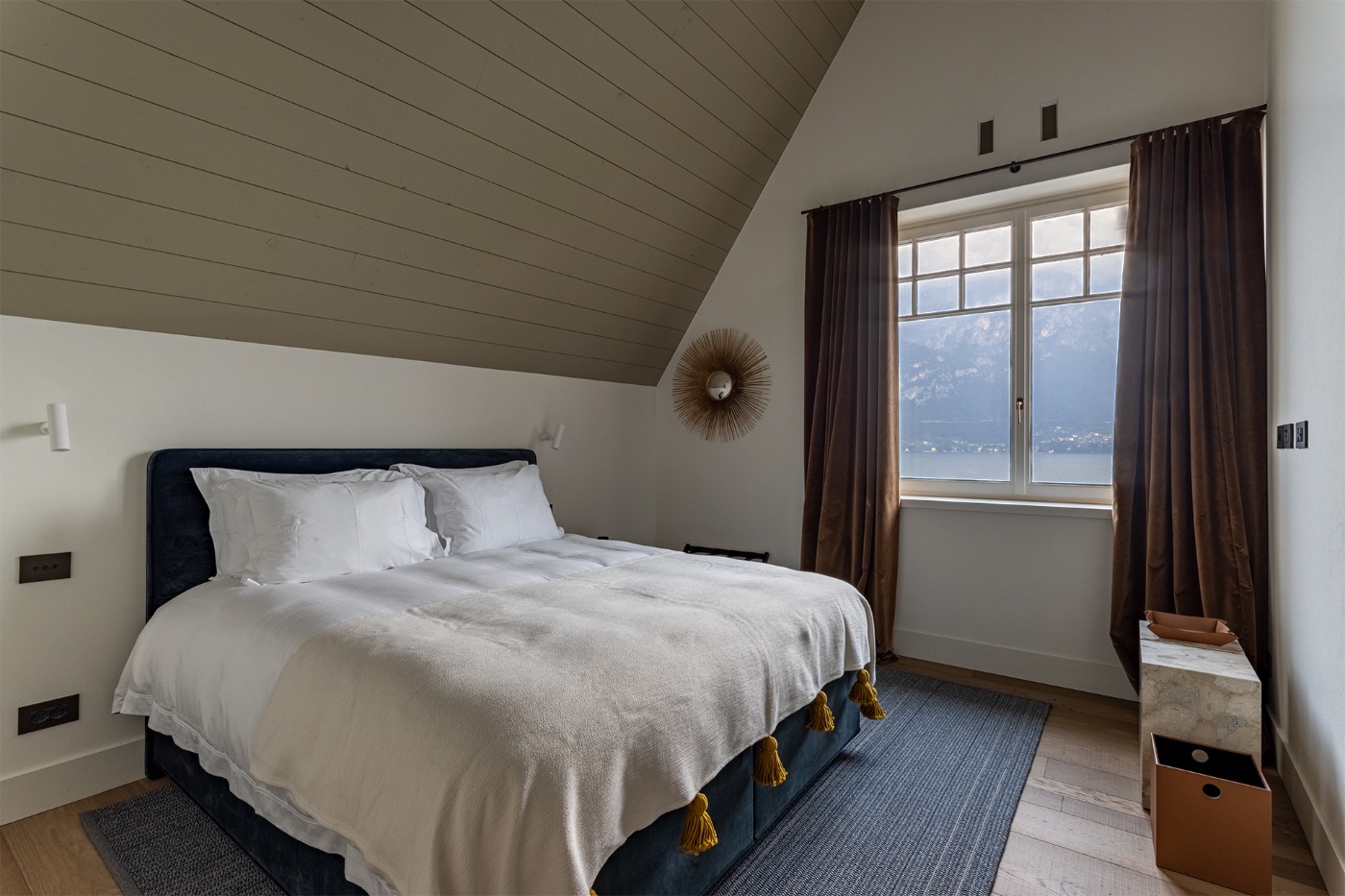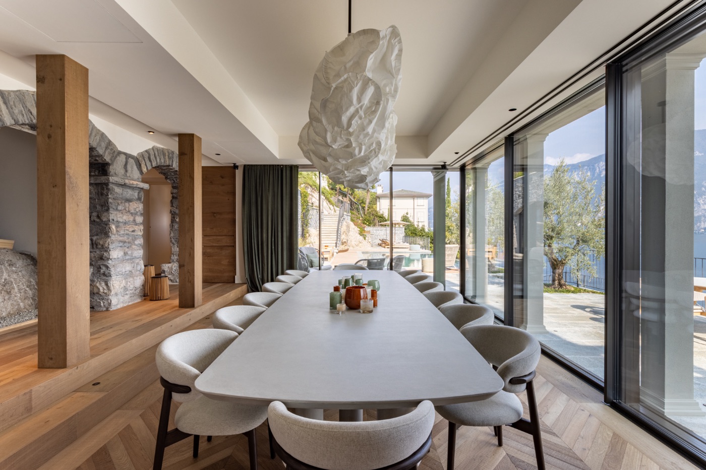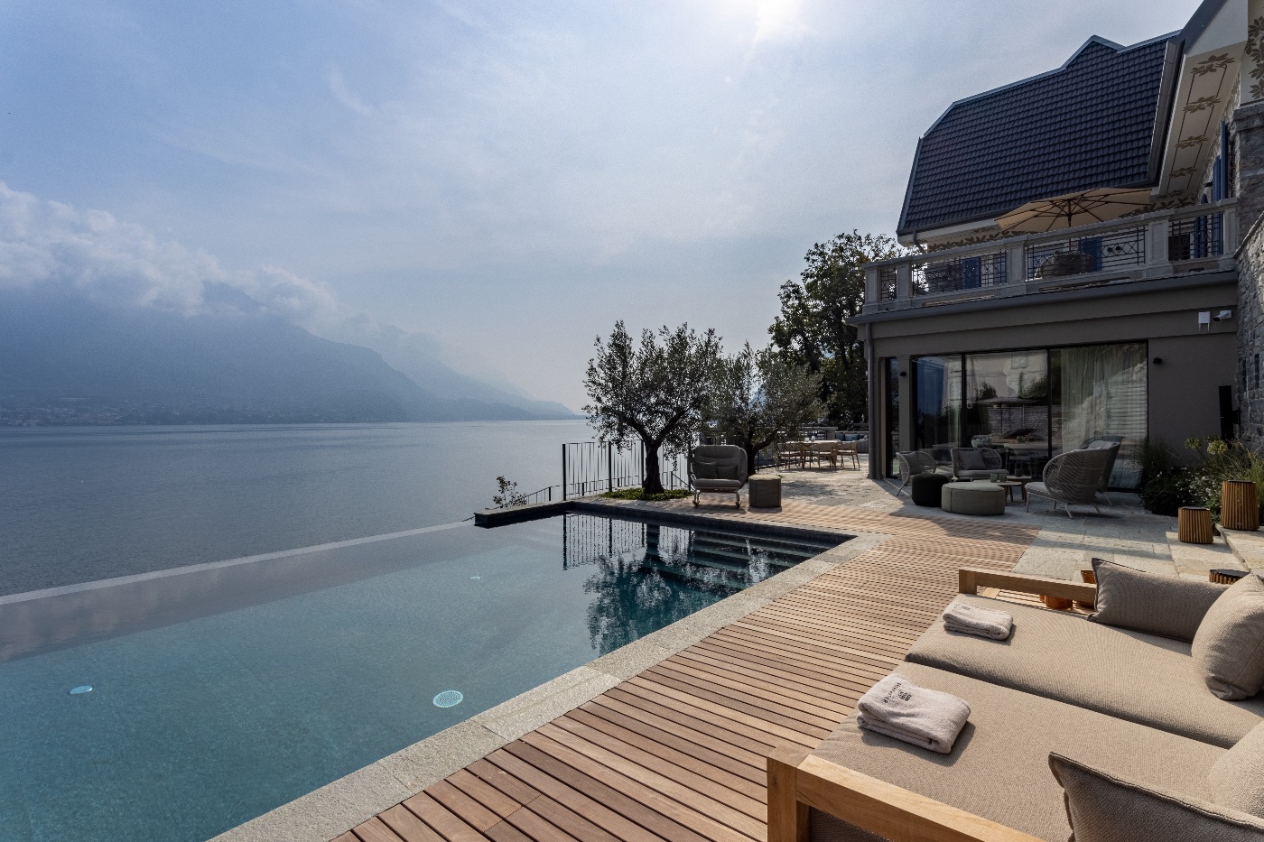 Outdoors, life flows naturally between sun and shade. The heated infinity pool appears to merge with the lake below, with plush day beds inviting long, unhurried afternoons. Multiple outdoor lounges and dining spaces are thoughtfully arranged across the terraces: a quiet corner for morning espresso, a generous table for al fresco dinners, and intimate spots for evening drinks and conversation. A private dock offers direct access to the lake’s crystal-clear waters and is the perfect starting point for boat trips to Bellagio’s iconic villages and gardens.