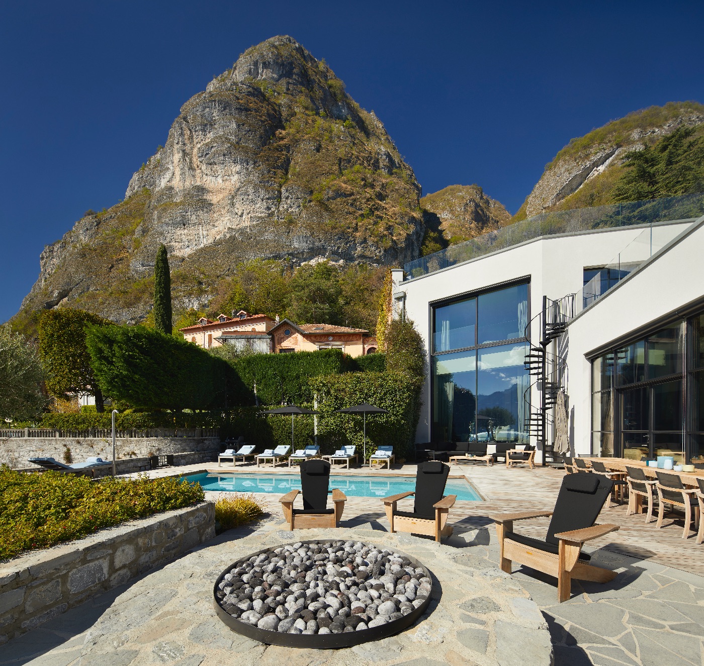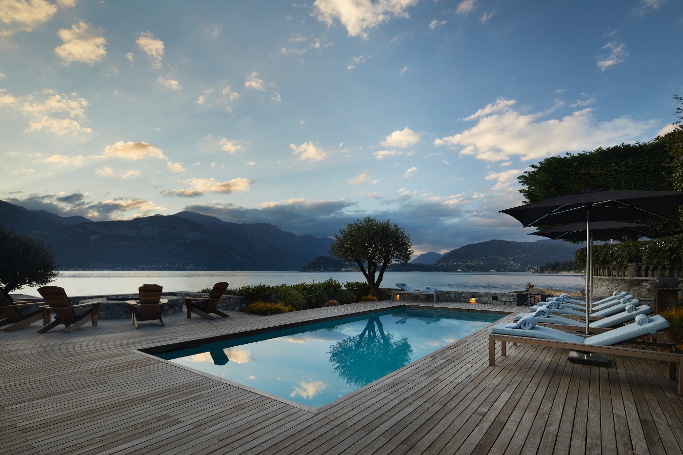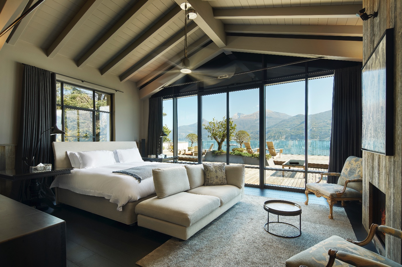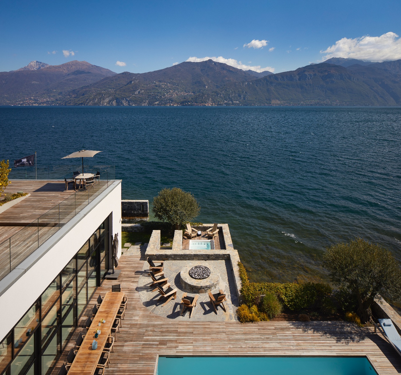 Spread across approximately 1,900 sqm over three levels, the villa is conceived for both relaxation and entertaining. Outdoors, guests enjoy a heated lakeside swimming pool, a generous decked terrace with multiple al fresco dining and lounging areas, a cosy fire pit and a private dock – ideal for arriving in style by boat or exploring the lake on private cruises. Every space is oriented towards the water, framing uninterrupted views of Lake Como and its dramatic mountain backdrop.