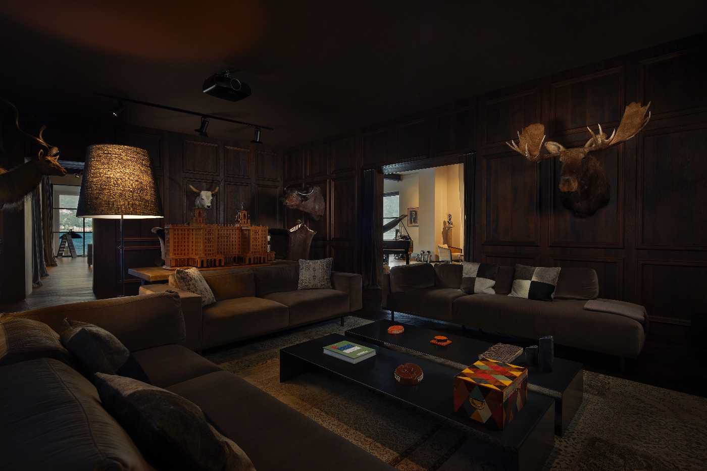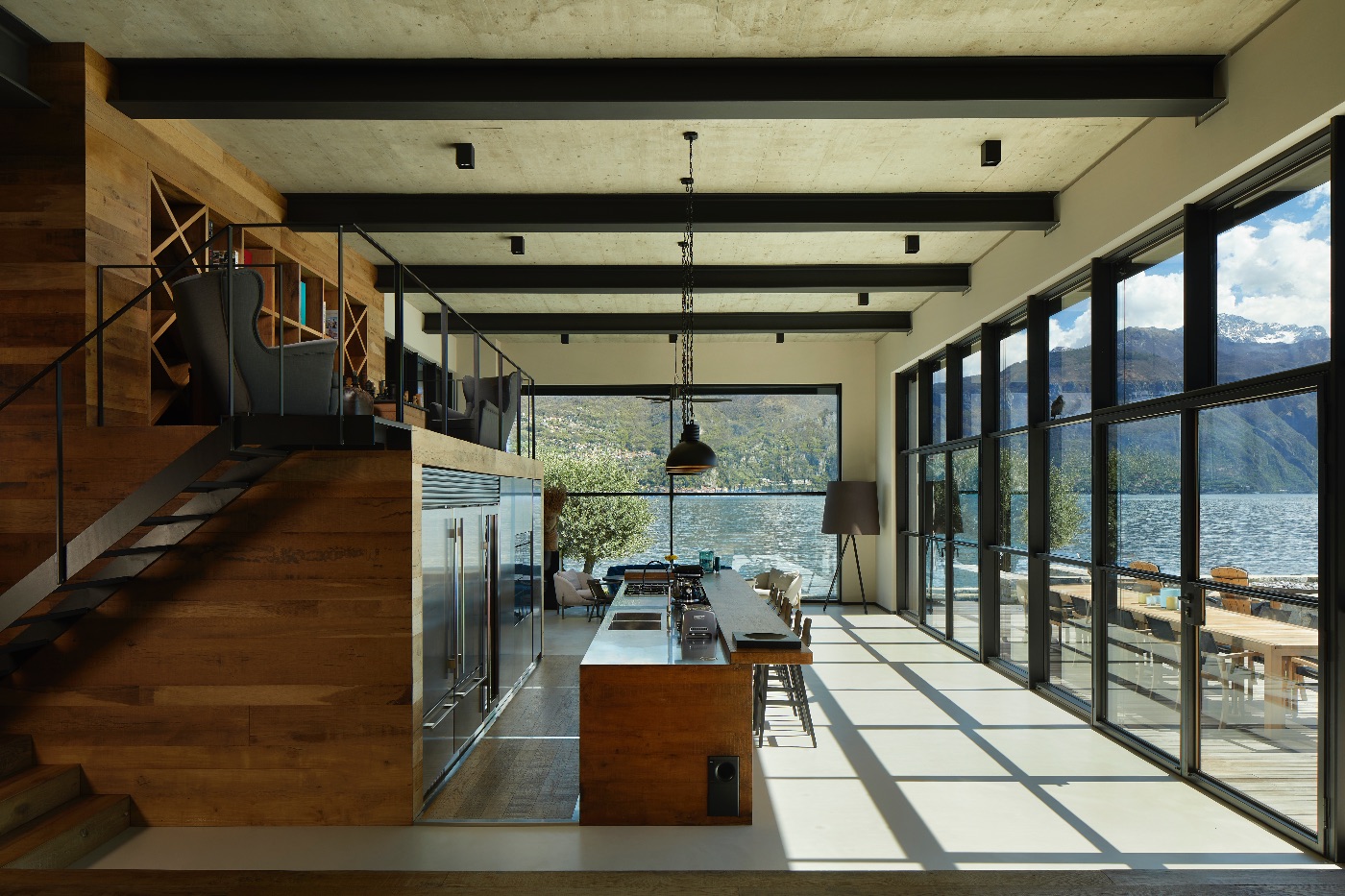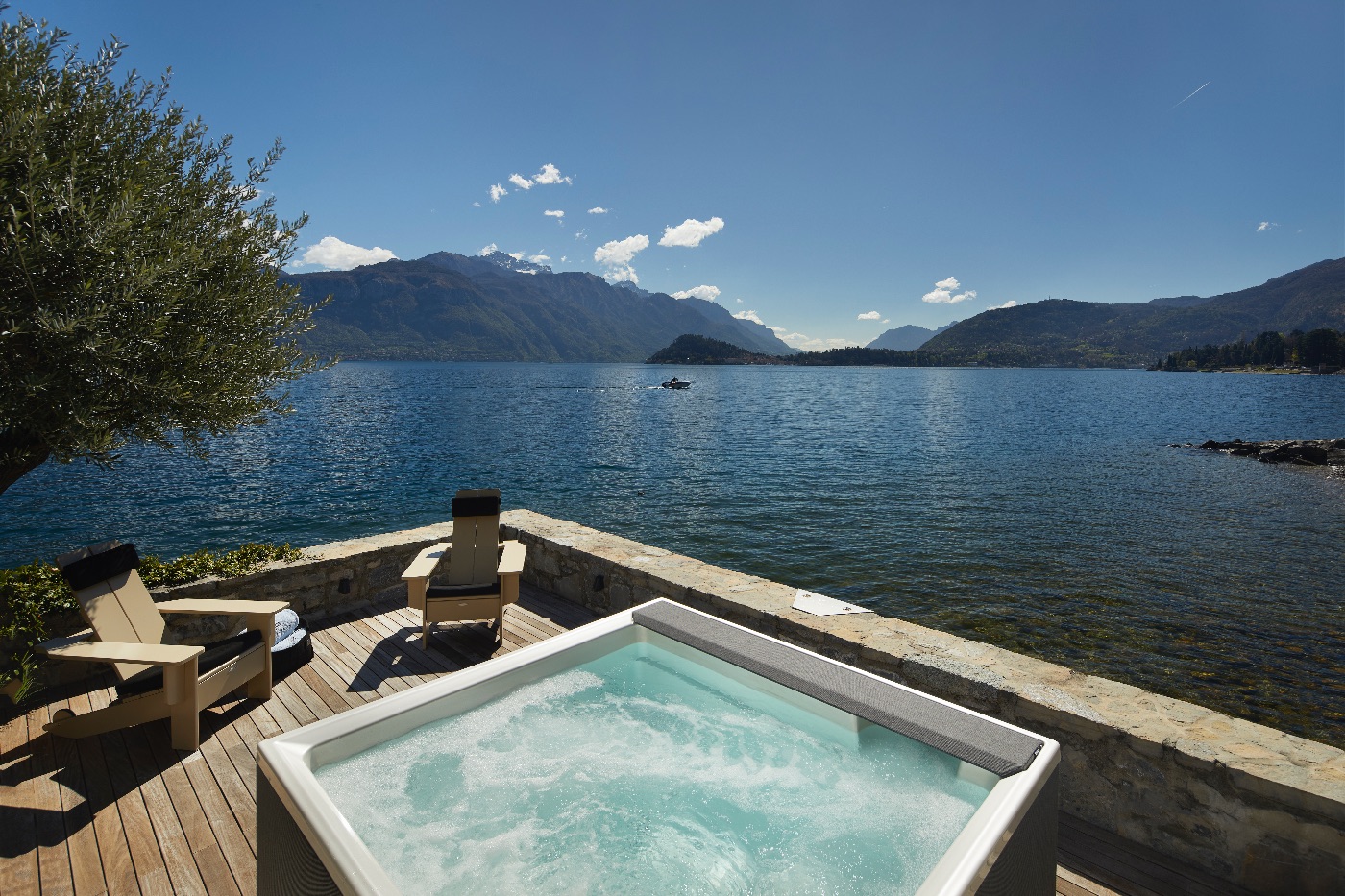 Inside, the sense of luxury continues with light-filled living and dining areas opening onto the lake, a sleek fully equipped kitchen, an elegant library, a wine cellar, a modern gym and a dedicated office space. The private spa area invites guests to unwind after days on the water or exploring the surrounding villages.