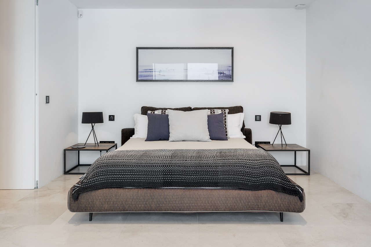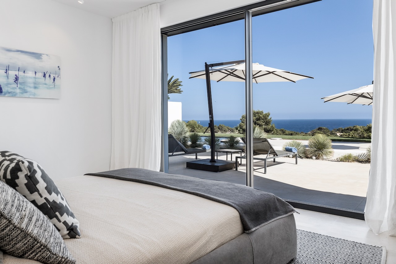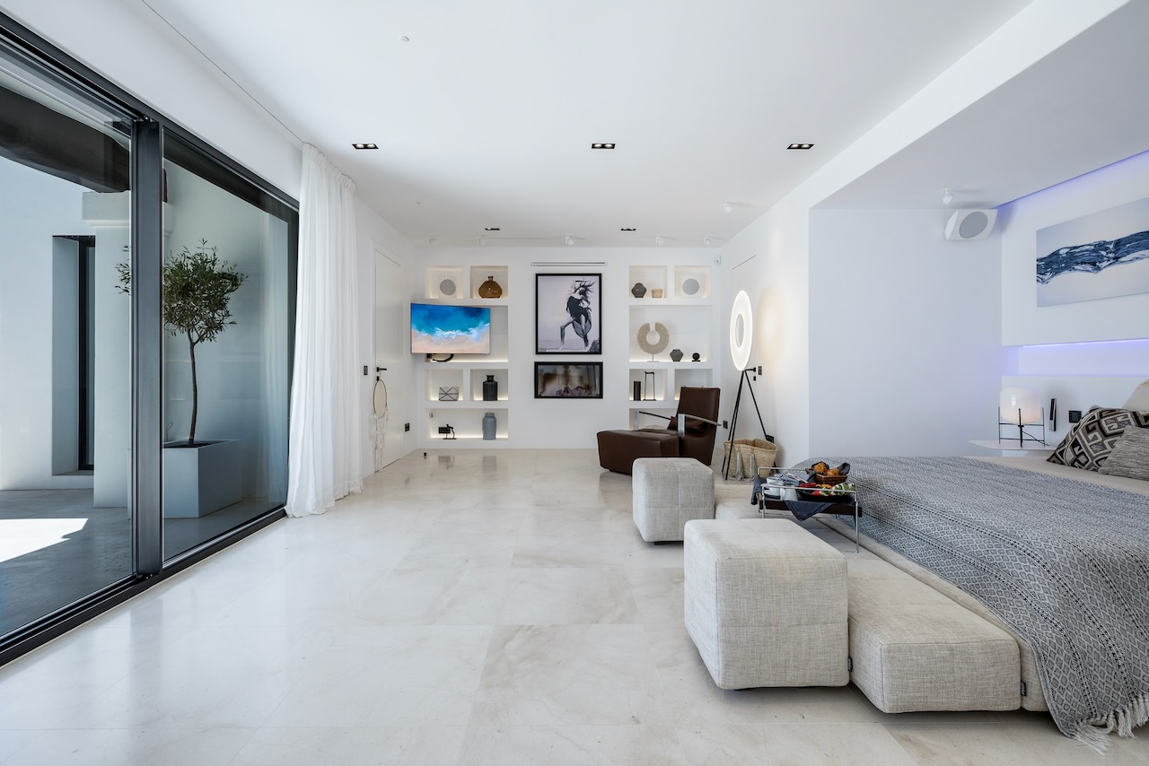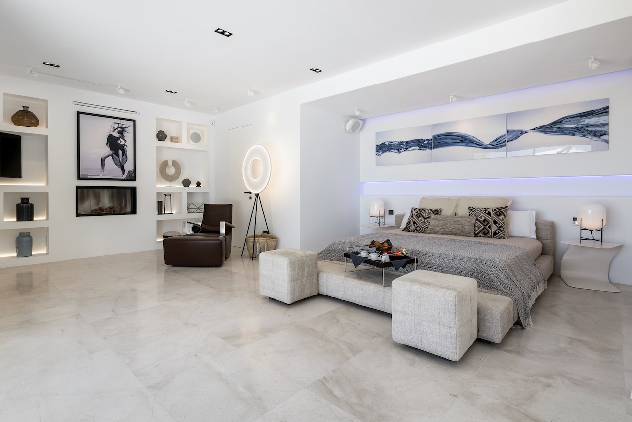 The minimalist elegance continues through the six delightful double bedrooms, softened by beautiful art and stylish monochrome soft furnishings. The master suite on the upper floor enjoys access to a private terrace and a freestanding bath from where you can enjoy the beautiful sea views as you soak.