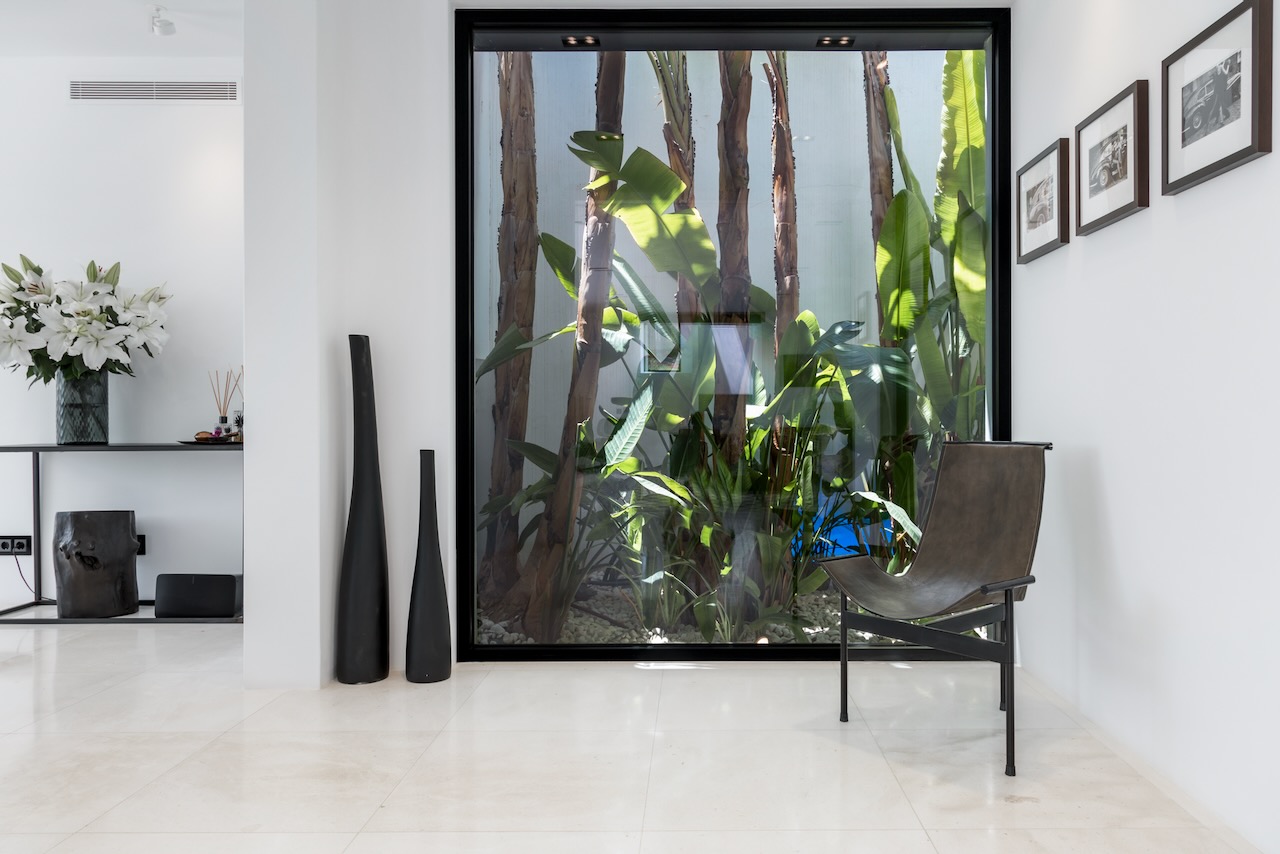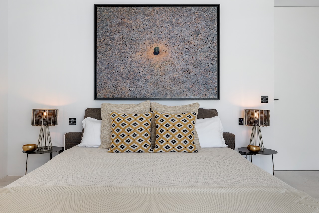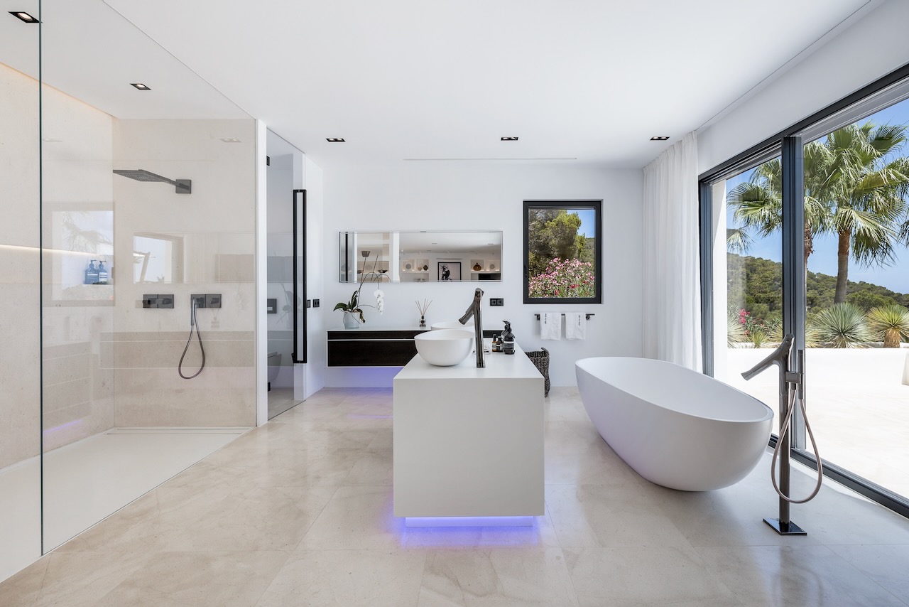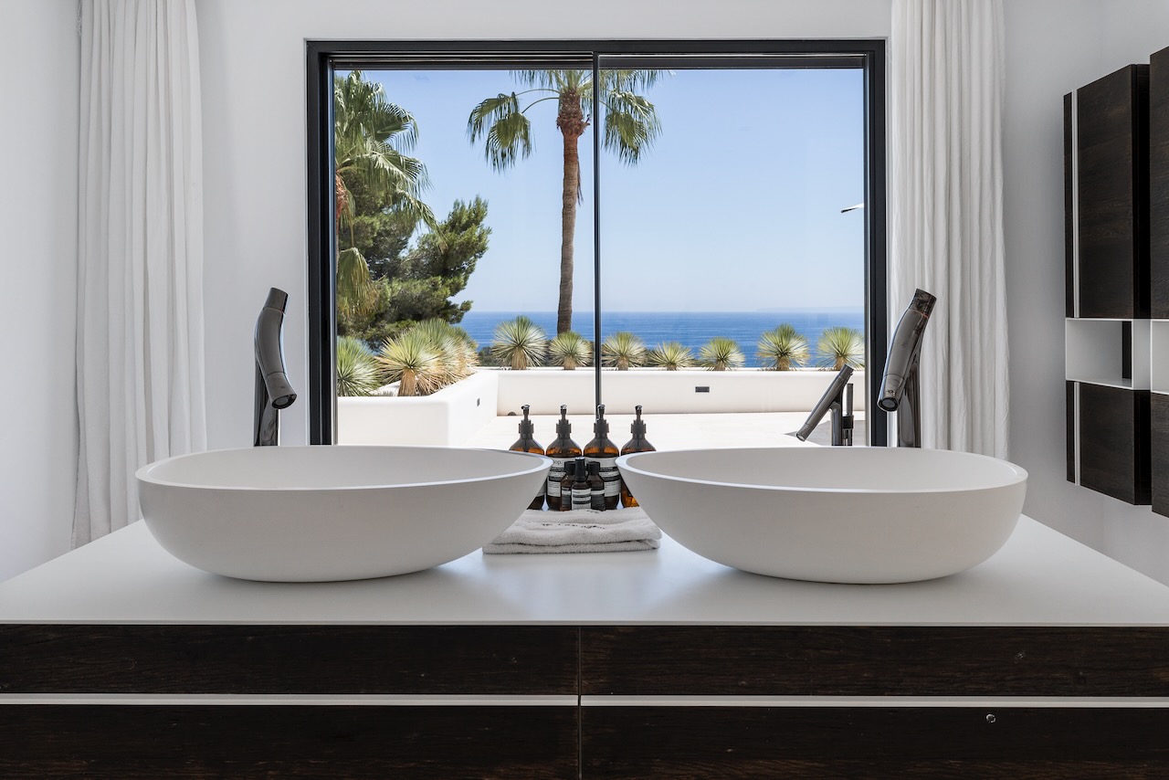 The minimalist elegance continues through the six delightful double bedrooms, softened by beautiful art and stylish monochrome soft furnishings. The master suite on the upper floor enjoys access to a private terrace and a freestanding bath from where you can enjoy the beautiful sea views as you soak.