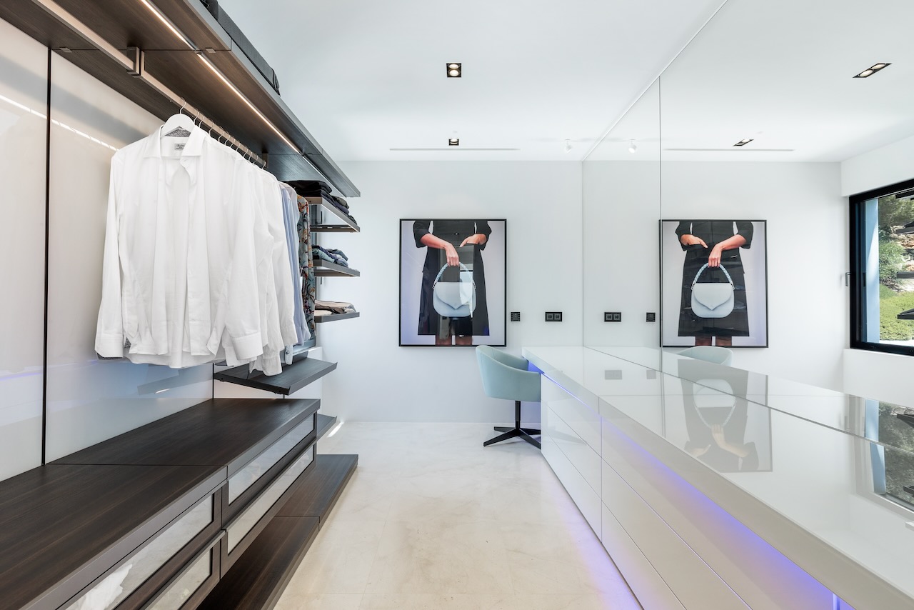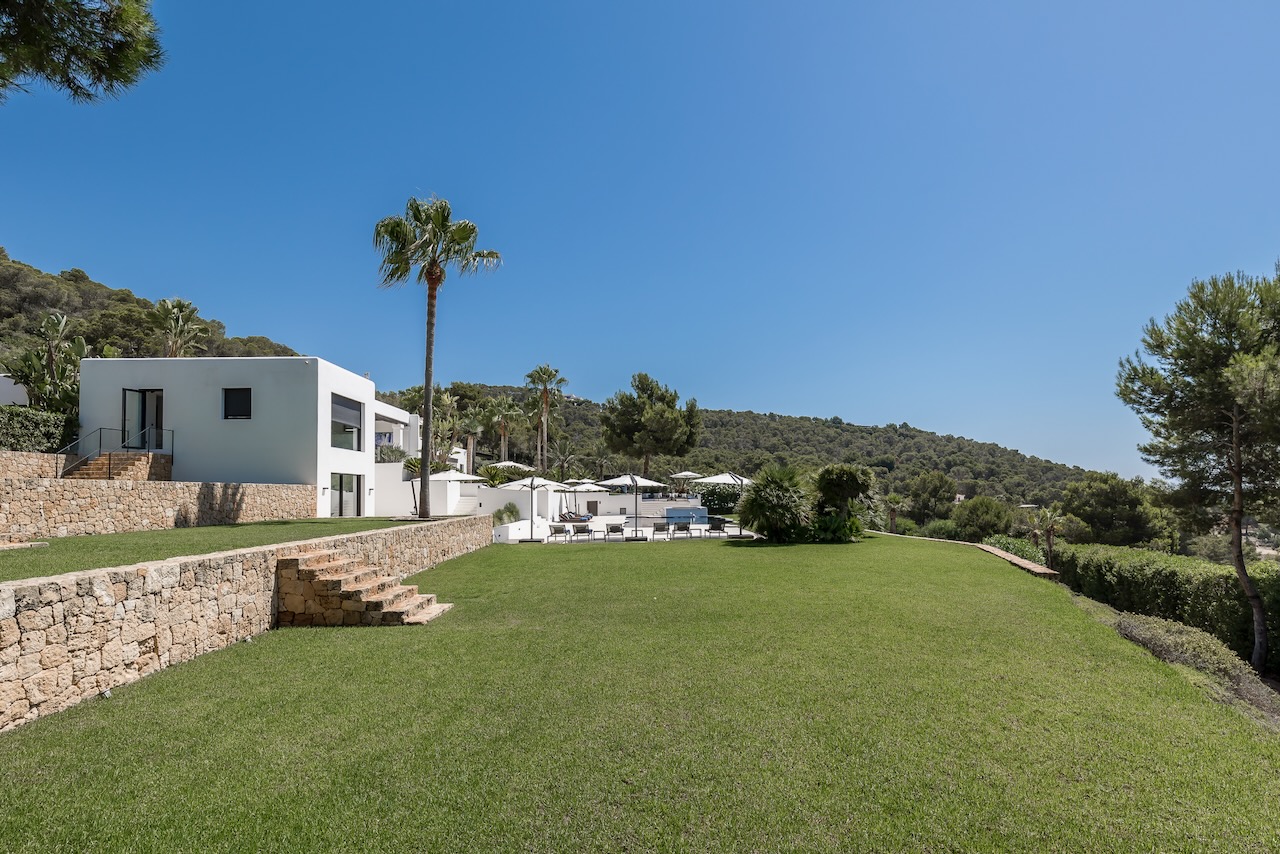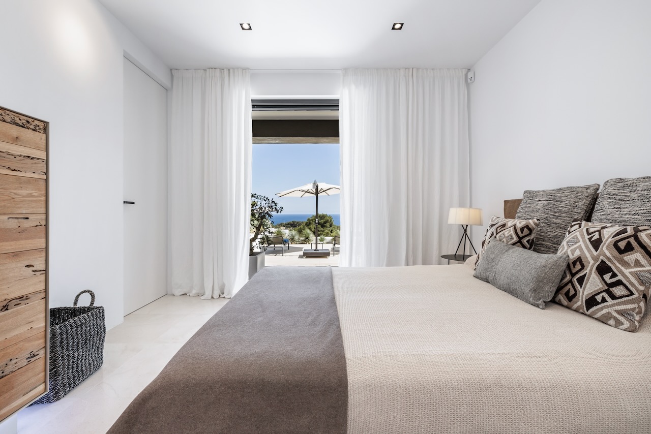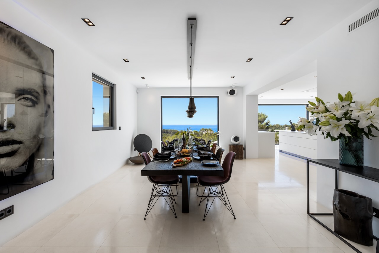 In the prestigious neighbourhood of Cap Martinet in Ibiza, the outstanding contemporary Villa Can Nemo hides amongst tree-clad hills overlooking the sea. The views to Dalt Vila and the clear waters off the island from resort-worthy living areas, both inside and out, with the blue Balearic waters shimmering in the distance, are breath-taking.