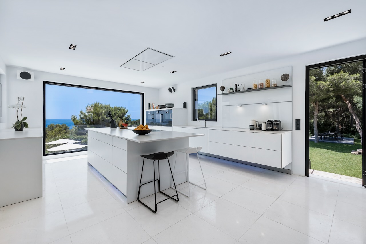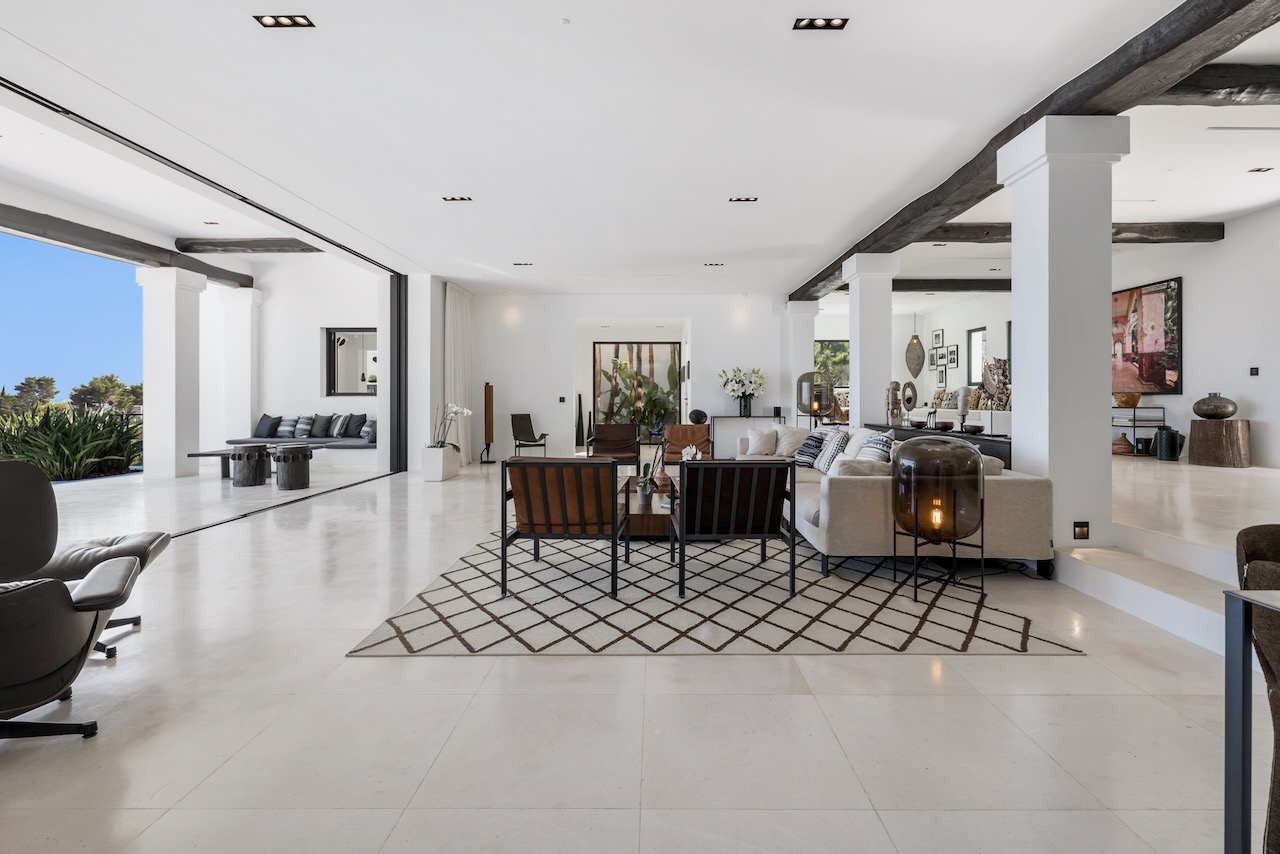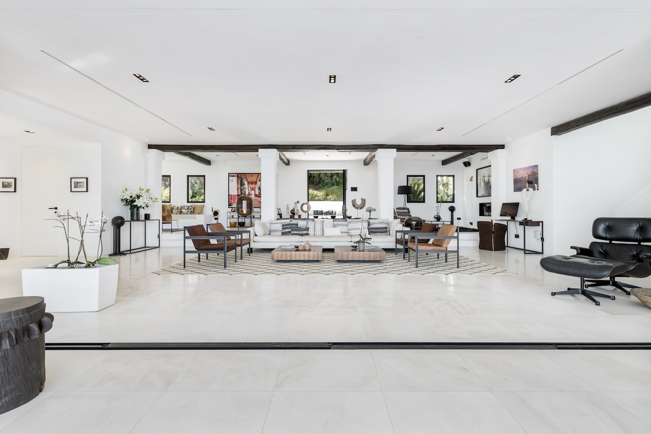 Closer to the house, the shady terrace offers more chill-out lounge seating. Here, wide, sliding glass doors open to seamlessly link the terrace with the stylish interior living spaces. The sophisticated, cool white interiors lead through a spacious lounge, to a formal dining table, seating twelve, and large kitchen. All share beautiful views across the private gardens to the sea.
