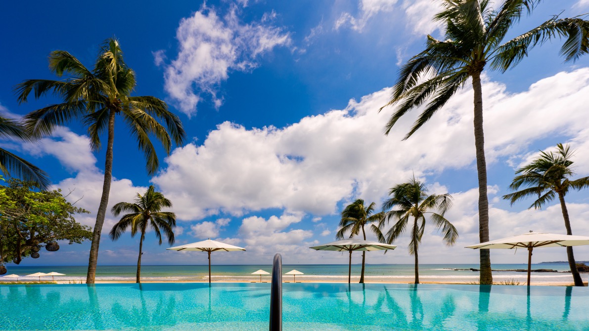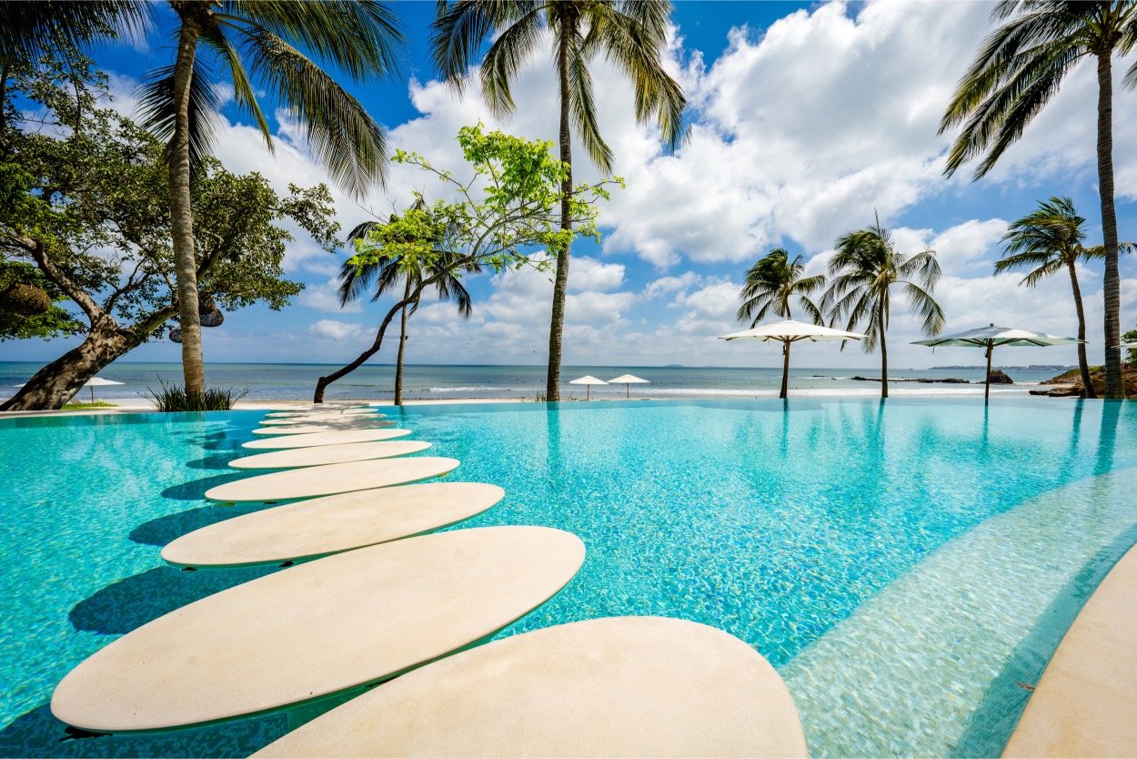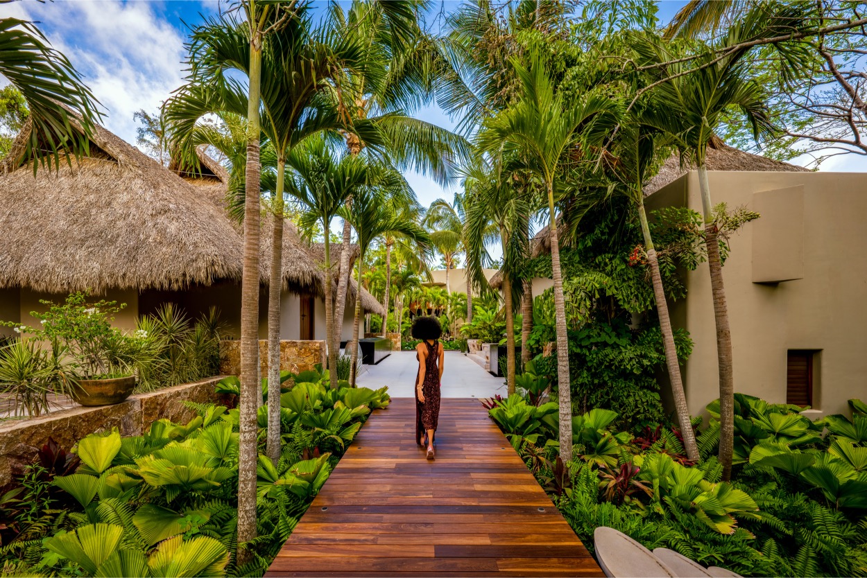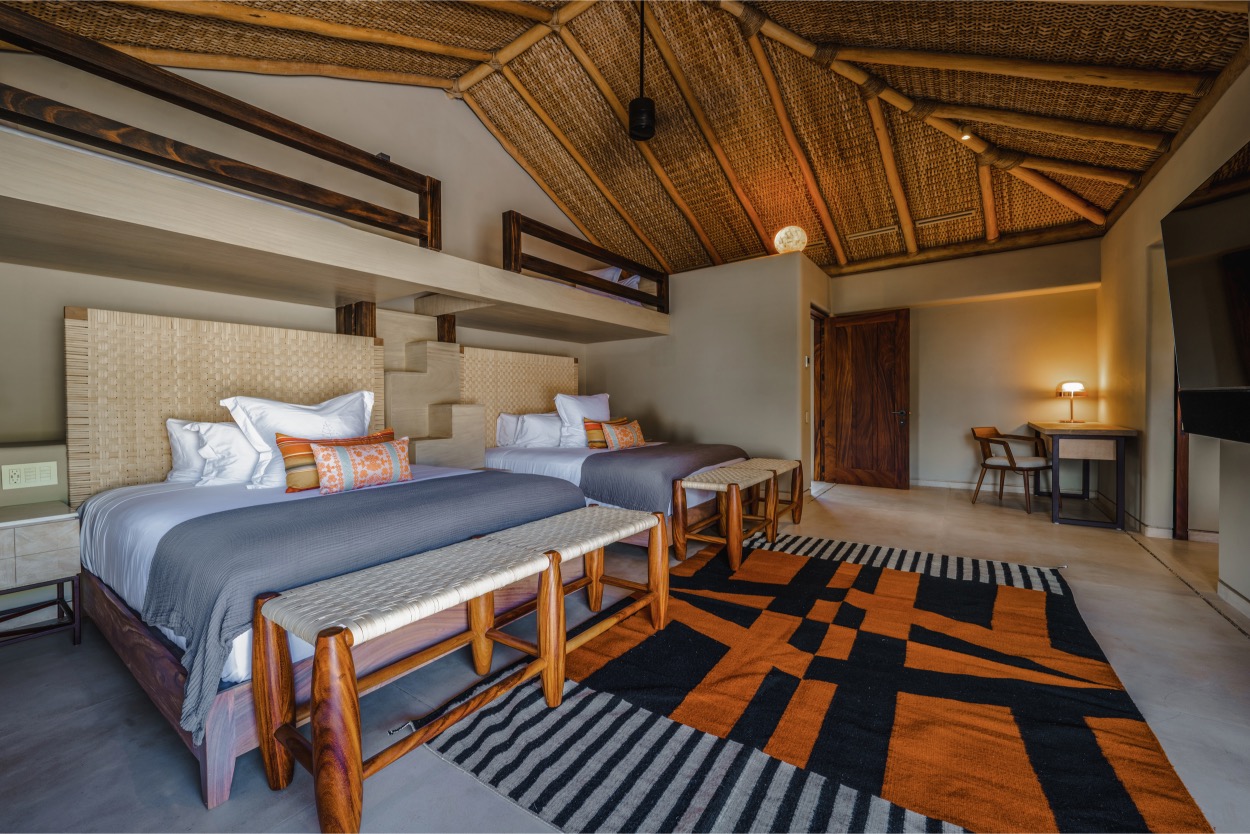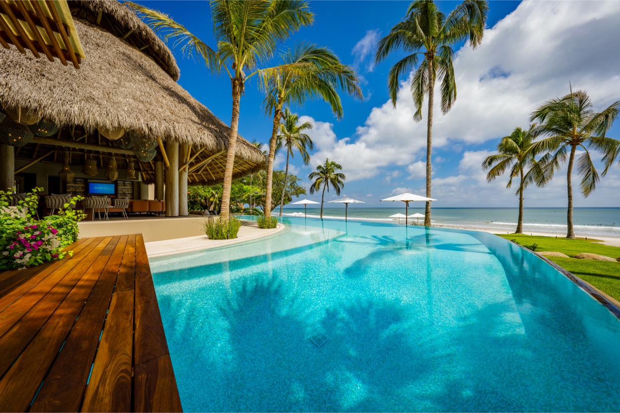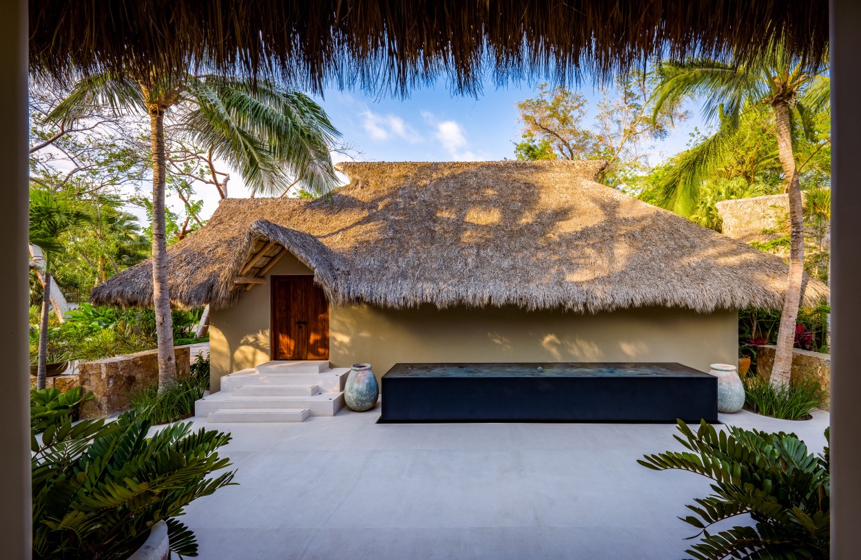 Statement pool + hot tub, rooftop fire-pit bar, and that cinematic palapa