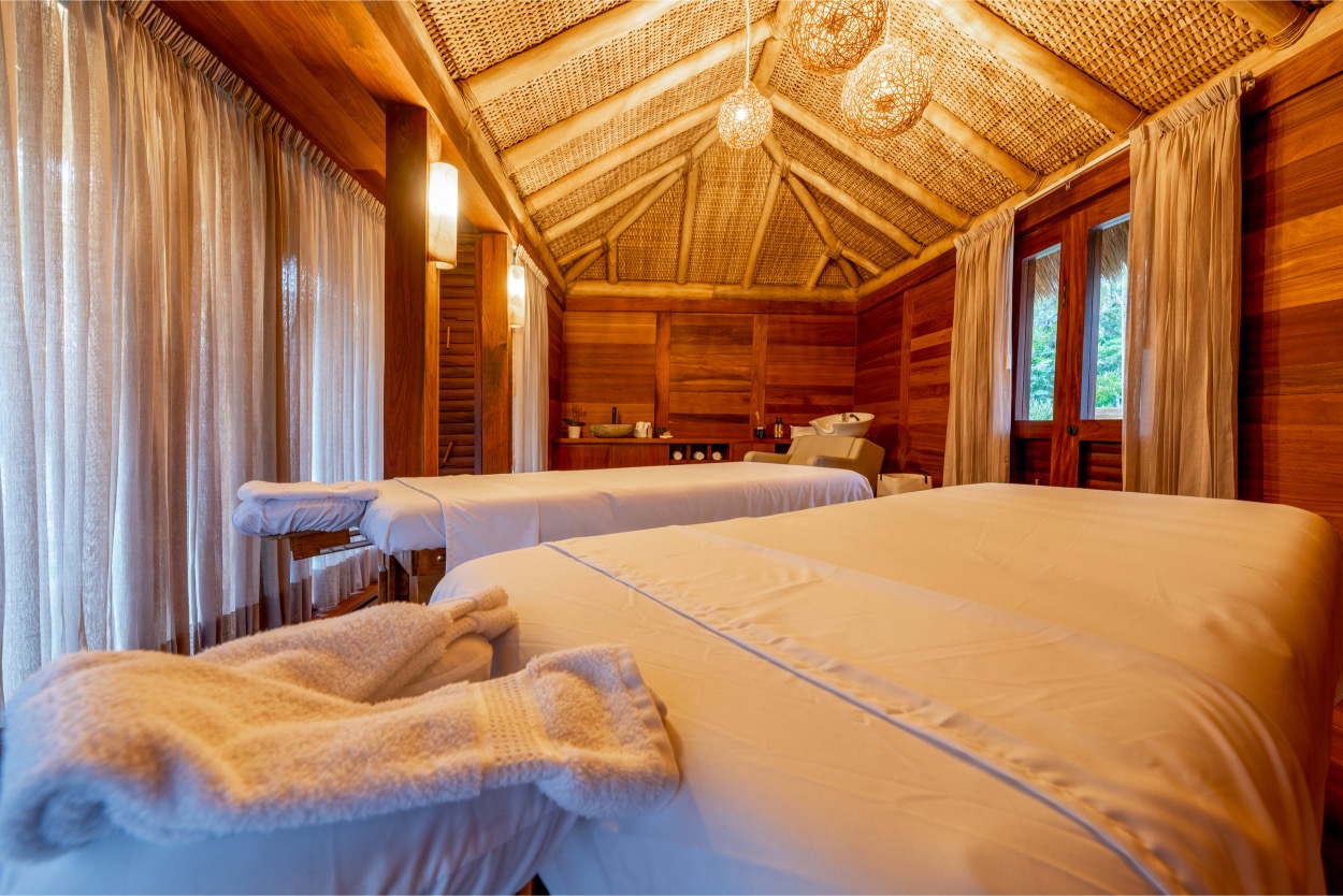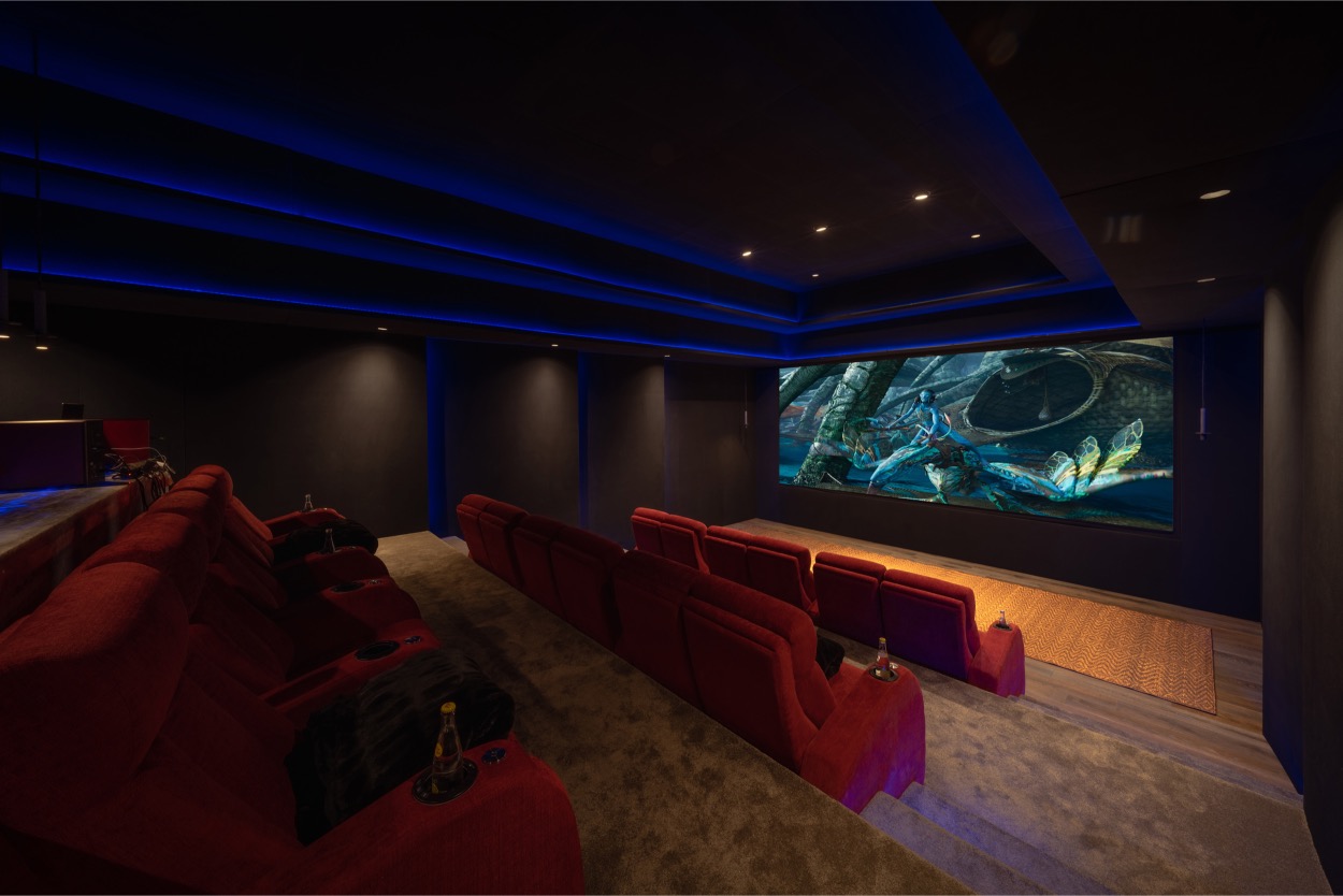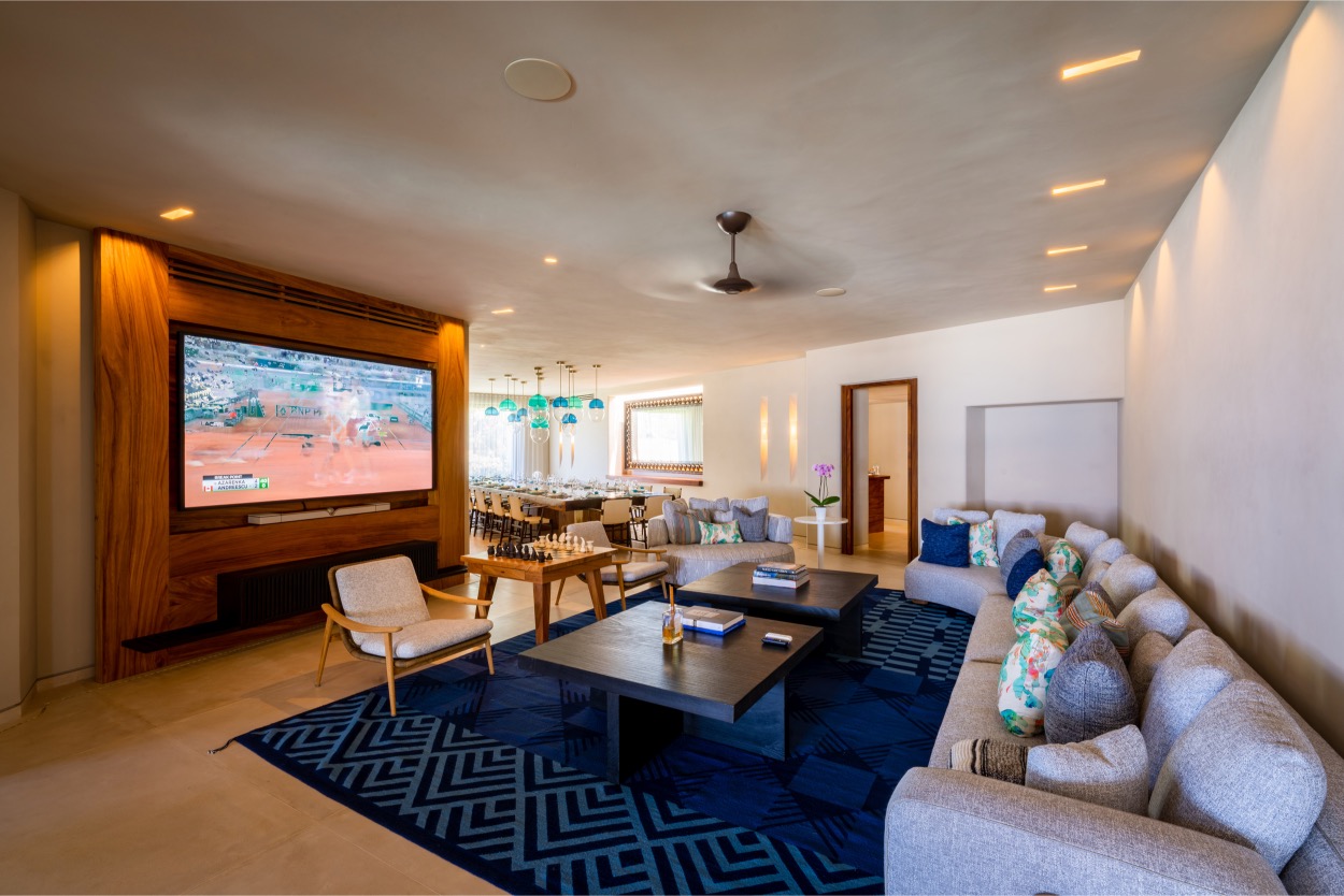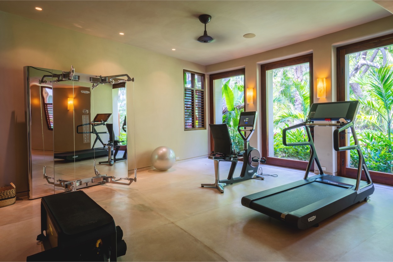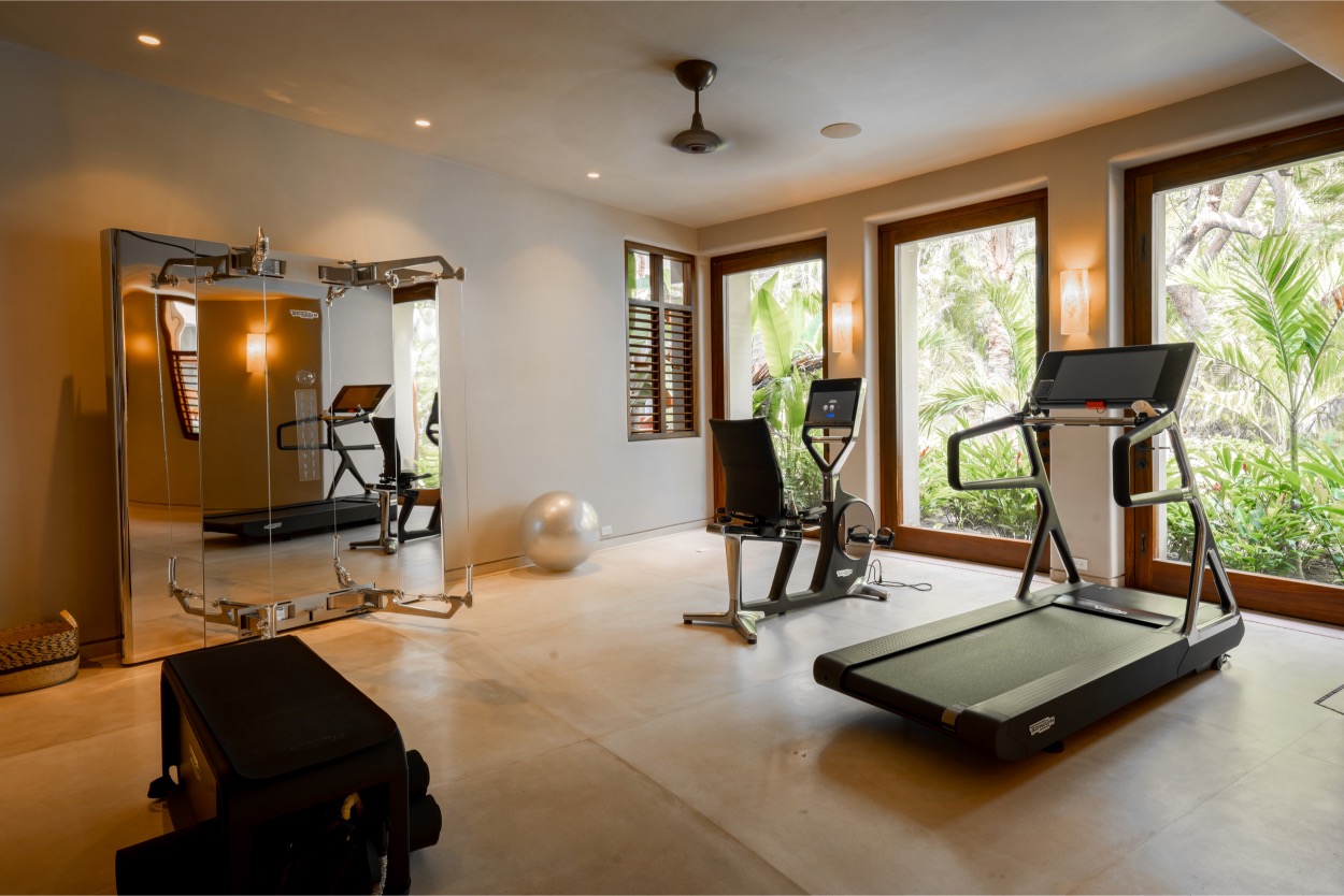A private cinema room (reclining seats, state-of-the-art projector) for family film nights. Technogym fitness studio for morning workouts. Private spa for massages and rituals between pool dips.