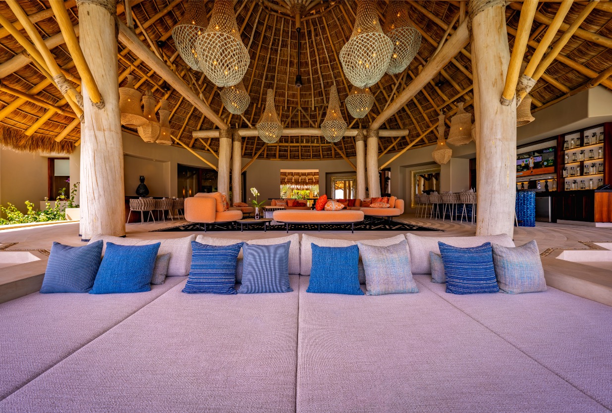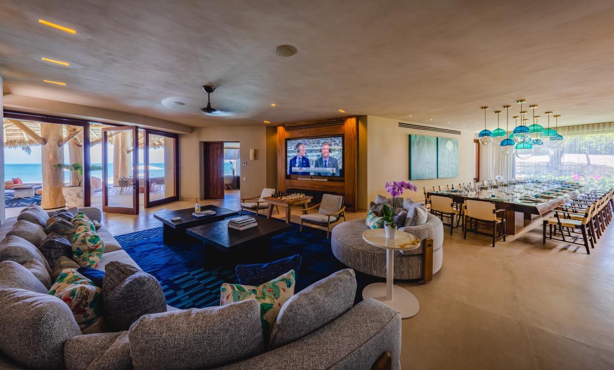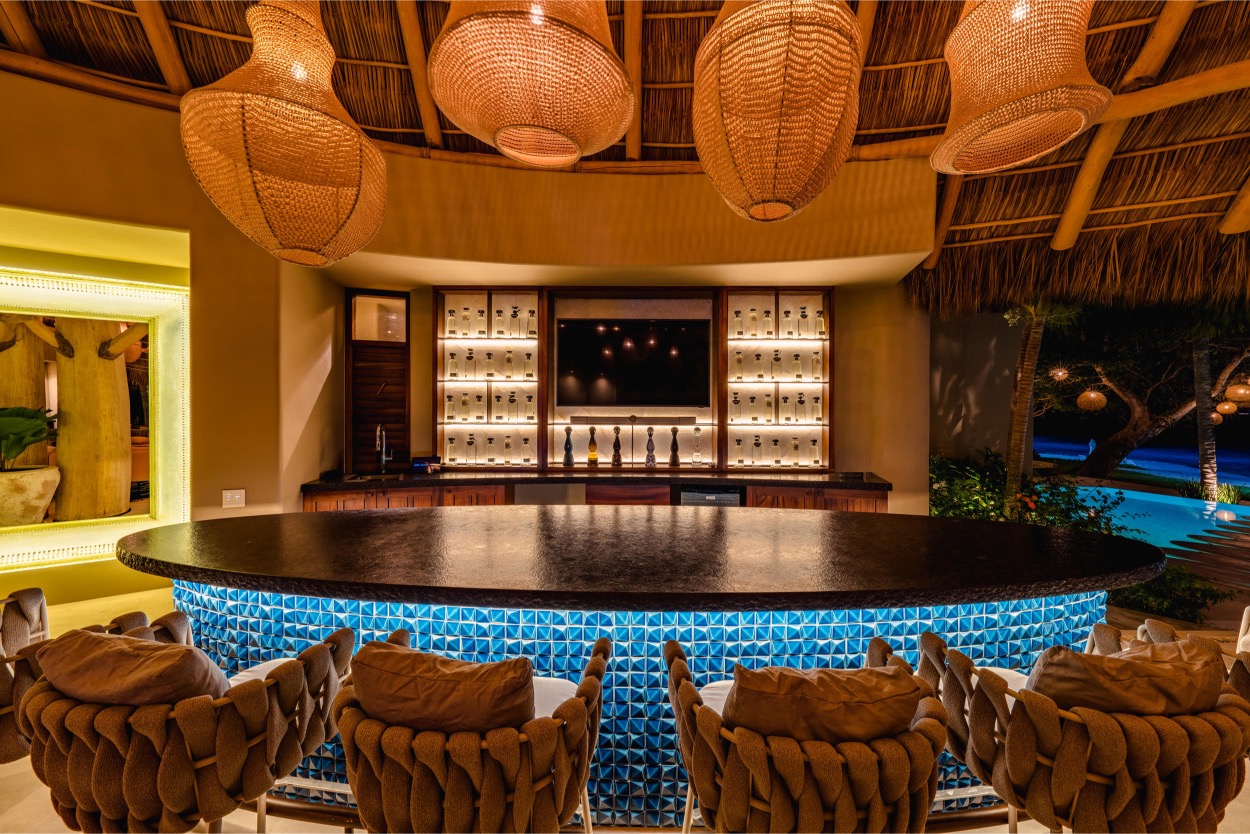 A vast, heated infinity pool wraps the ocean side of the villa, edged with daybeds and loungers. Sunset hour belongs to the oversized hot tub—cocktails in hand, eyes on the Marietas Islands. Evenings rise to the rooftop bar with fire pit for stargazing and nightcaps. Under the soaring grand palapa, life moves effortlessly—lounge seating, a Tequila bar, and a generous dining table for unhurried al fresco meals. Floor-to-ceiling glass blurs indoors and out, framing panoramic sea views from the open-plan salon and adjacent dining area.