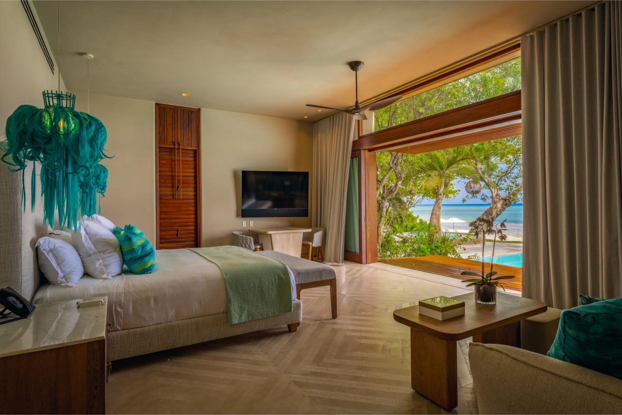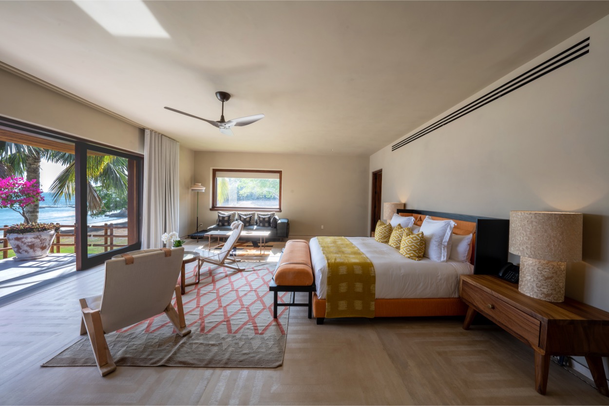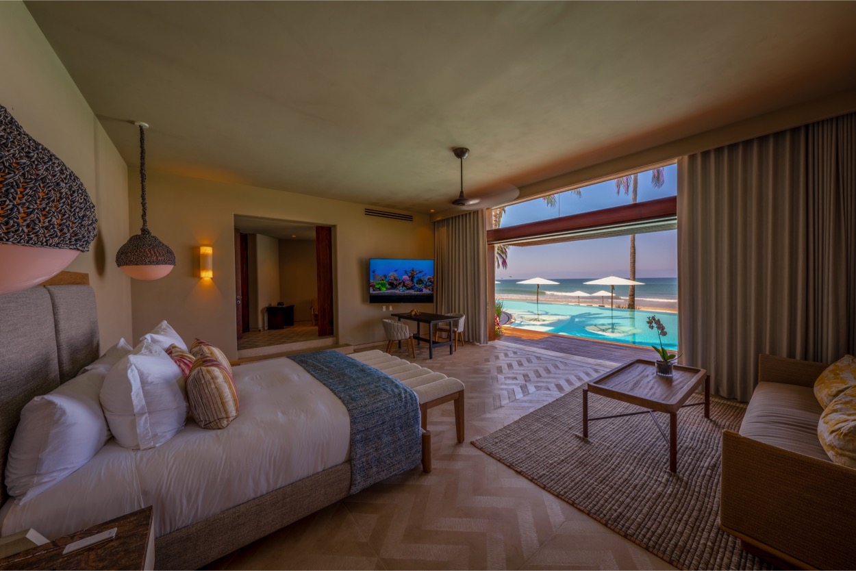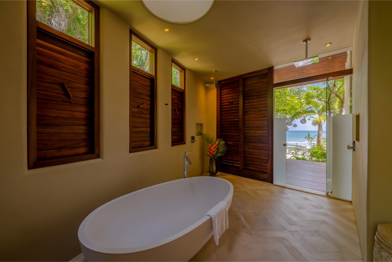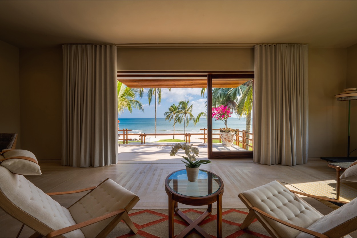 Four oceanfront primary suites plus five additional bedrooms, each with en-suite bath and a private terrace or balcony overlooking the Pacific or the gardens. Discreet tech, plush linens, quiet luxury throughout.