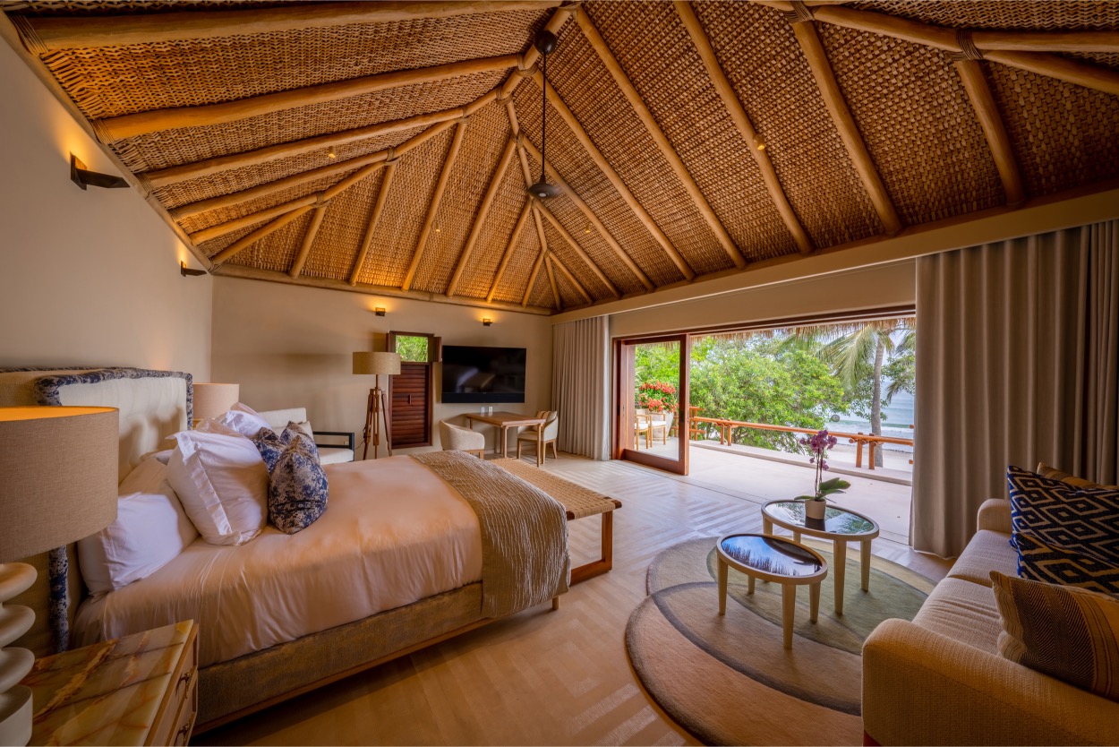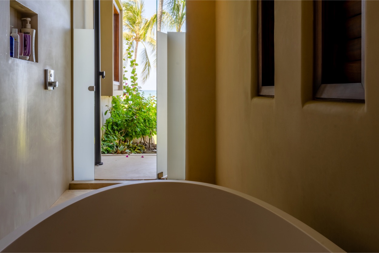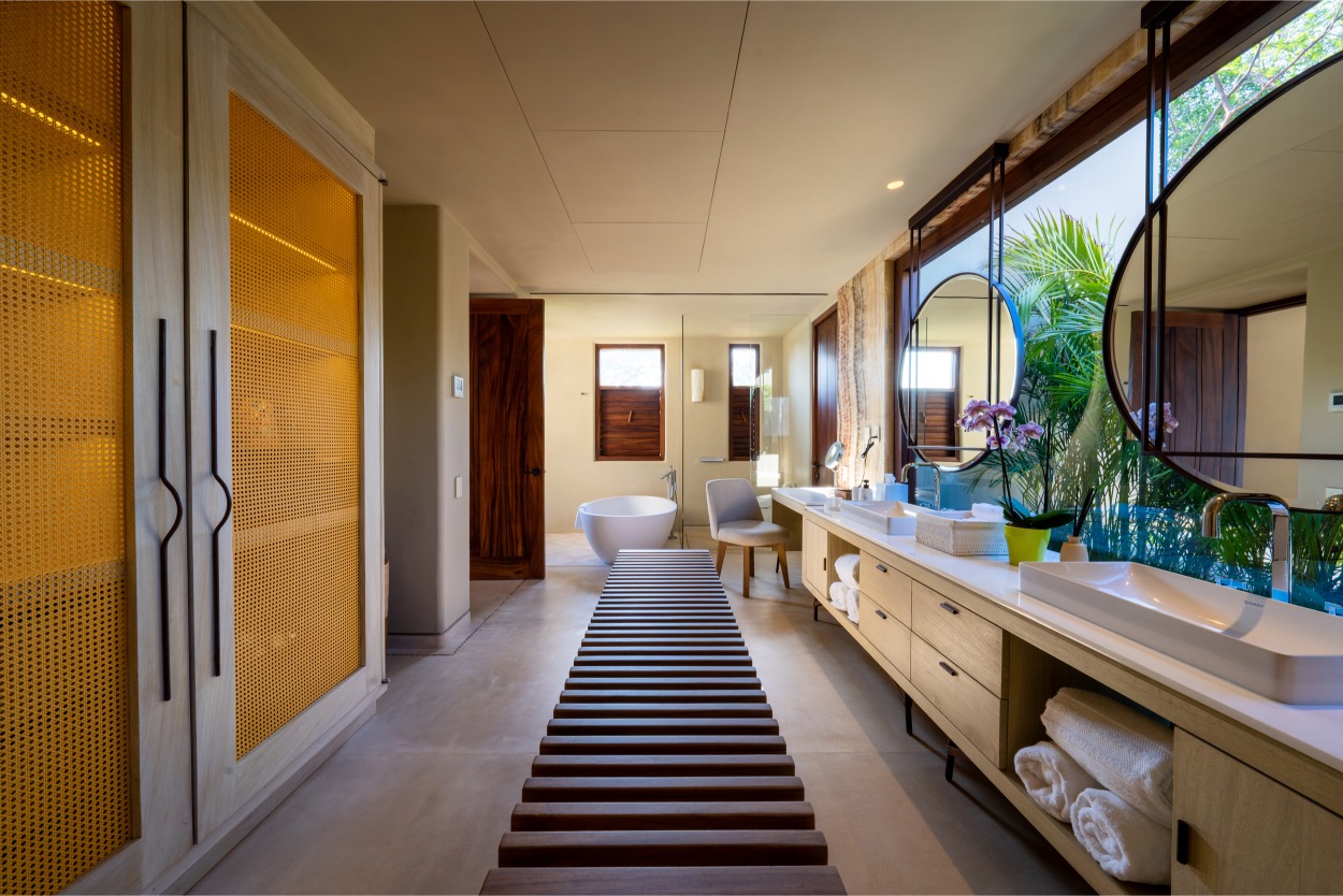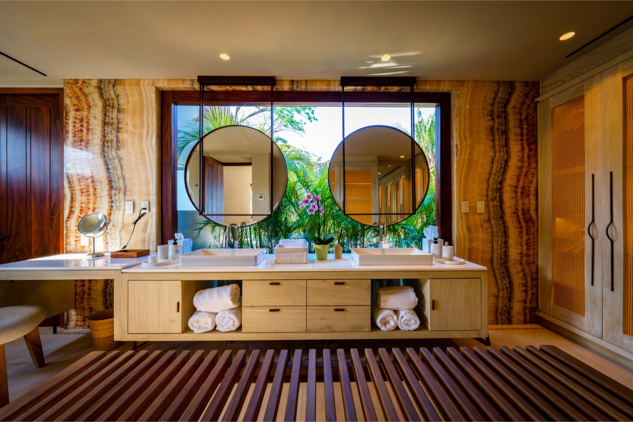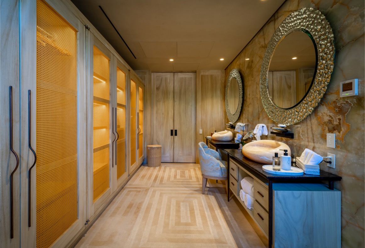 Four oceanfront primary suites plus five additional bedrooms, each with en-suite bath and a private terrace or balcony overlooking the Pacific or the gardens. Discreet tech, plush linens, quiet luxury throughout.