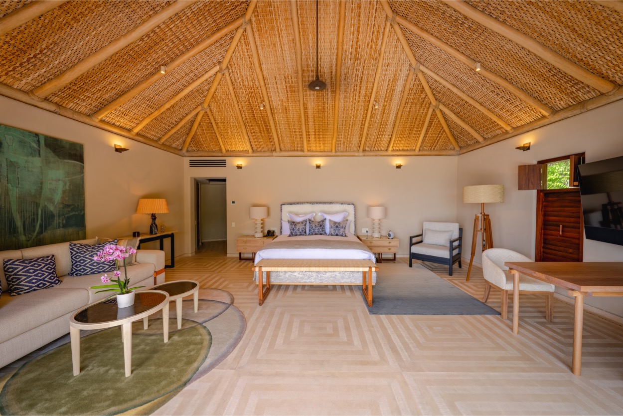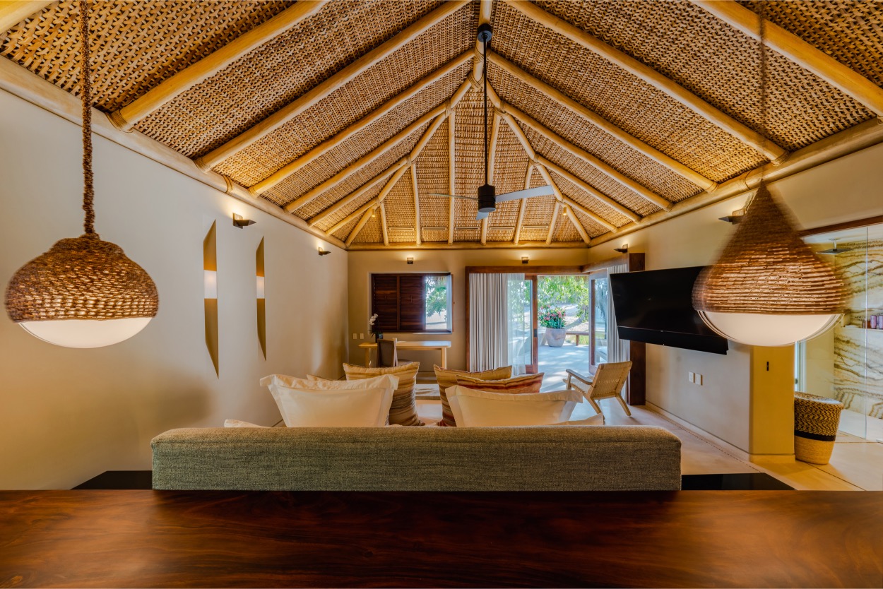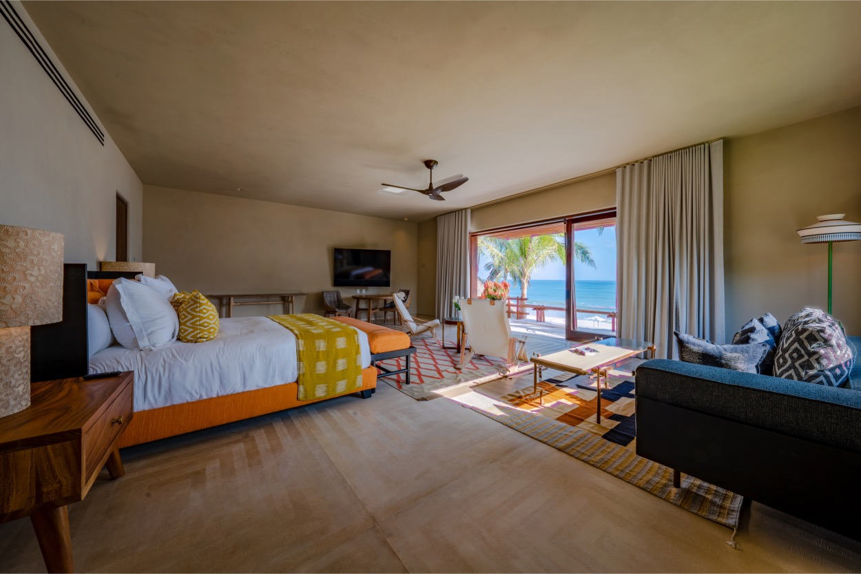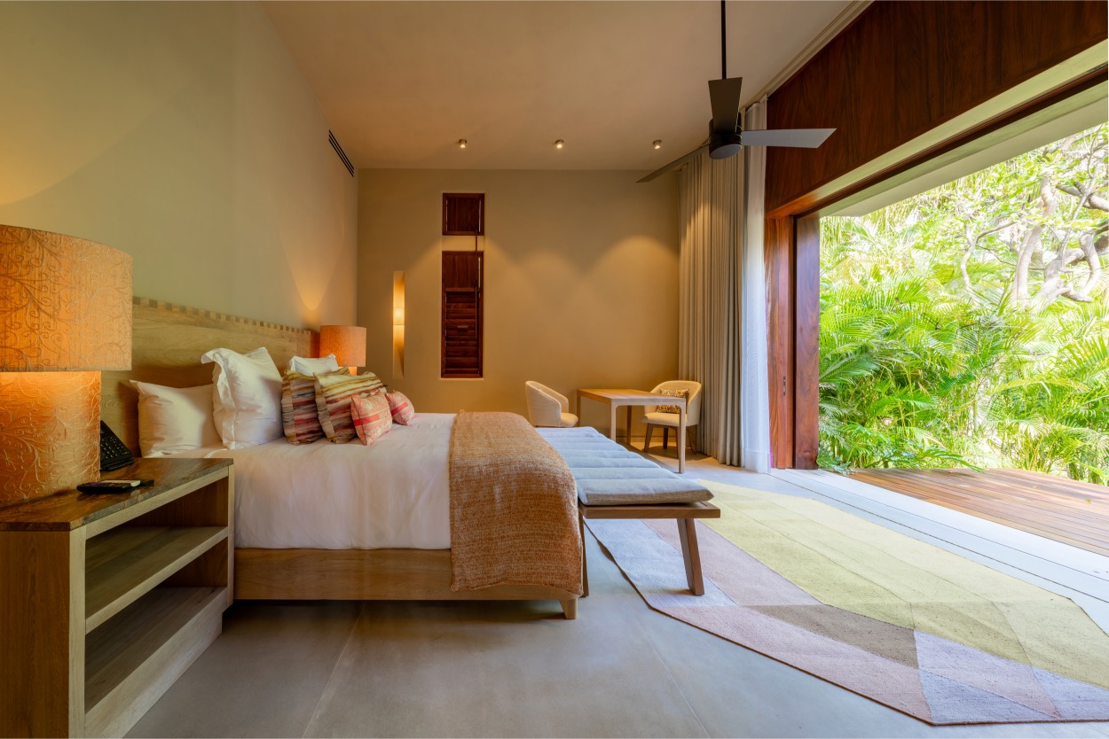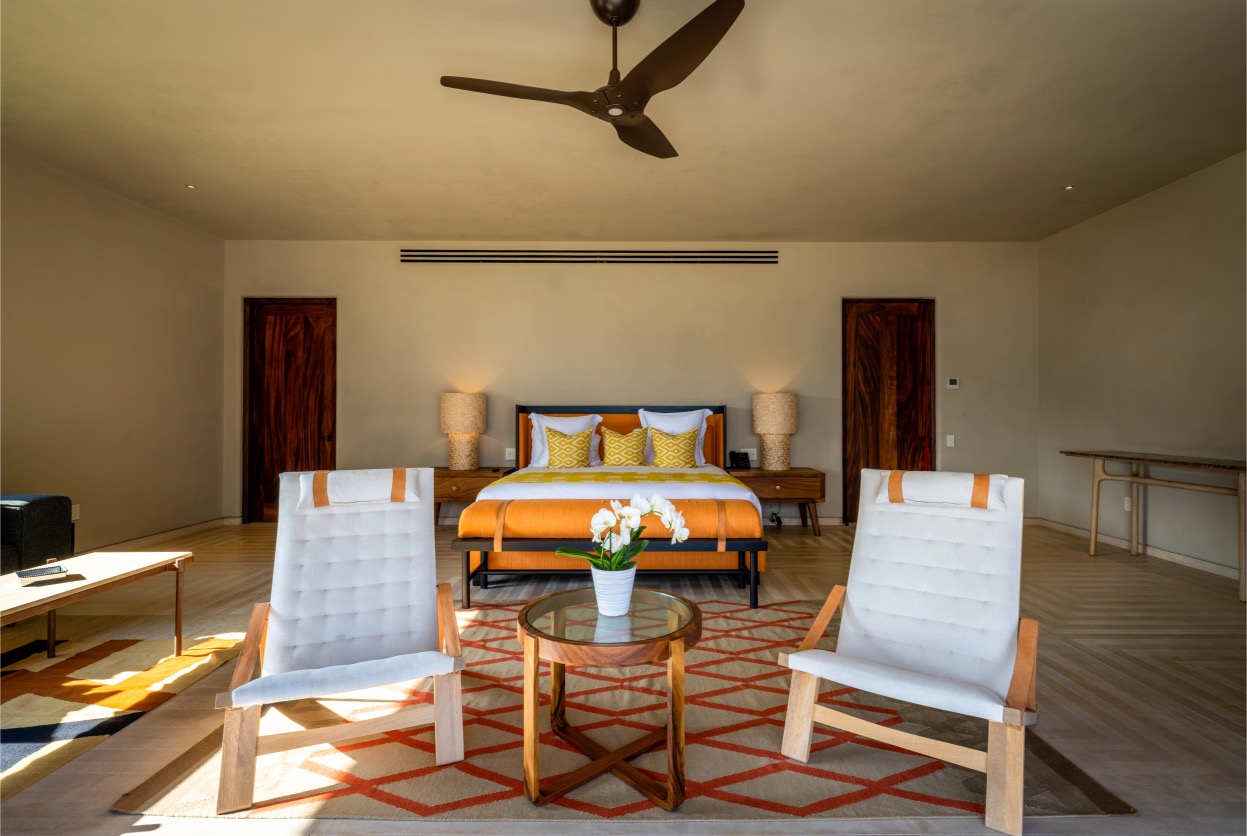 Four oceanfront primary suites plus five additional bedrooms, each with en-suite bath and a private terrace or balcony overlooking the Pacific or the gardens. Discreet tech, plush linens, quiet luxury throughout.