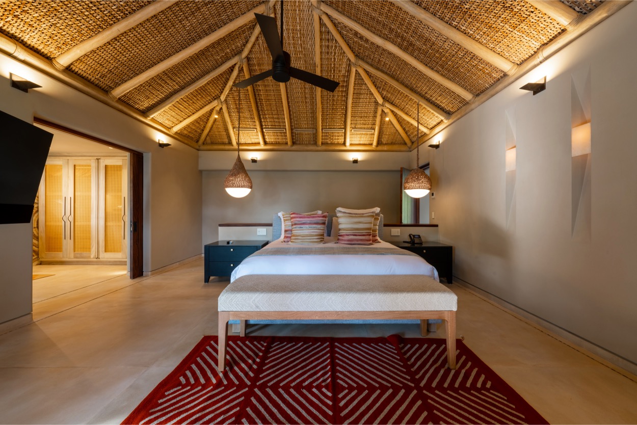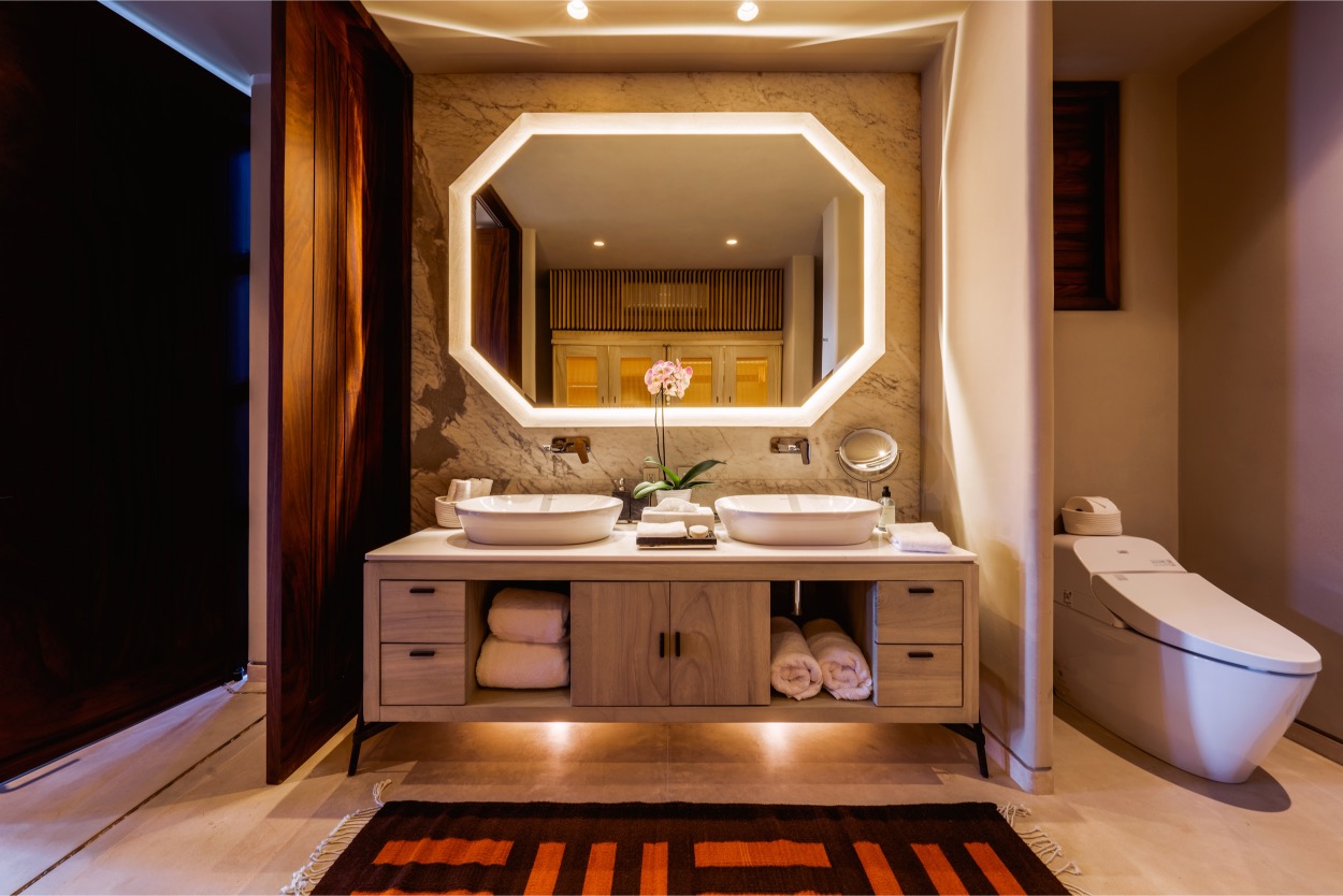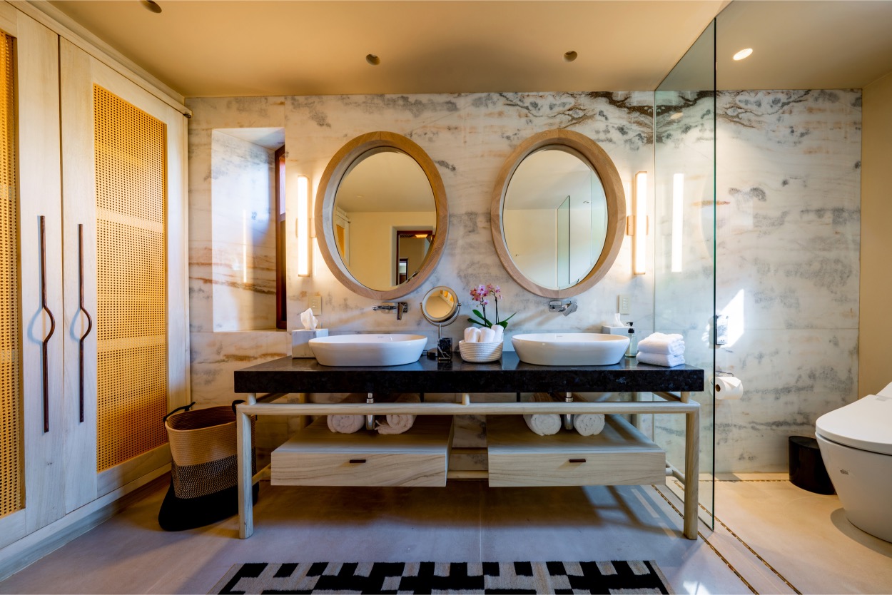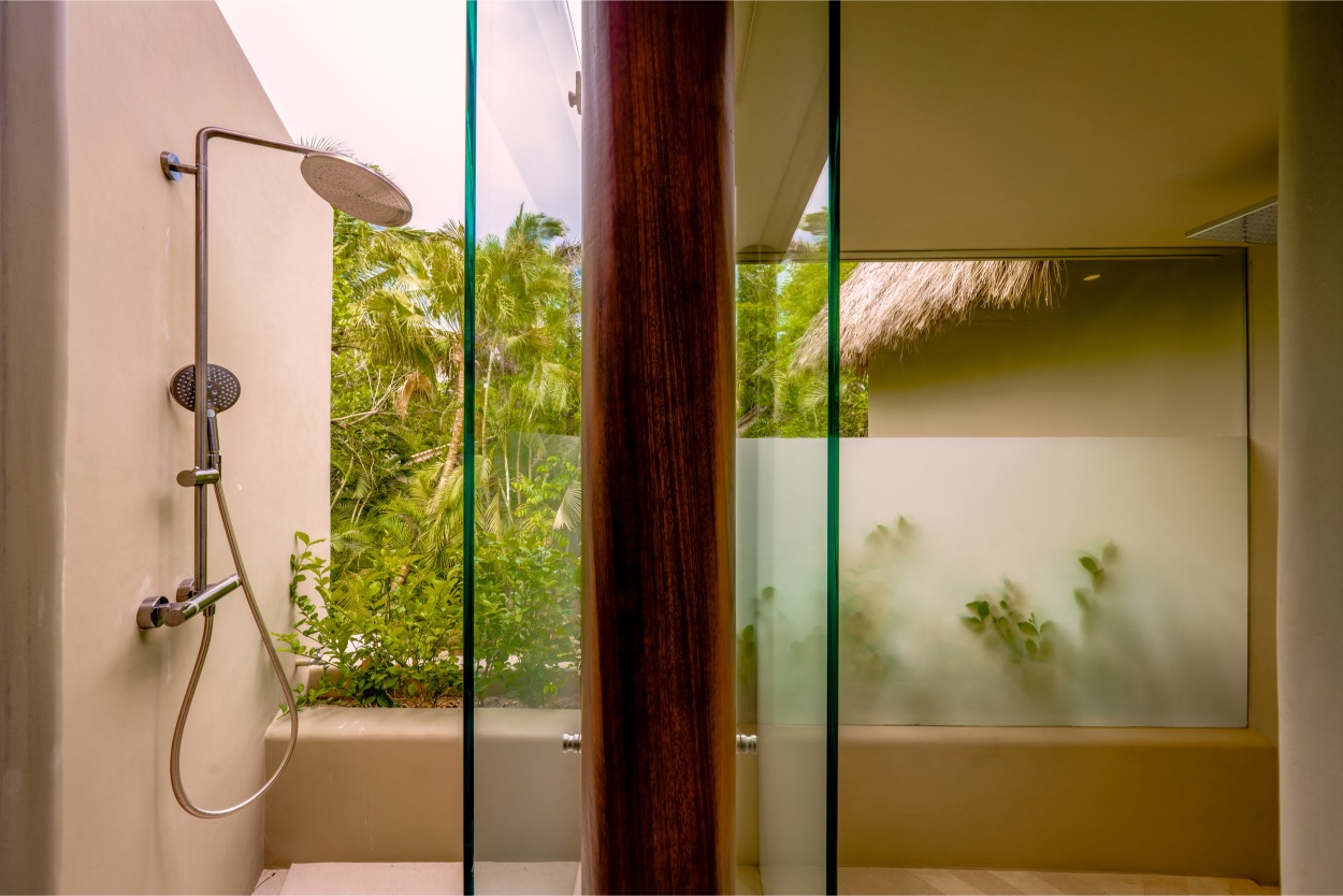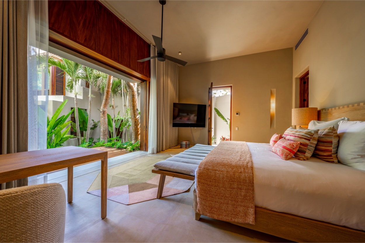 Four oceanfront primary suites plus five additional bedrooms, each with en-suite bath and a private terrace or balcony overlooking the Pacific or the gardens. Discreet tech, plush linens, quiet luxury throughout.