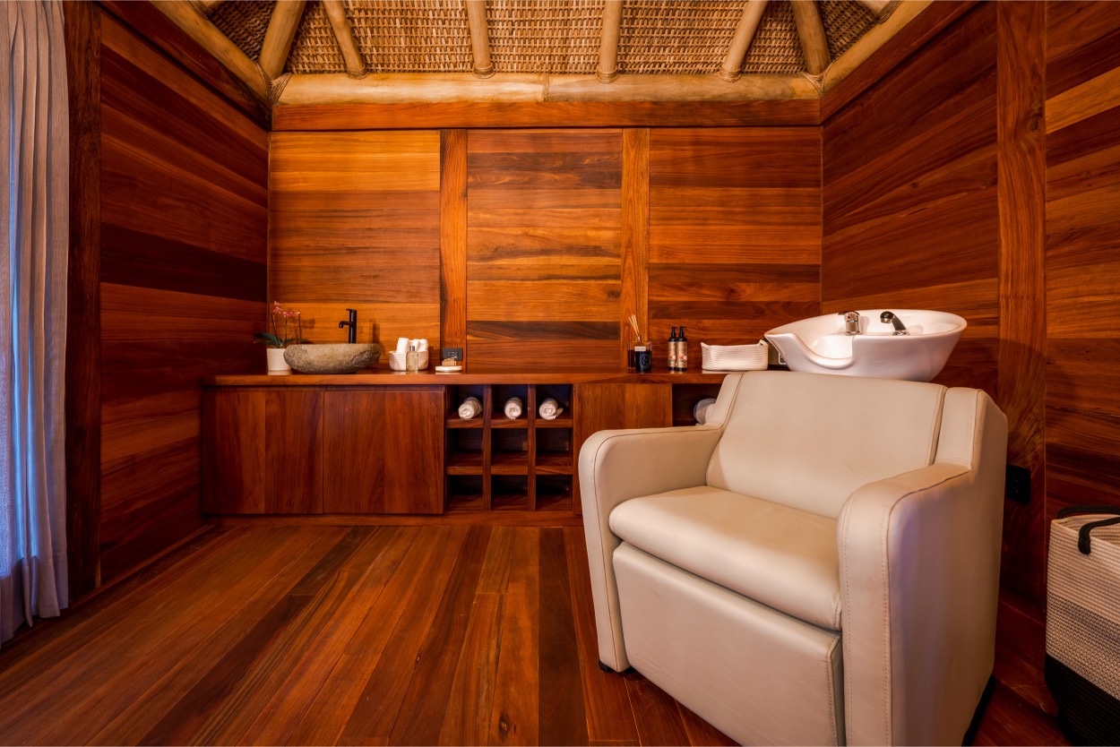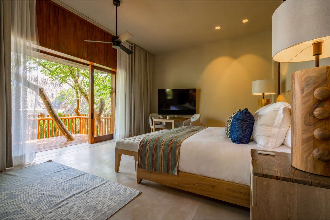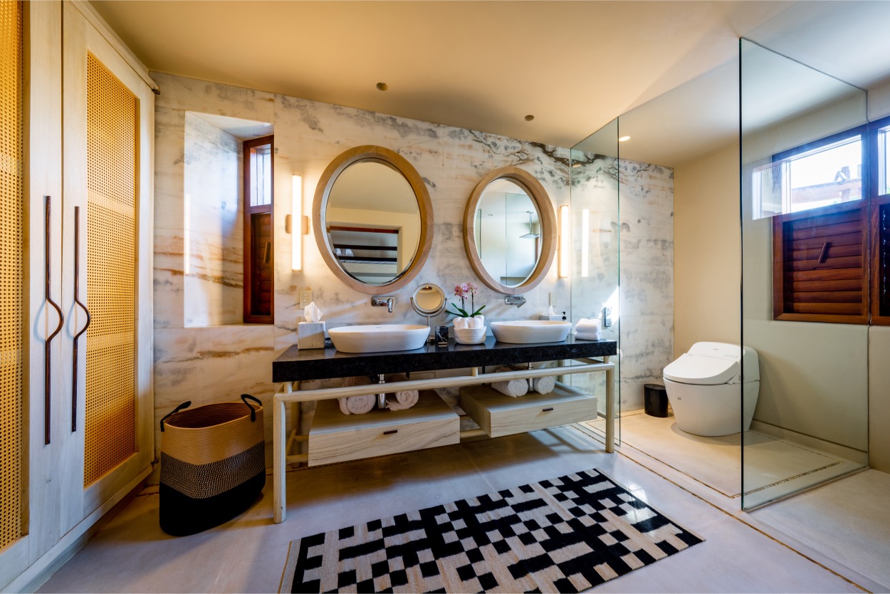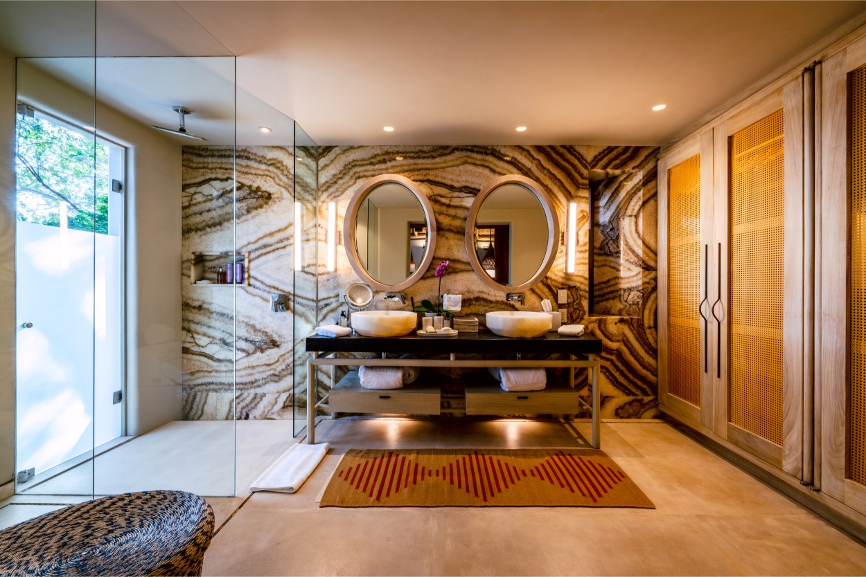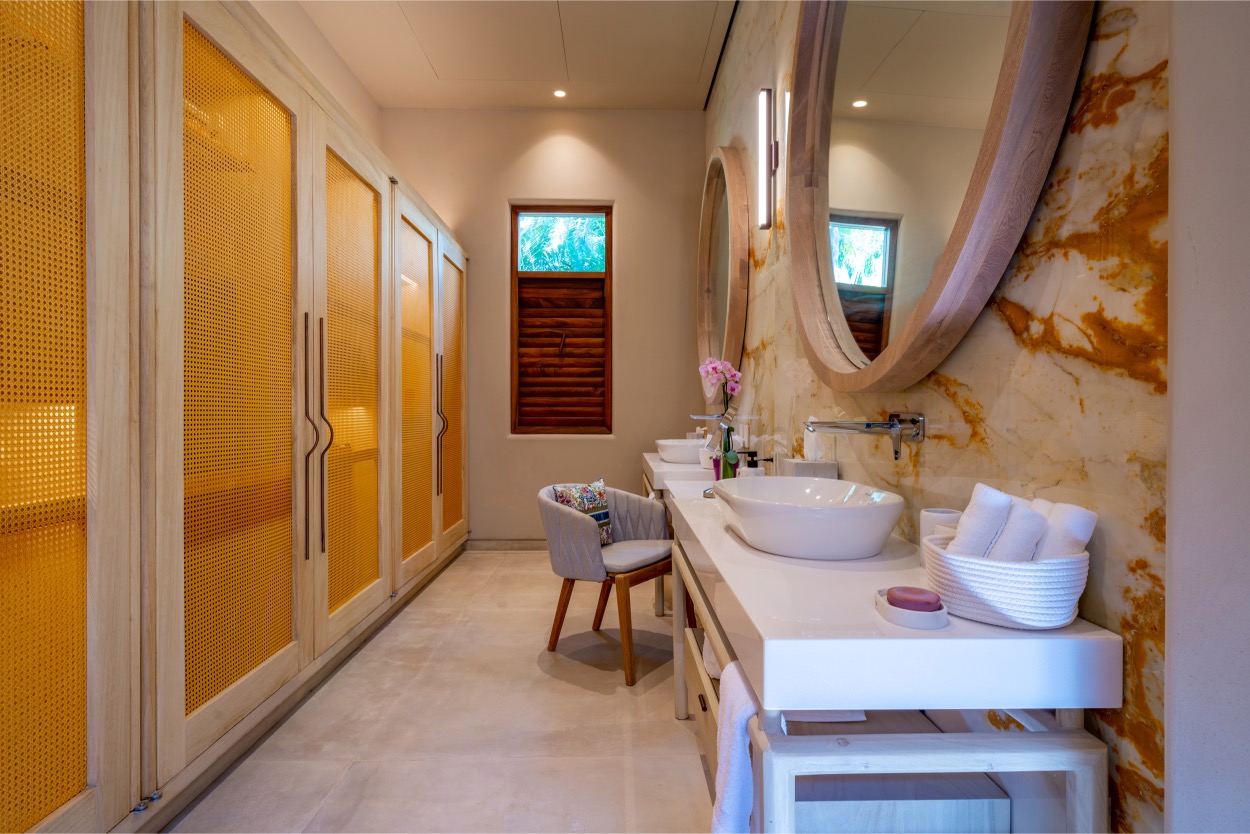Four oceanfront primary suites plus five additional bedrooms, each with en-suite bath and a private terrace or balcony overlooking the Pacific or the gardens. Discreet tech, plush linens, quiet luxury throughout.