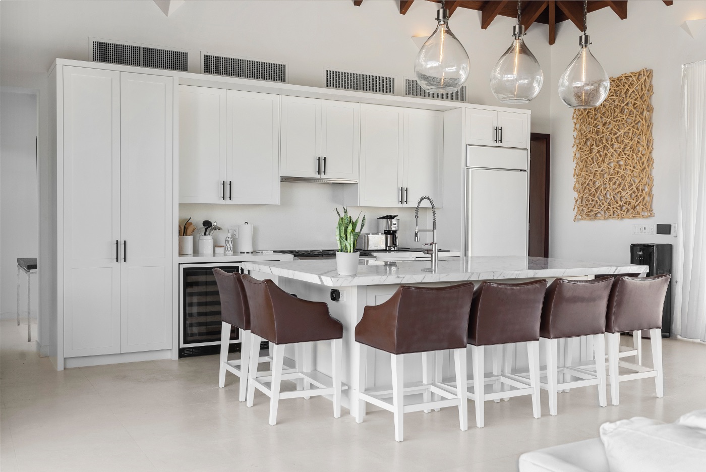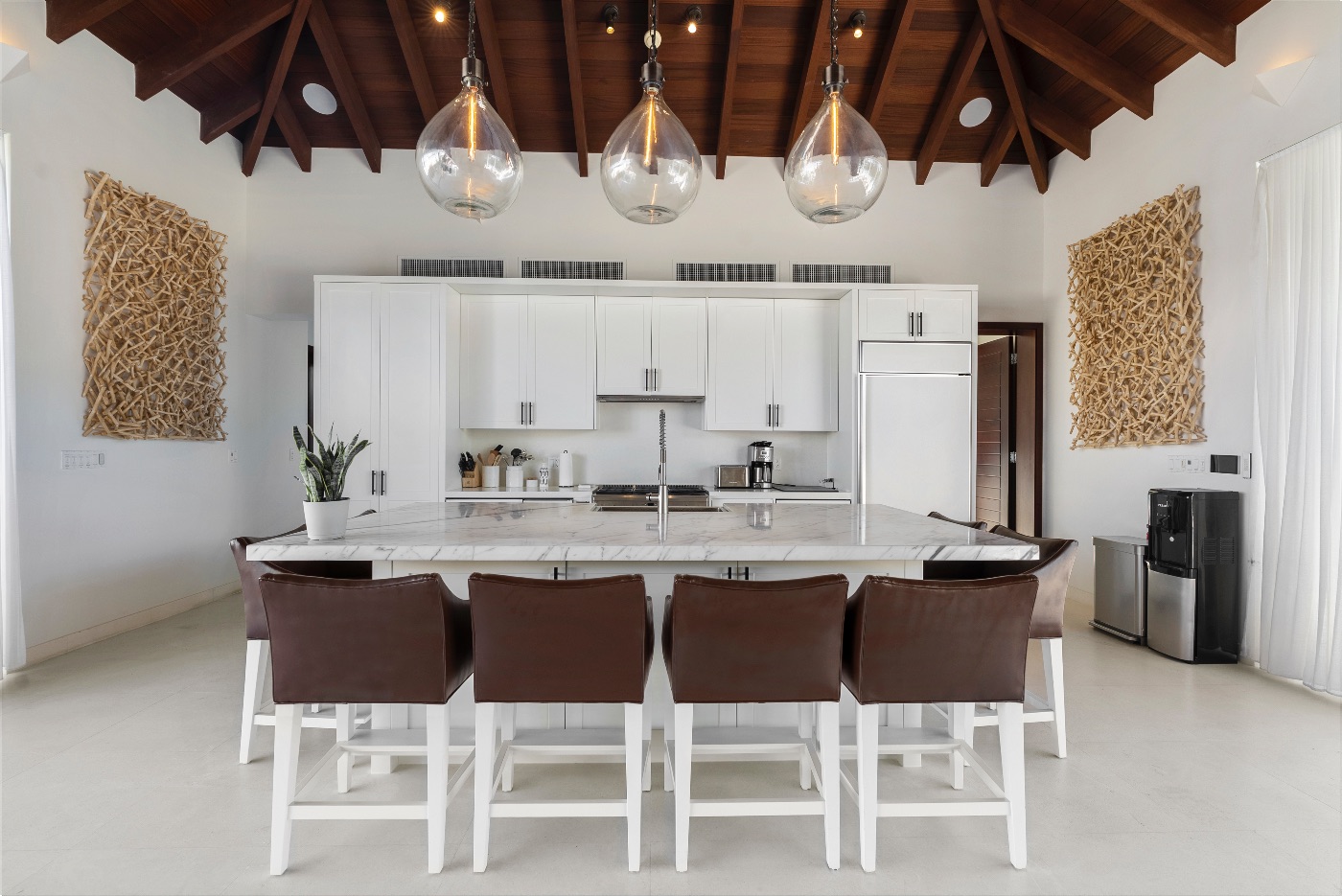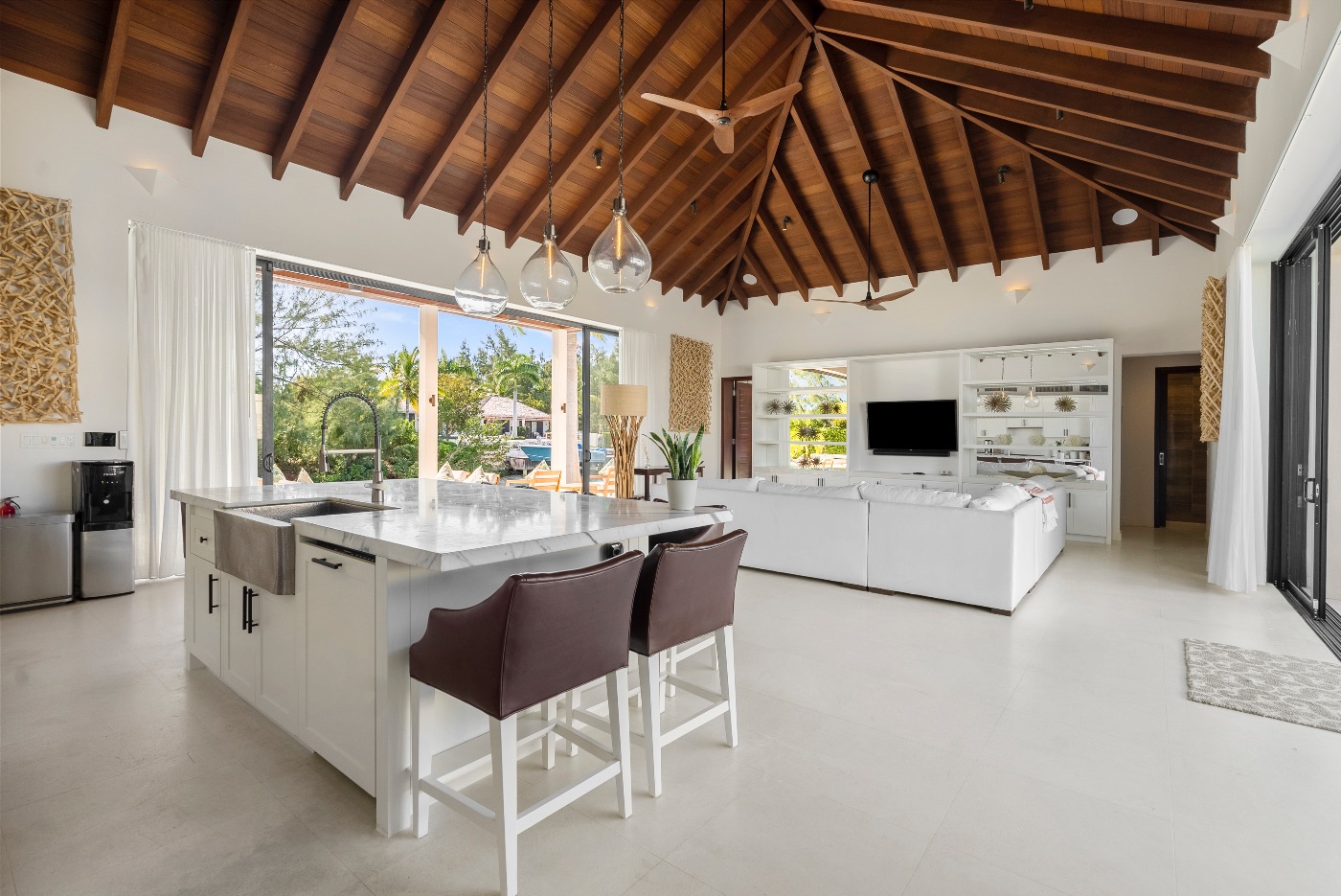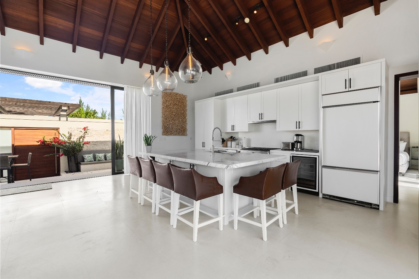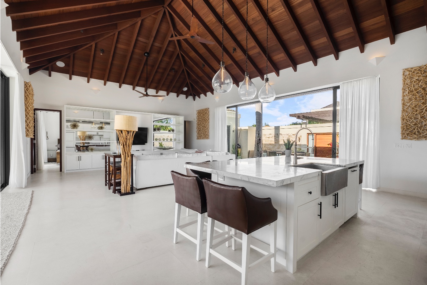 The villa’s open-concept layout brings together a generous main living area, a fully equipped chef’s kitchen, a kitchenette and bar, and seamless indoor-outdoor transitions. Motorized blinds and ceiling fans offer comfort throughout the day, while fire pits and outdoor lighting create a magical evening ambiance.