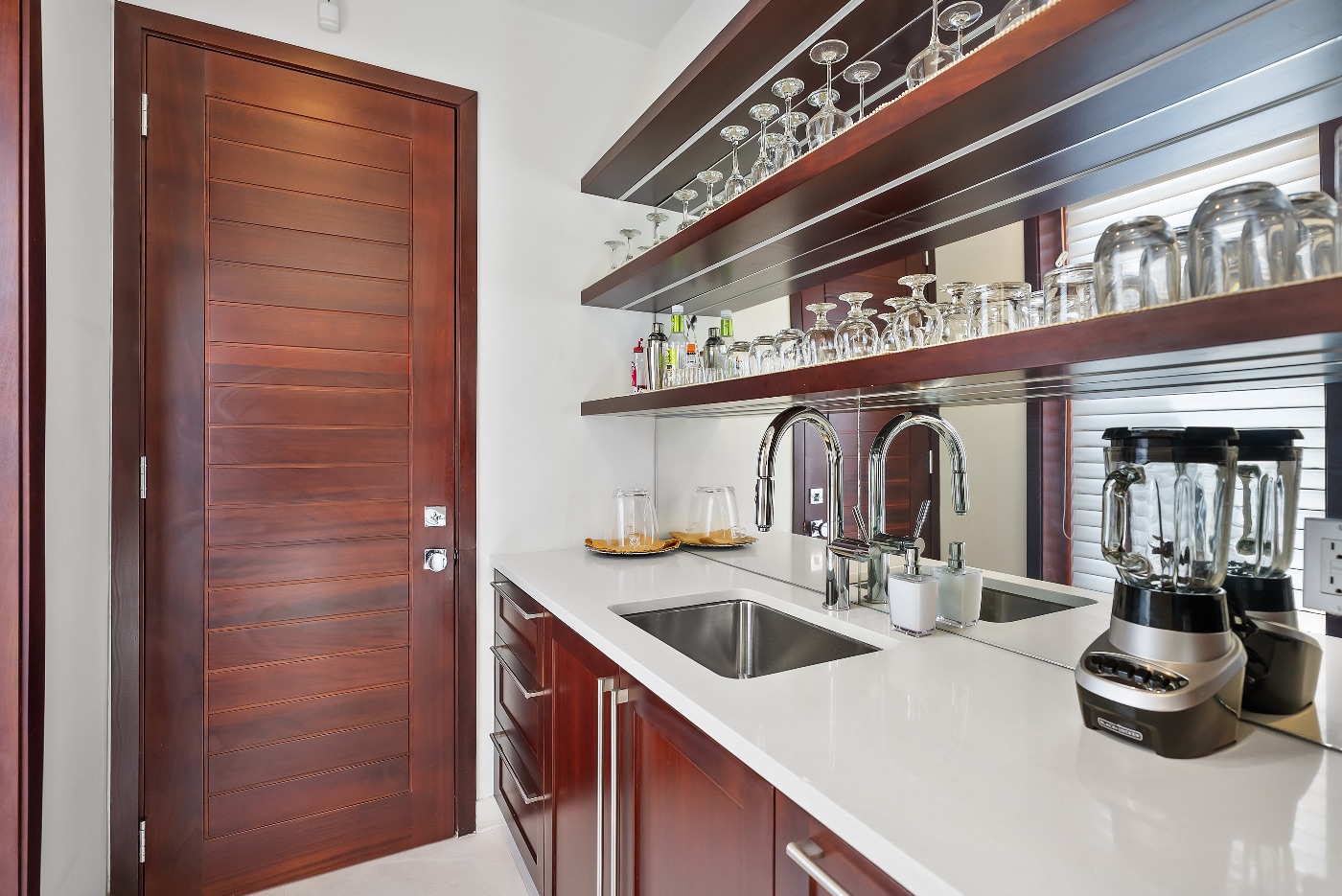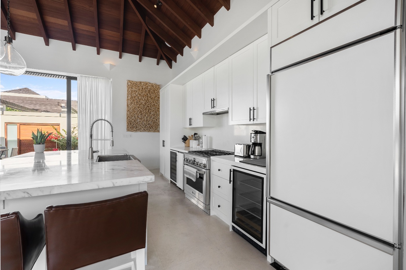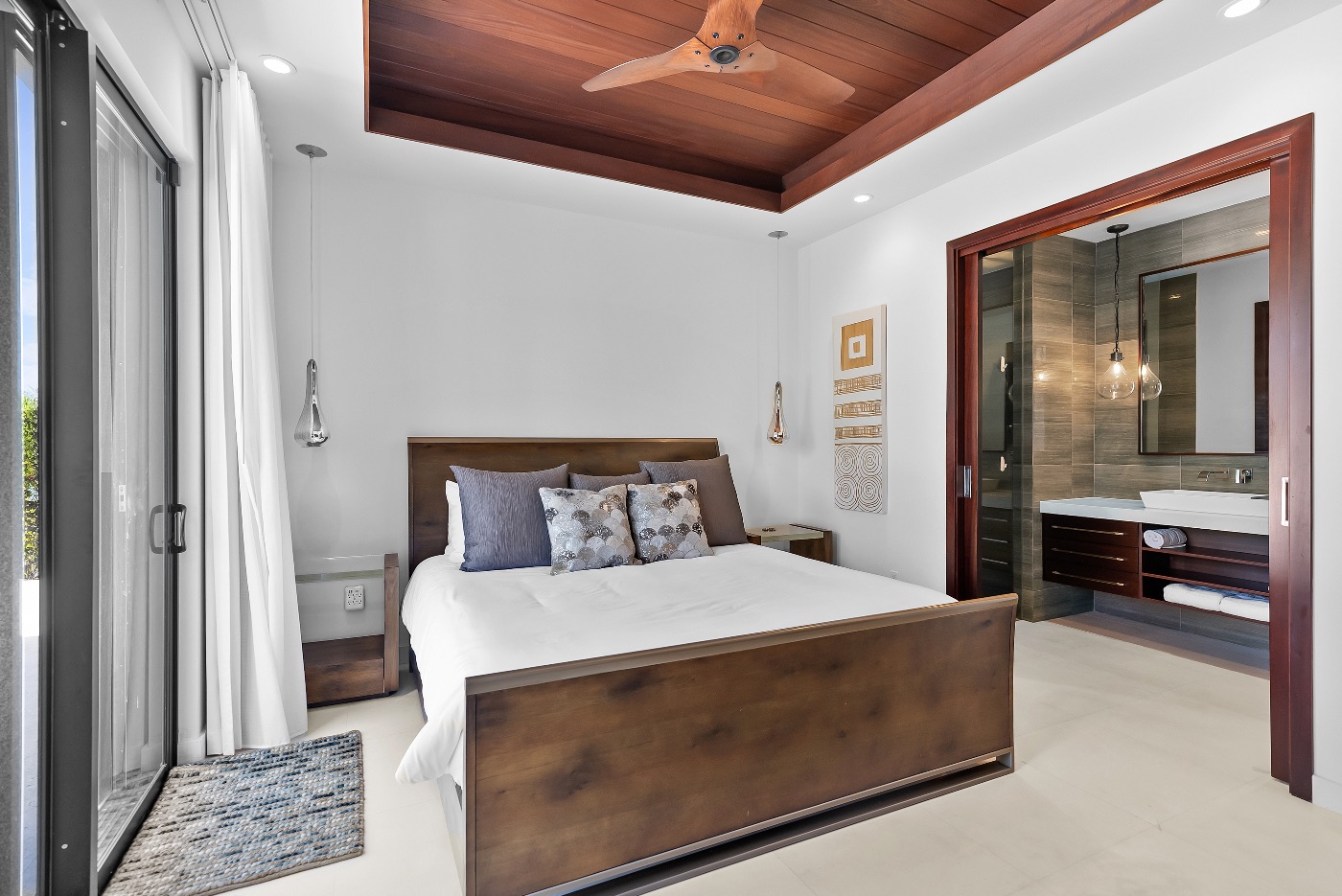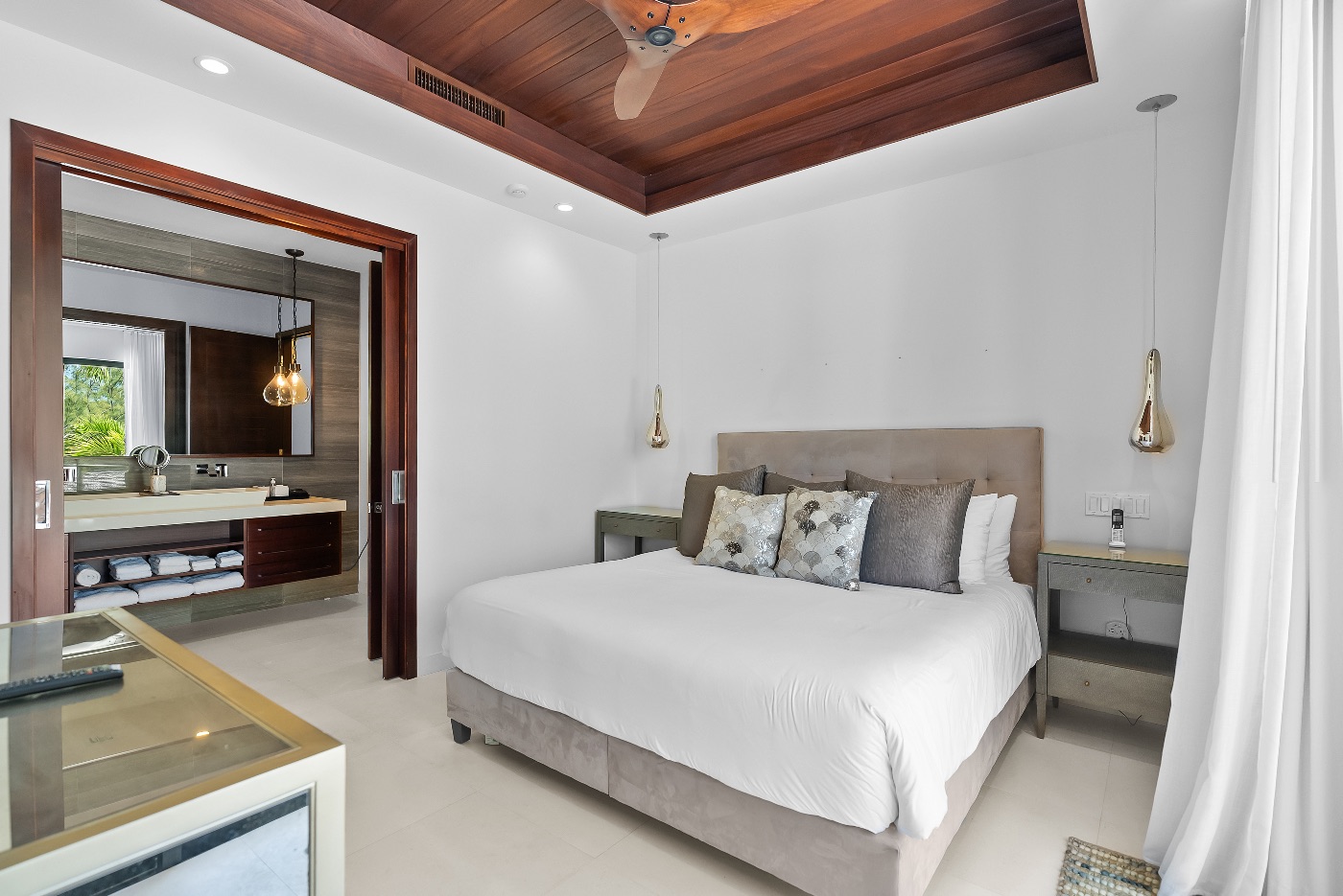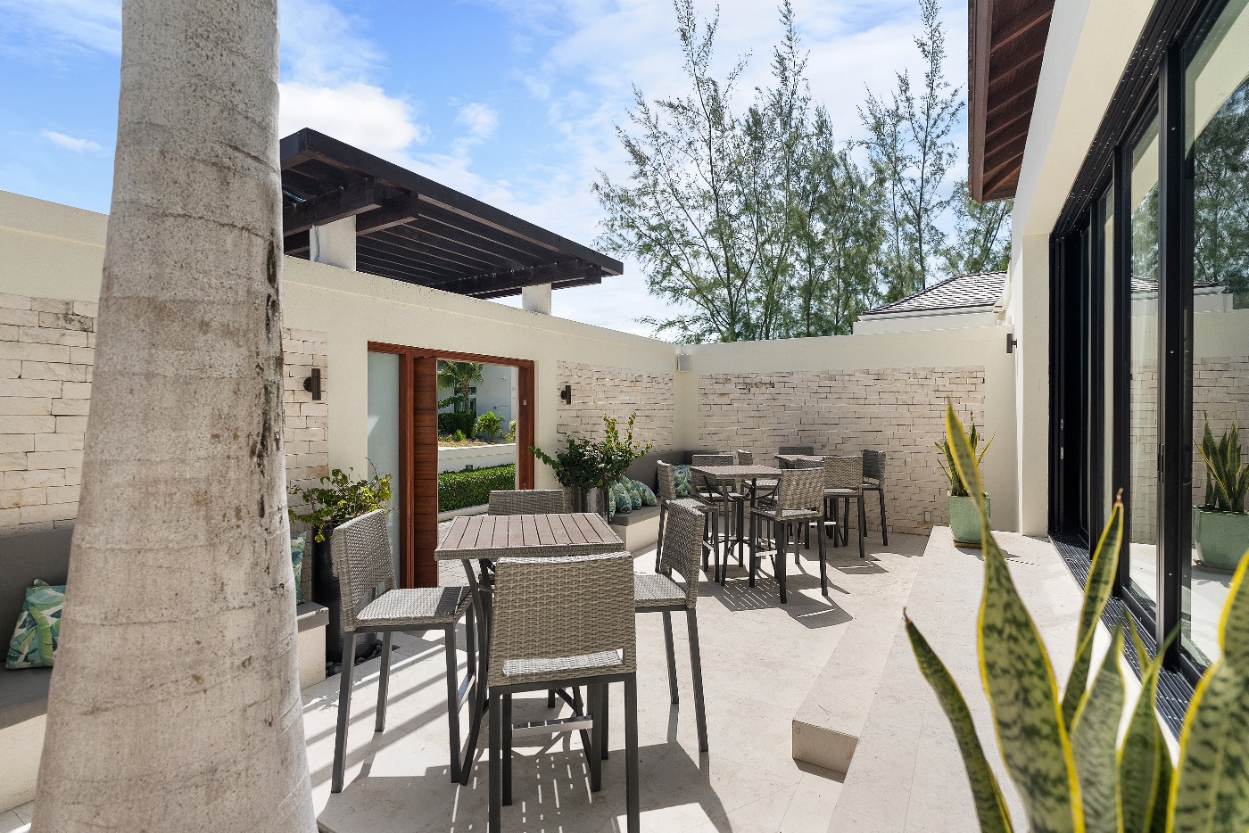 The villa’s open-concept layout brings together a generous main living area, a fully equipped chef’s kitchen, a kitchenette and bar, and seamless indoor-outdoor transitions. Motorized blinds and ceiling fans offer comfort throughout the day, while fire pits and outdoor lighting create a magical evening ambiance.