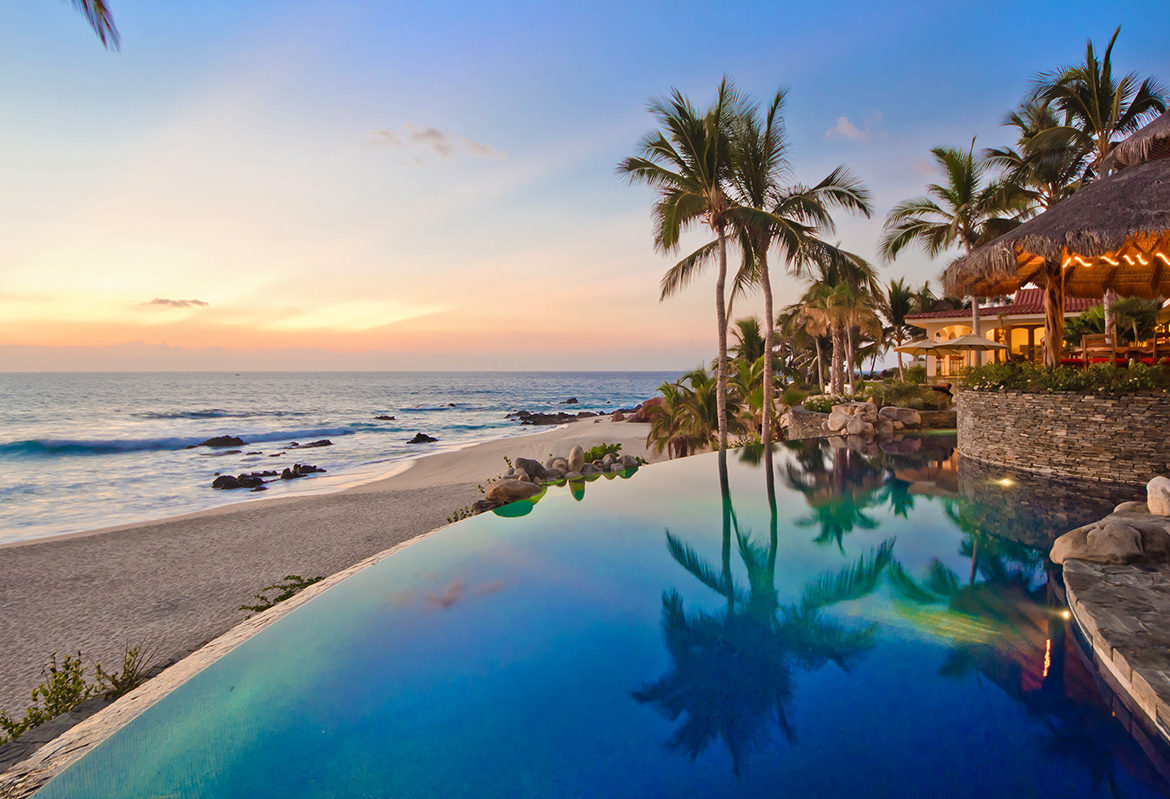 Mornings begin to the soft percussion of waves and the rustle of more than a hundred palms—coconuts and Washingtonians swaying above a beach that feels borrowed from an older Los Cabos. By late afternoon, everyone congregates on the terrace for that leisurely hour when the day determines what will happen next, the light turns honey-gold, and the piano takes over the great room.
