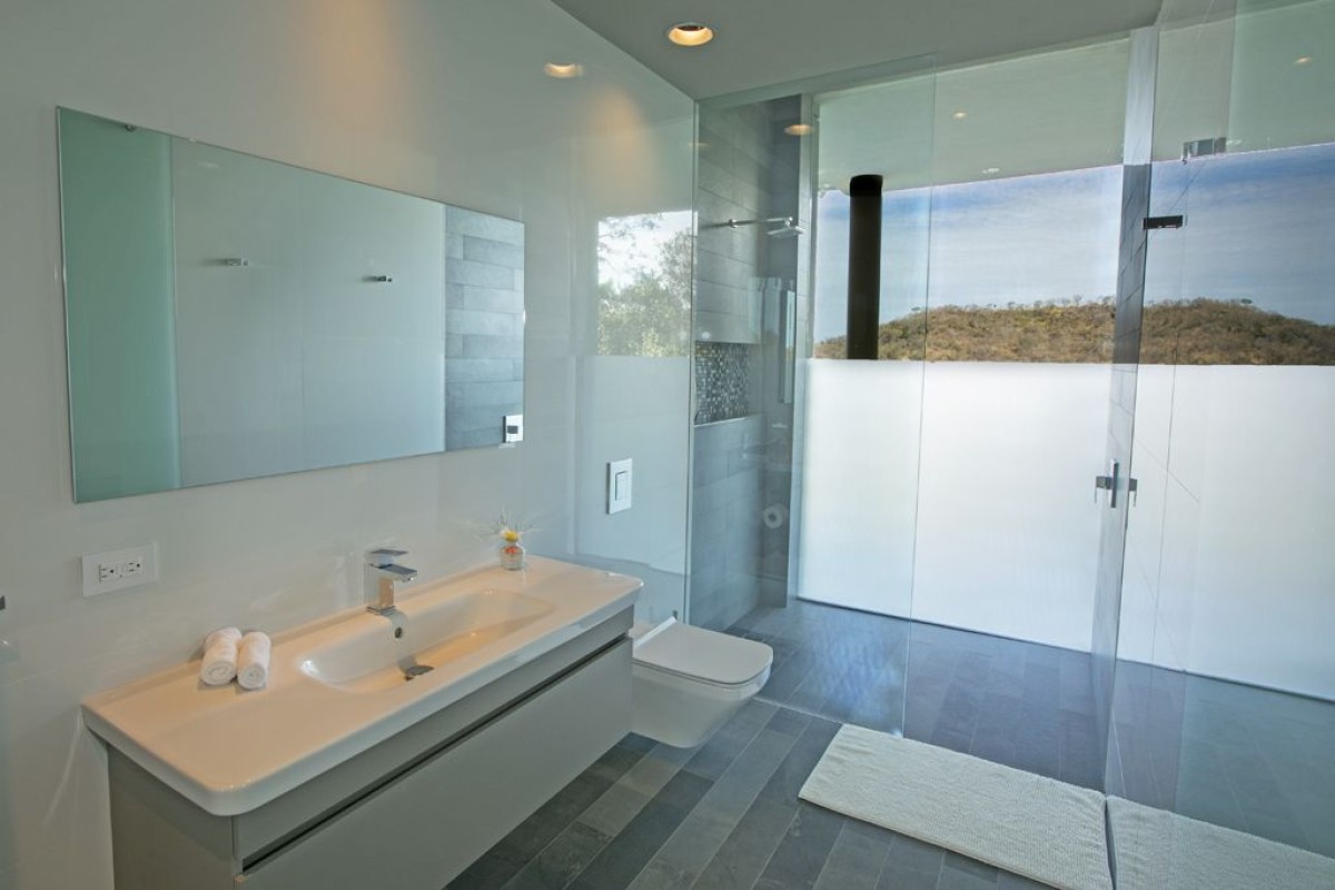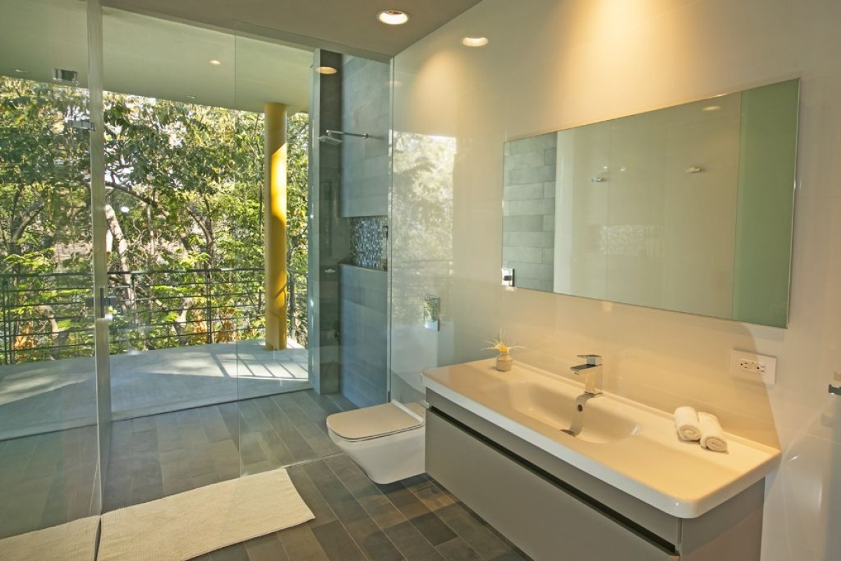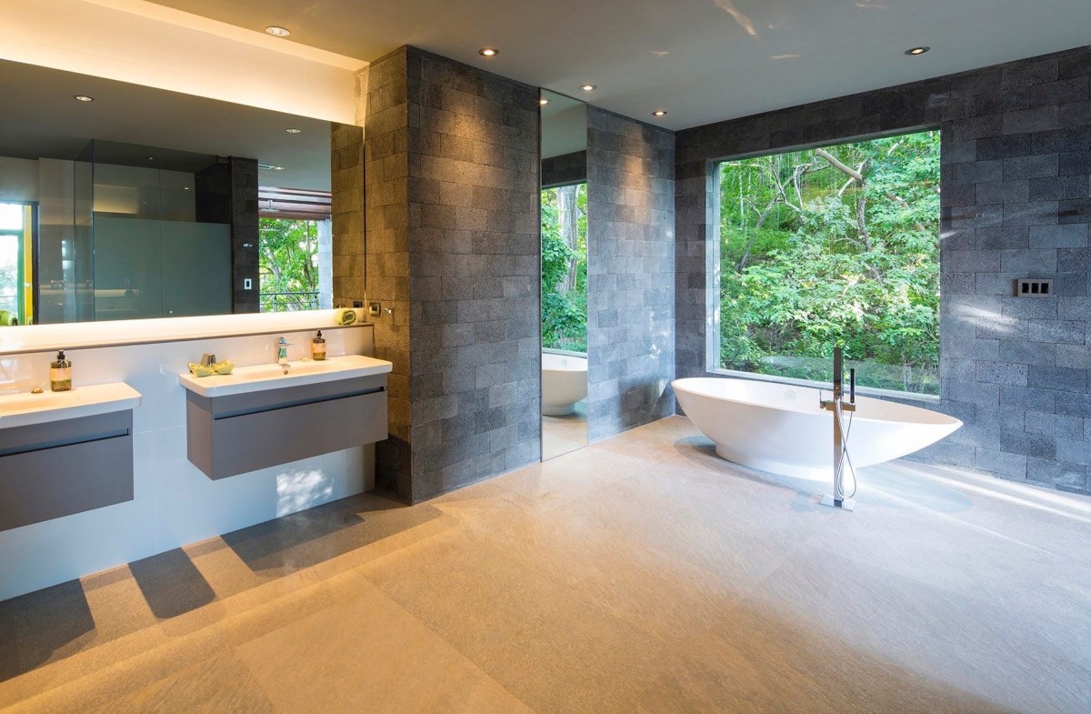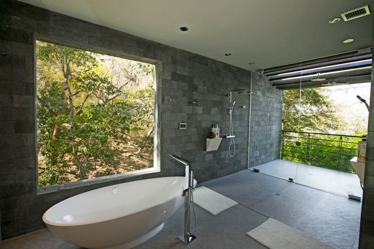 Primary suite with open-air shower and freestanding tub oriented to lush, unbroken vistas.