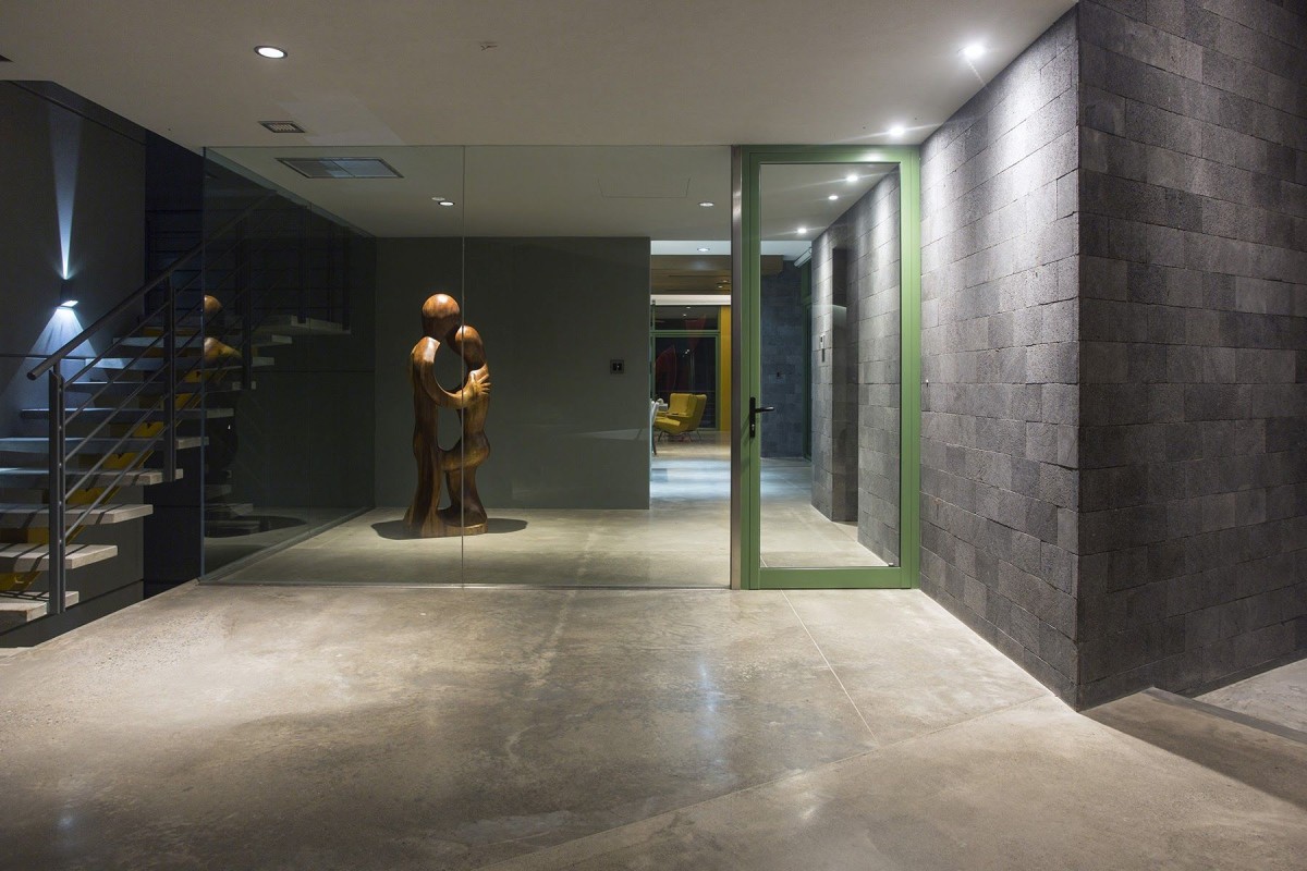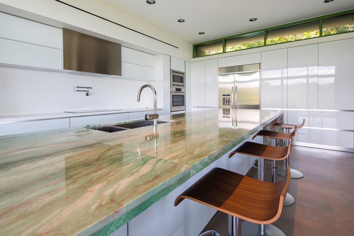 Material palette: polished concrete, warm wood ceilings, custom millwork, and an exotic green-granite kitchen island.