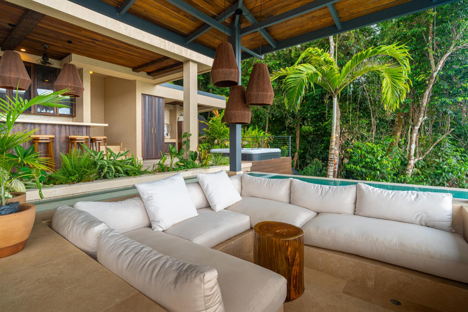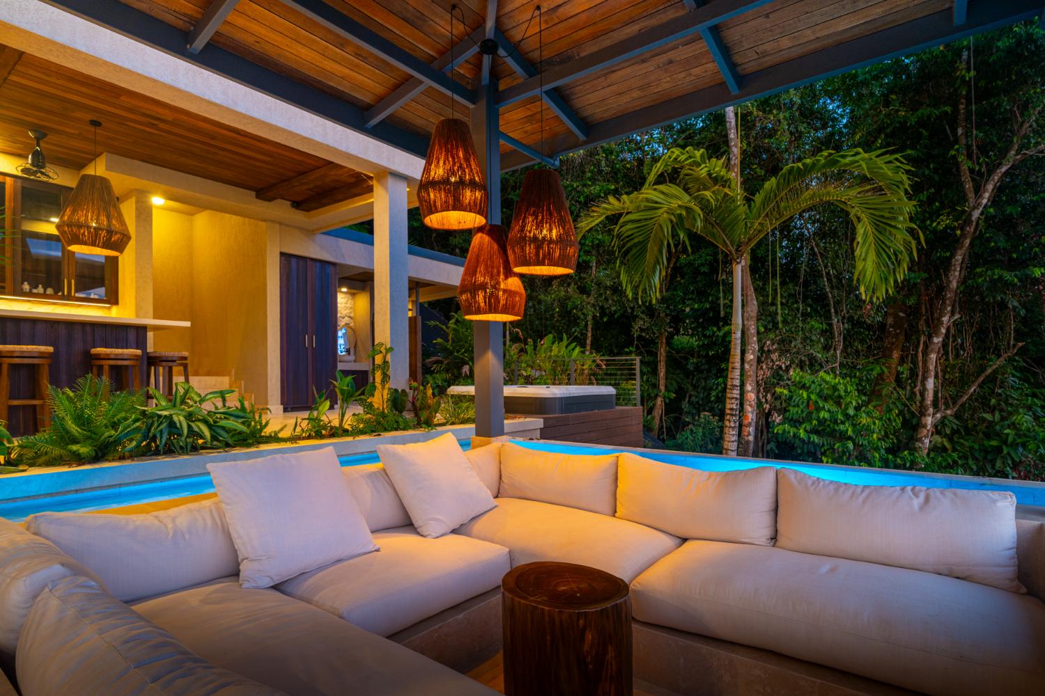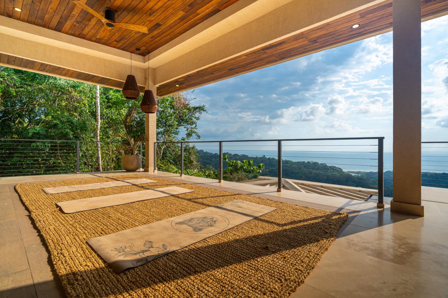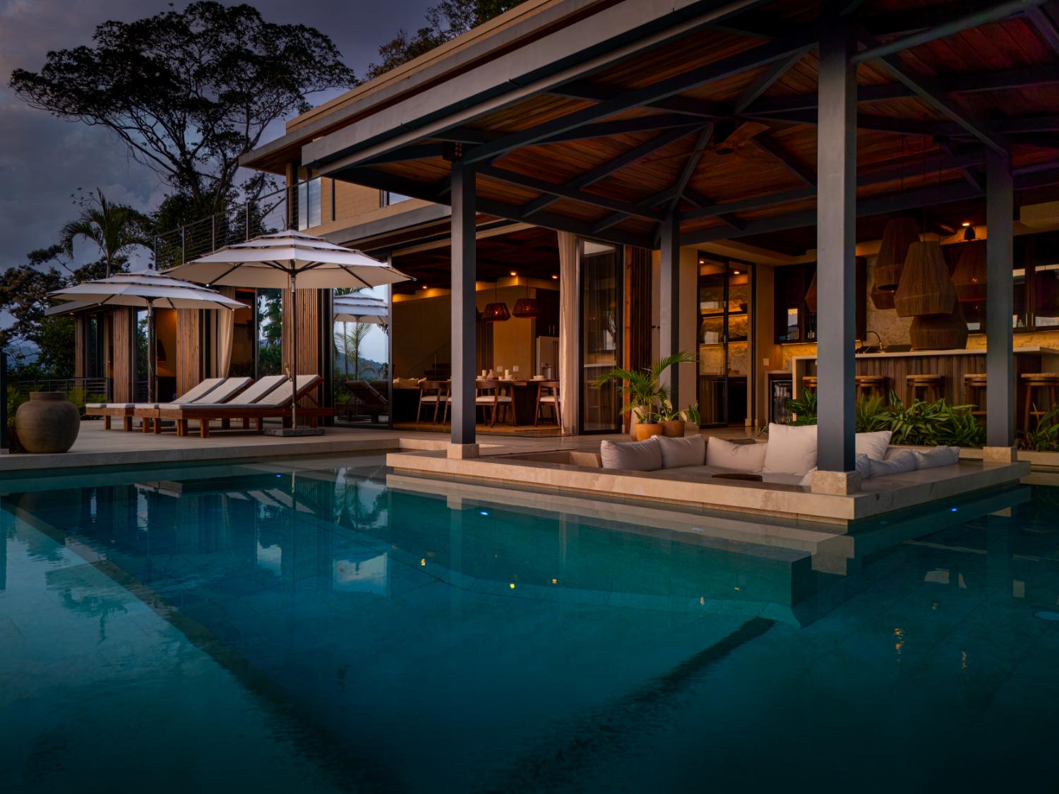 A hot tub faces the sunset, an outdoor bathroom and double shower make pool days easy, and a sunken lounge beneath a shaded pergola creates a natural setting for aperitifs, conversation, and the kind of evenings that stretch beautifully into night. A yoga deck above the terrace, together with mats, workout bands, and a Sonos sound system, adds a thoughtful wellness layer that many Costa Rica Villas near Dominical simply do not offer.