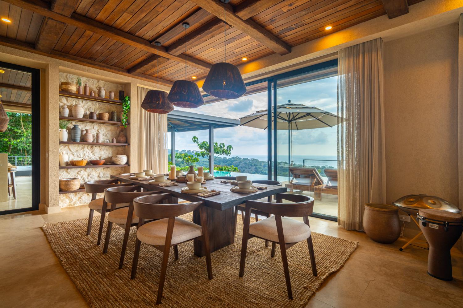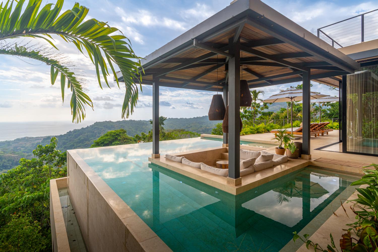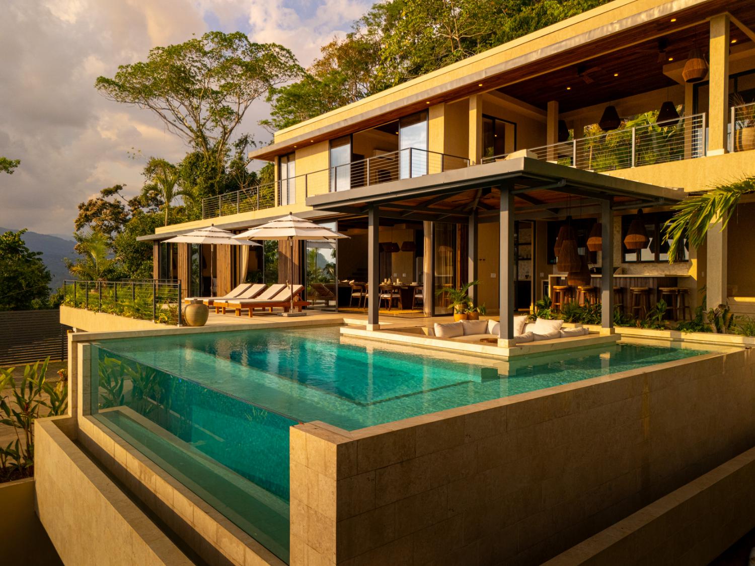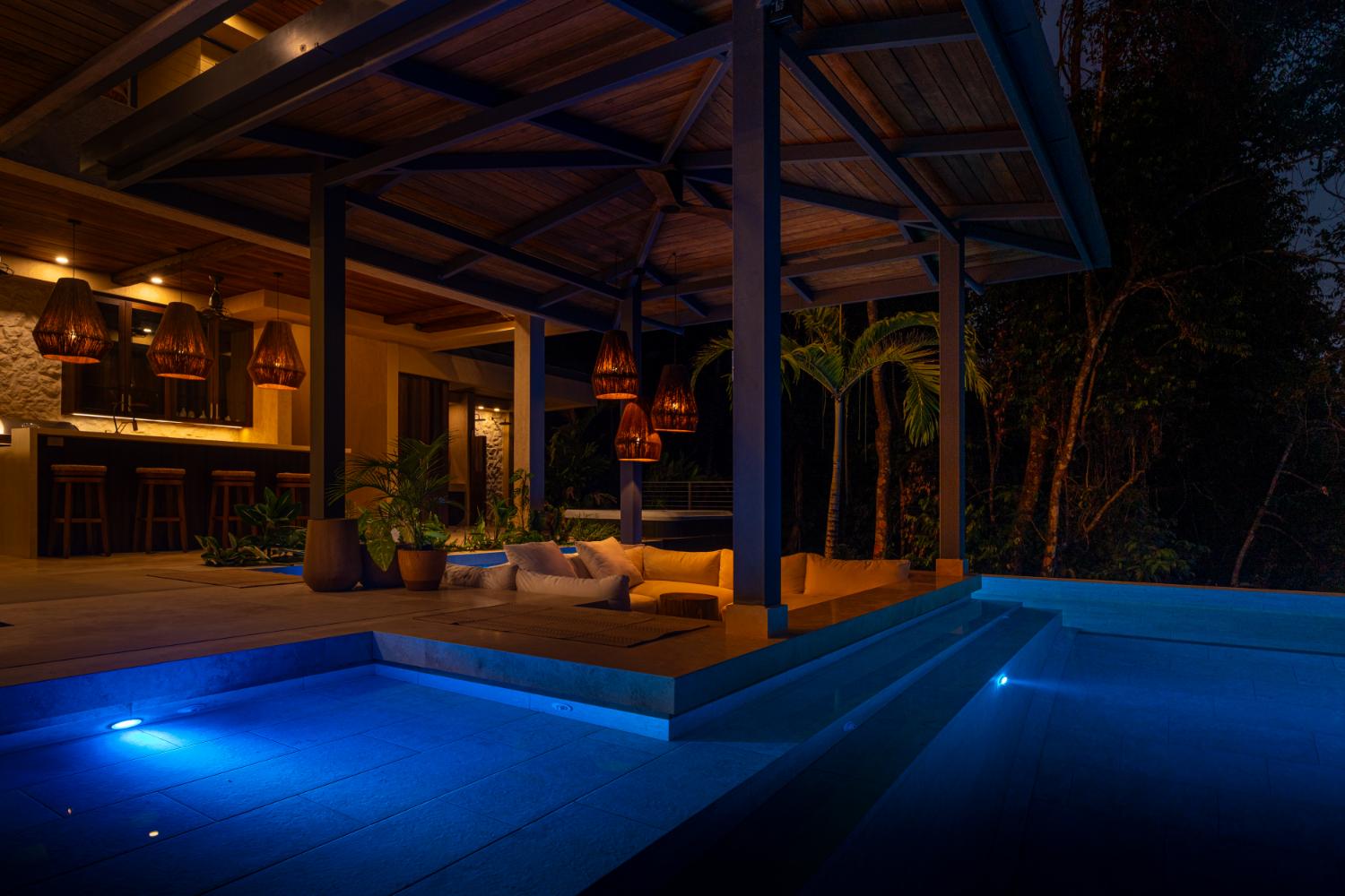 A hot tub faces the sunset, an outdoor bathroom and double shower make pool days easy, and a sunken lounge beneath a shaded pergola creates a natural setting for aperitifs, conversation, and the kind of evenings that stretch beautifully into night. A yoga deck above the terrace, together with mats, workout bands, and a Sonos sound system, adds a thoughtful wellness layer that many Costa Rica Villas near Dominical simply do not offer.