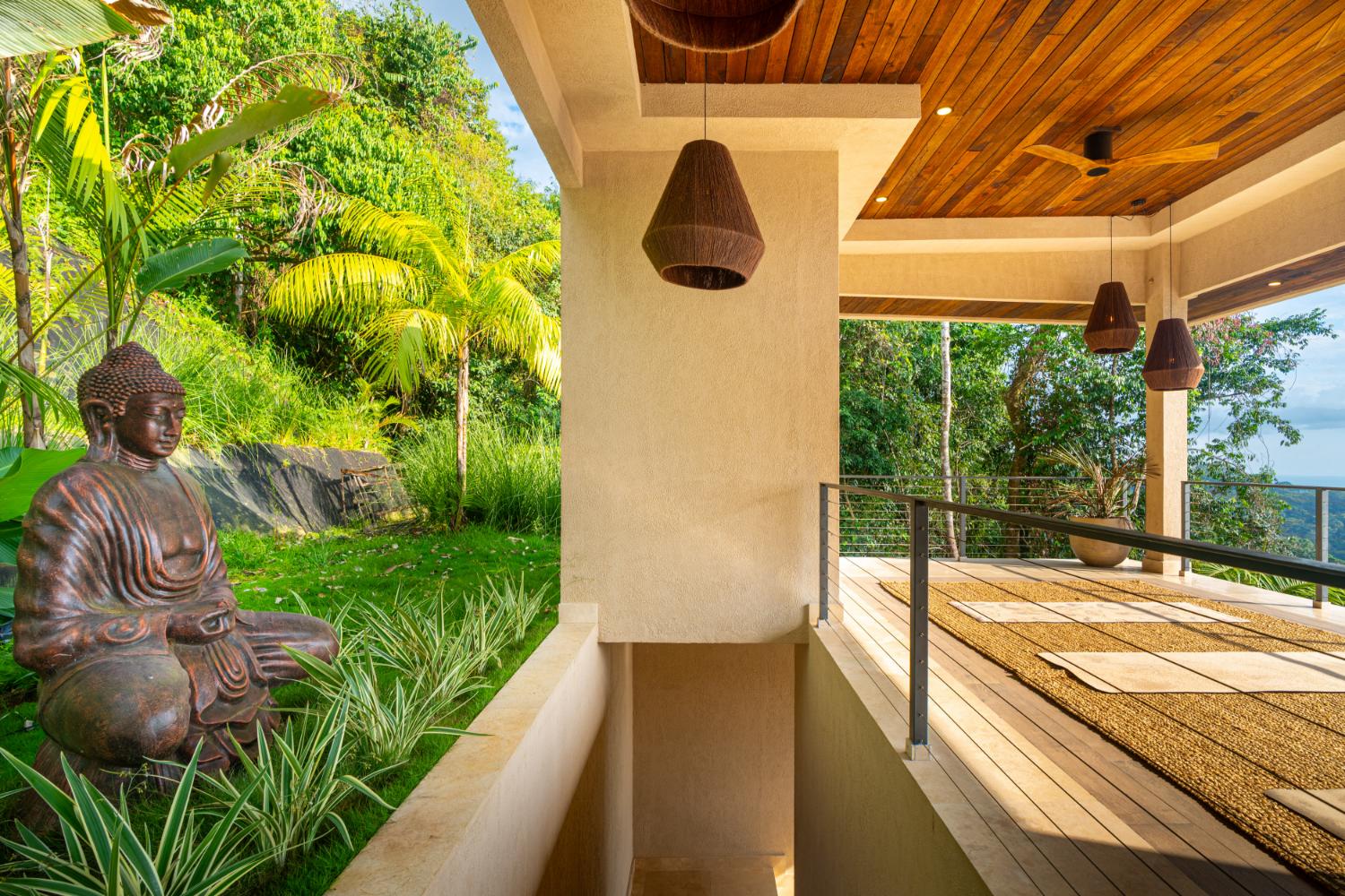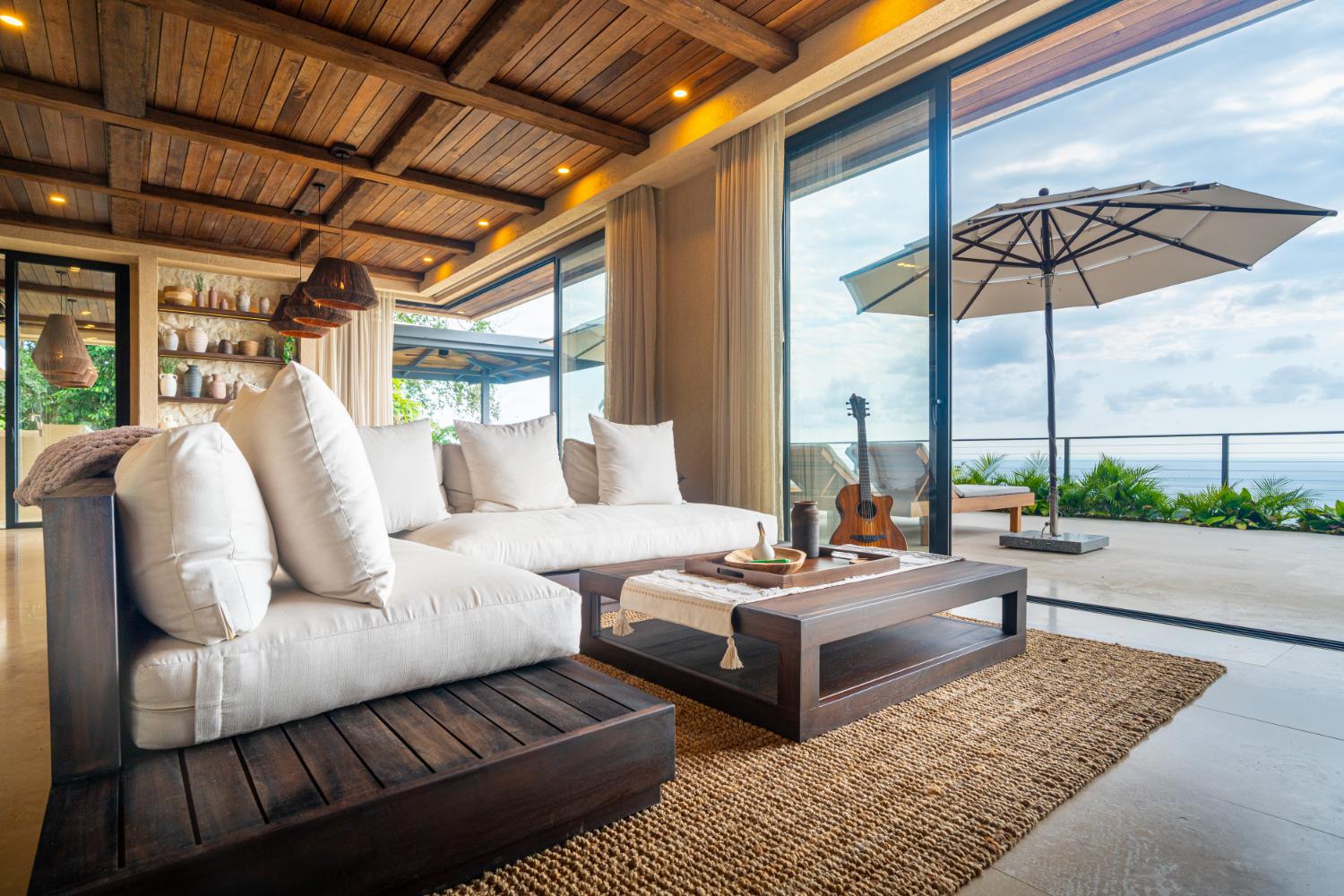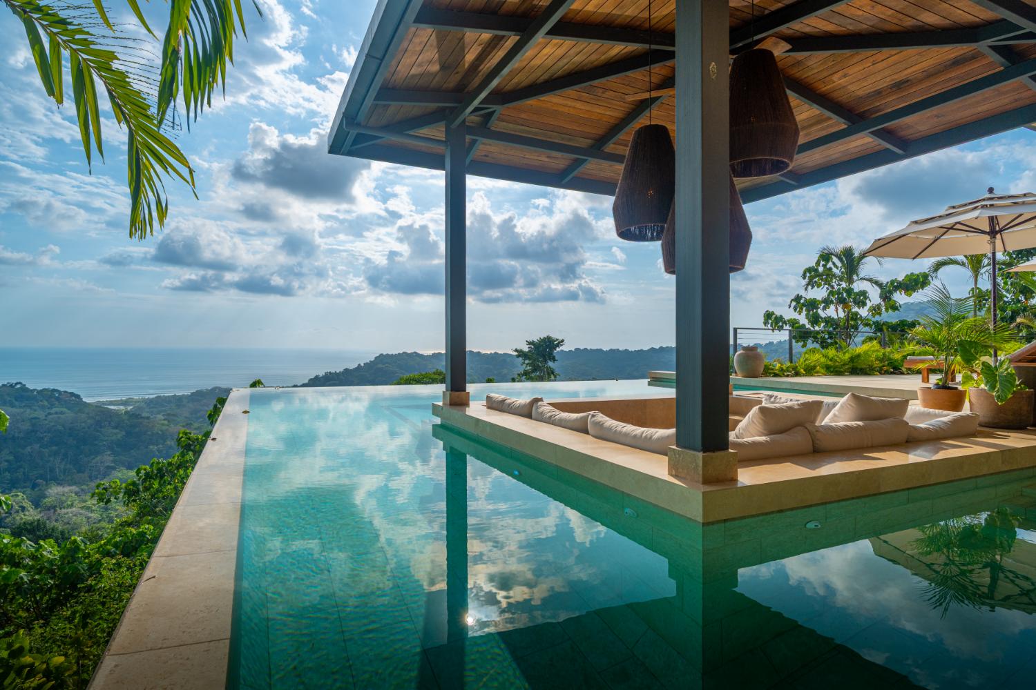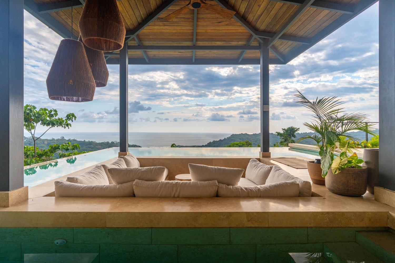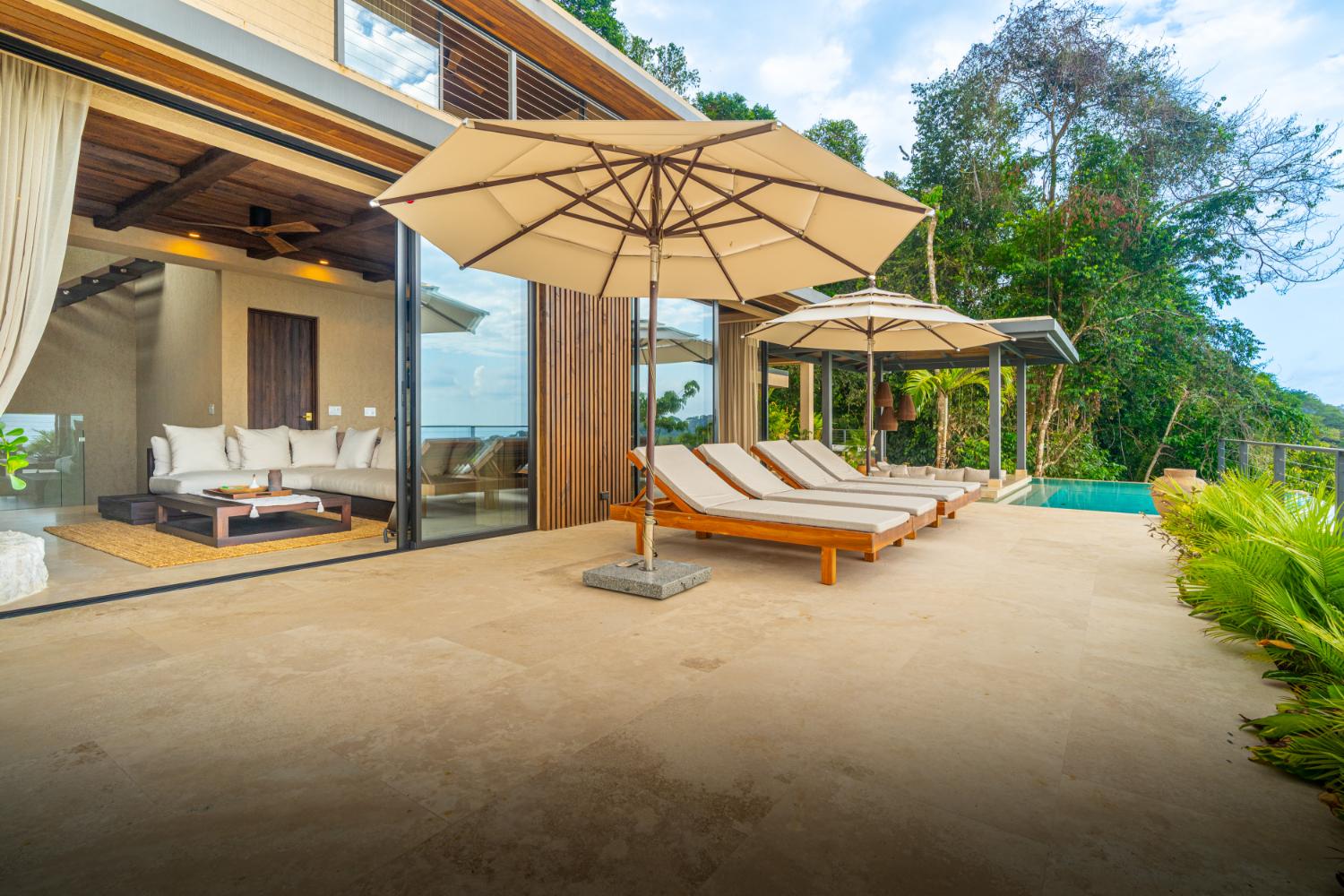 A hot tub faces the sunset, an outdoor bathroom and double shower make pool days easy, and a sunken lounge beneath a shaded pergola creates a natural setting for aperitifs, conversation, and the kind of evenings that stretch beautifully into night. A yoga deck above the terrace, together with mats, workout bands, and a Sonos sound system, adds a thoughtful wellness layer that many Costa Rica Villas near Dominical simply do not offer.