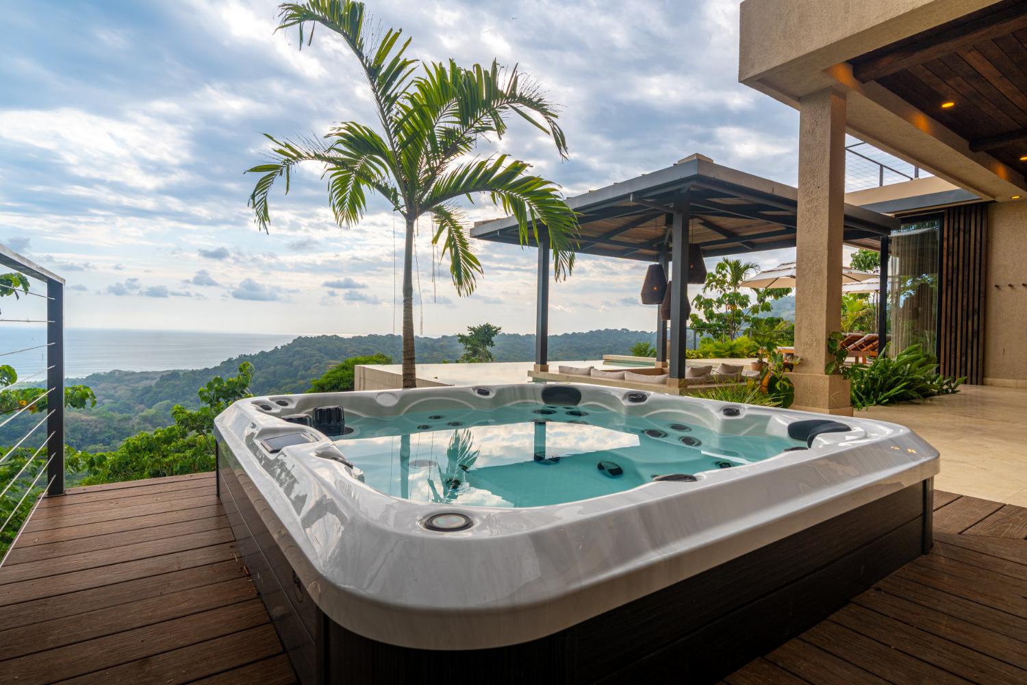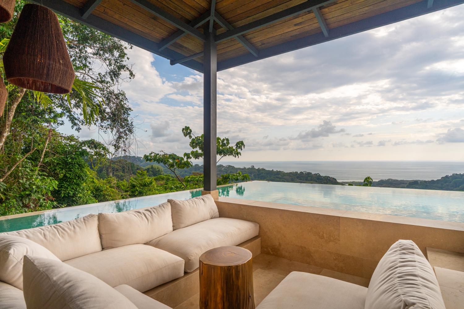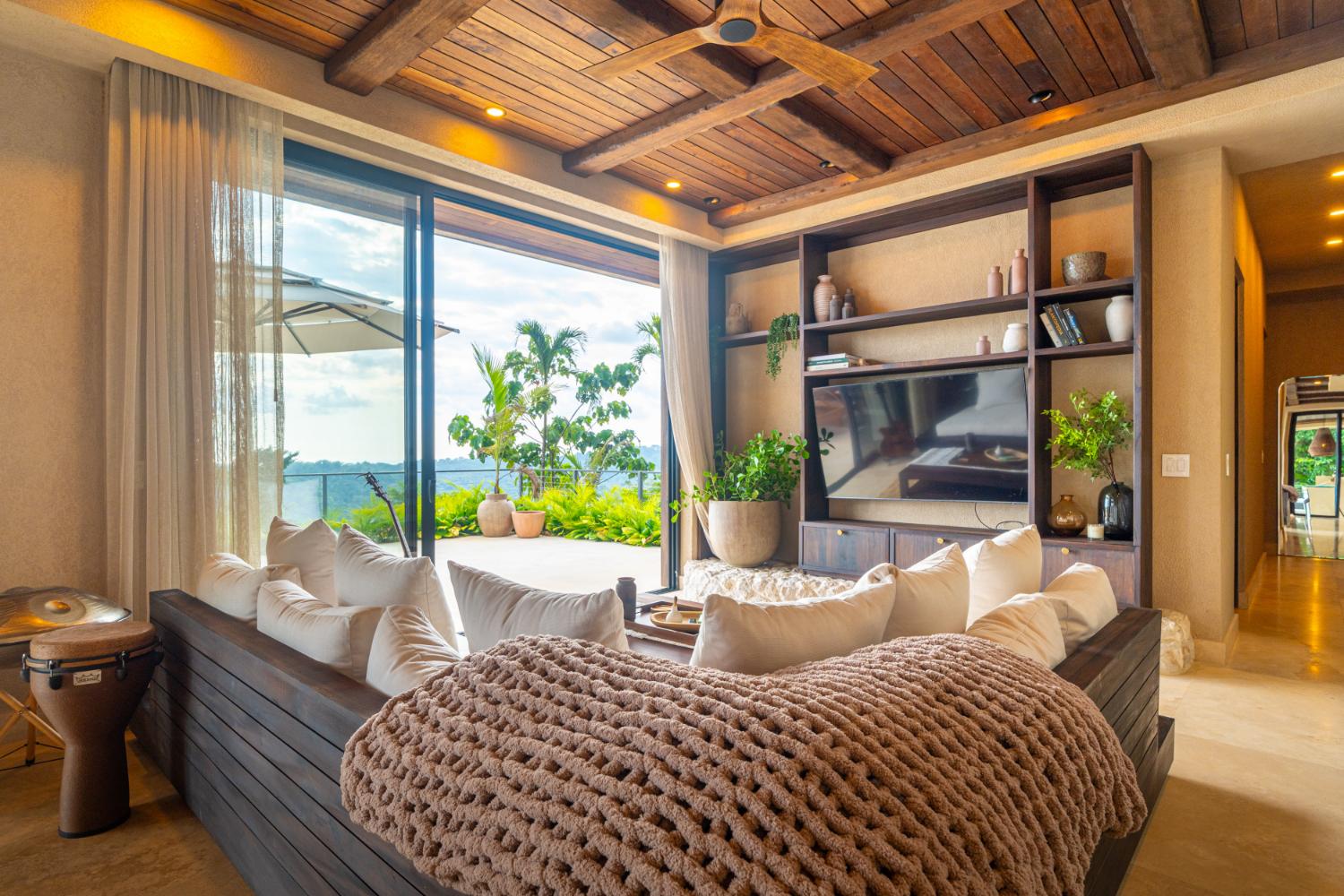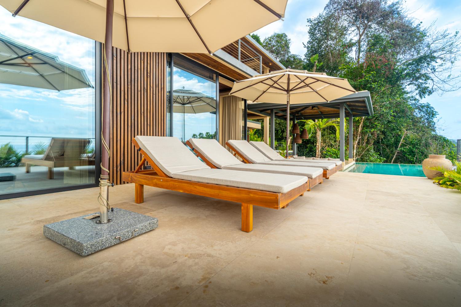 A hot tub faces the sunset, an outdoor bathroom and double shower make pool days easy, and a sunken lounge beneath a shaded pergola creates a natural setting for aperitifs, conversation, and the kind of evenings that stretch beautifully into night. A yoga deck above the terrace, together with mats, workout bands, and a Sonos sound system, adds a thoughtful wellness layer that many Costa Rica Villas near Dominical simply do not offer.