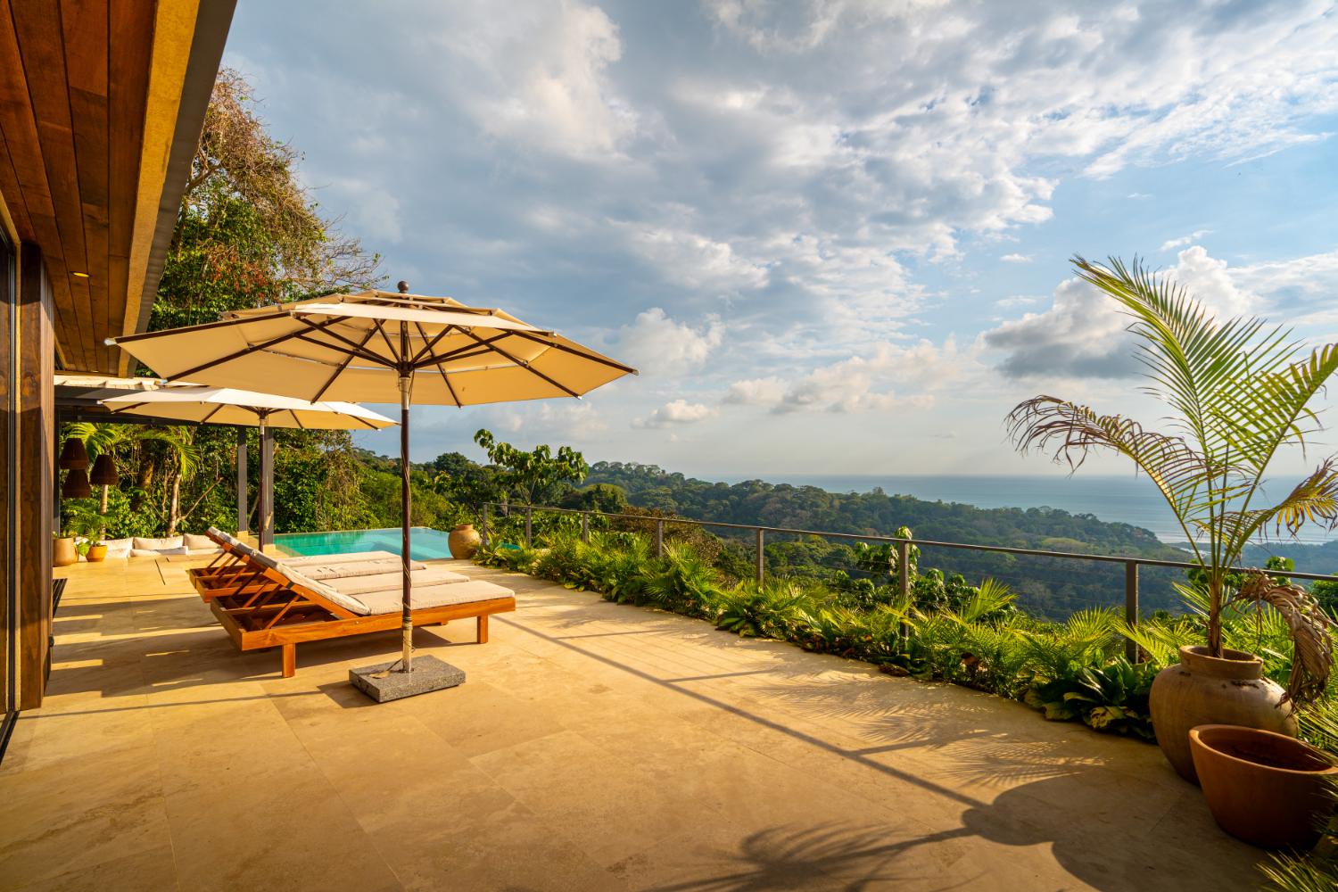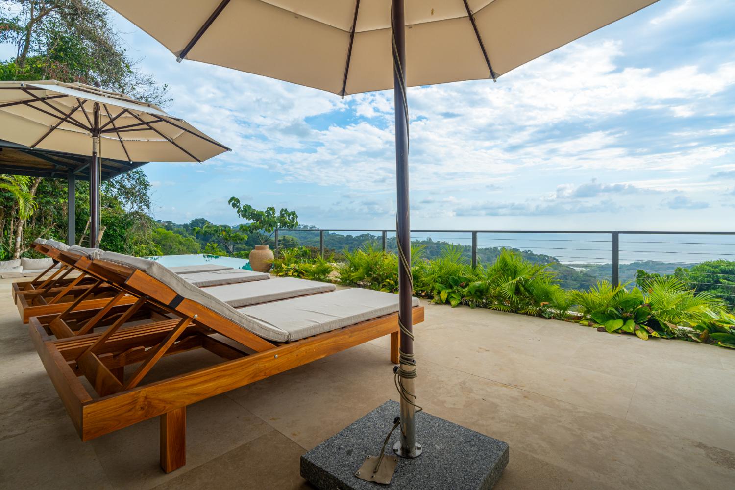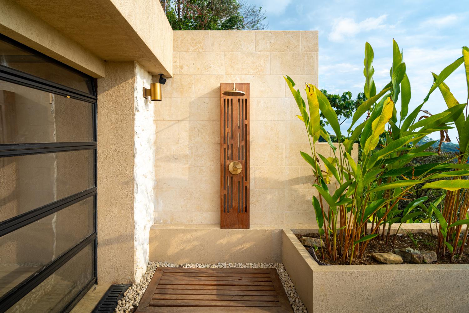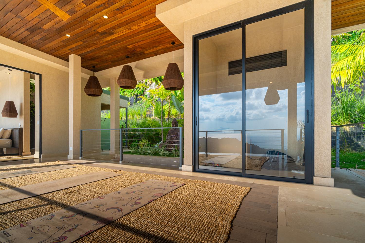 A hot tub faces the sunset, an outdoor bathroom and double shower make pool days easy, and a sunken lounge beneath a shaded pergola creates a natural setting for aperitifs, conversation, and the kind of evenings that stretch beautifully into night. A yoga deck above the terrace, together with mats, workout bands, and a Sonos sound system, adds a thoughtful wellness layer that many Costa Rica Villas near Dominical simply do not offer.