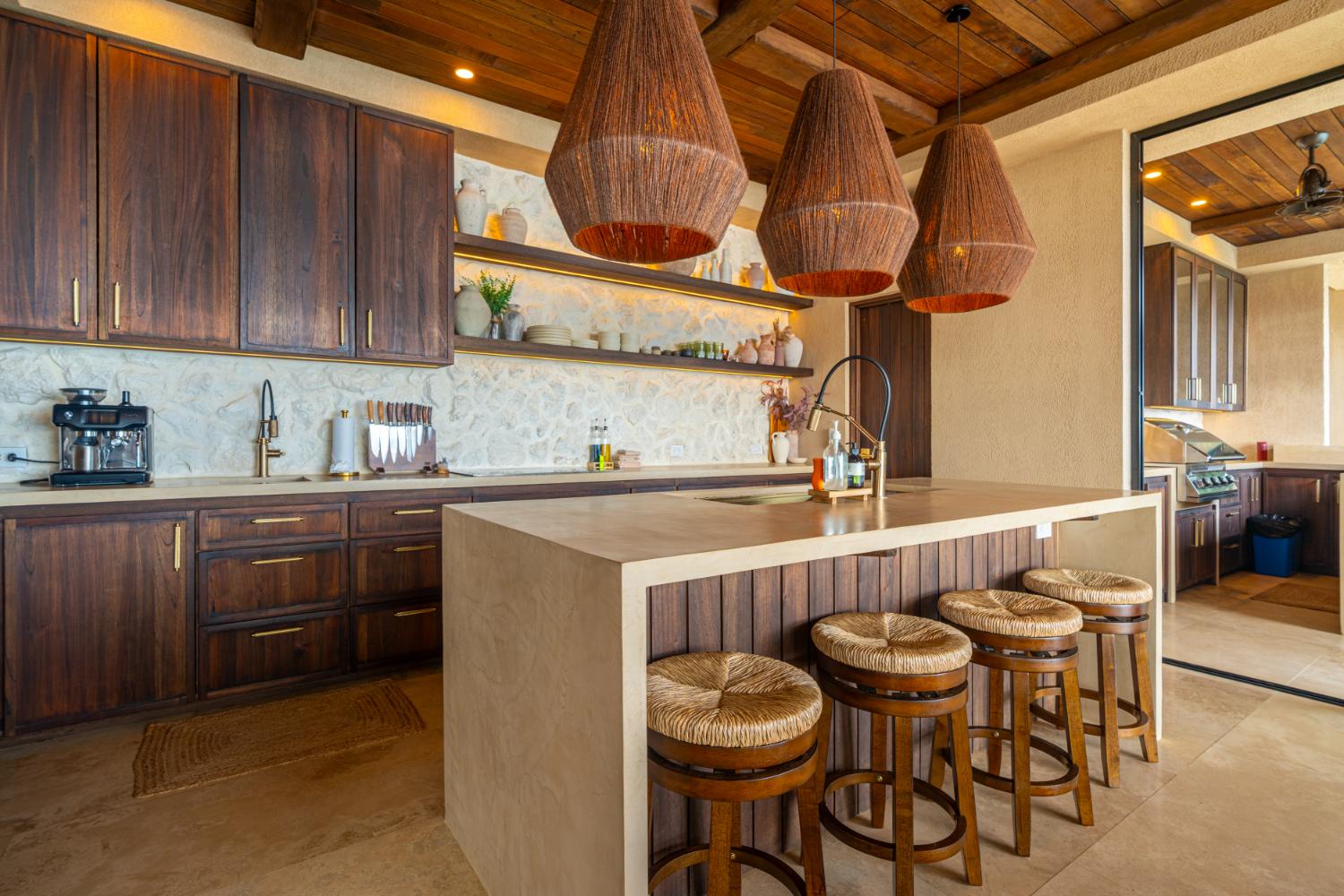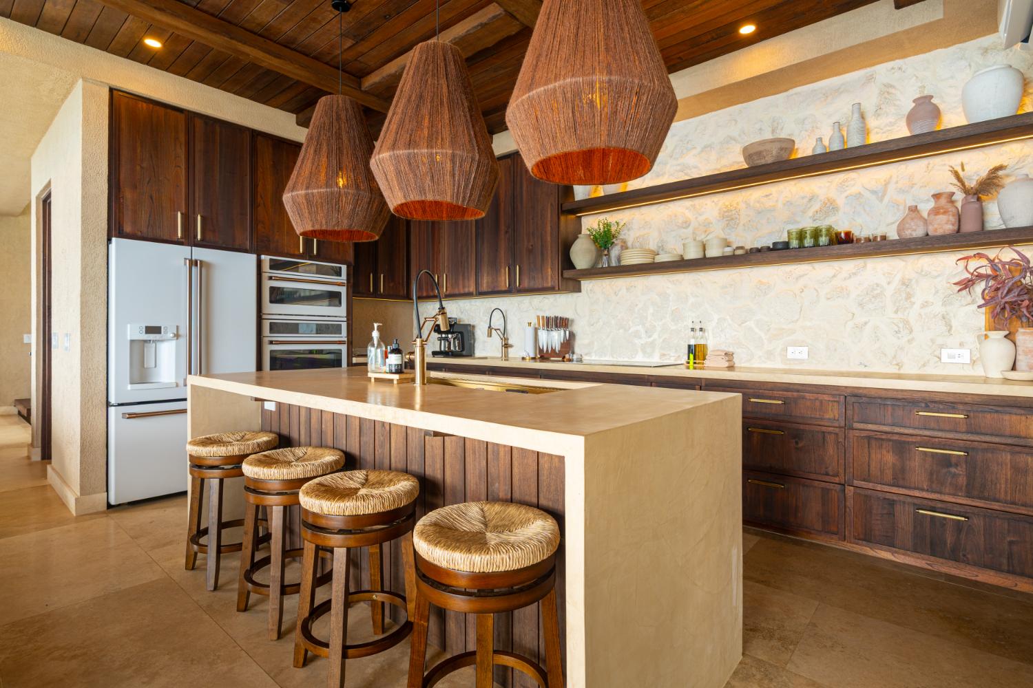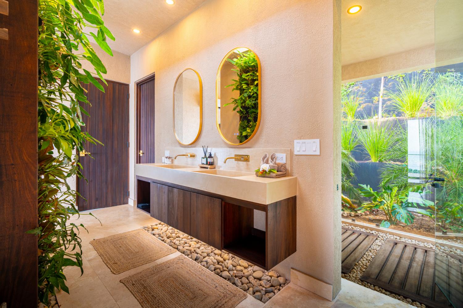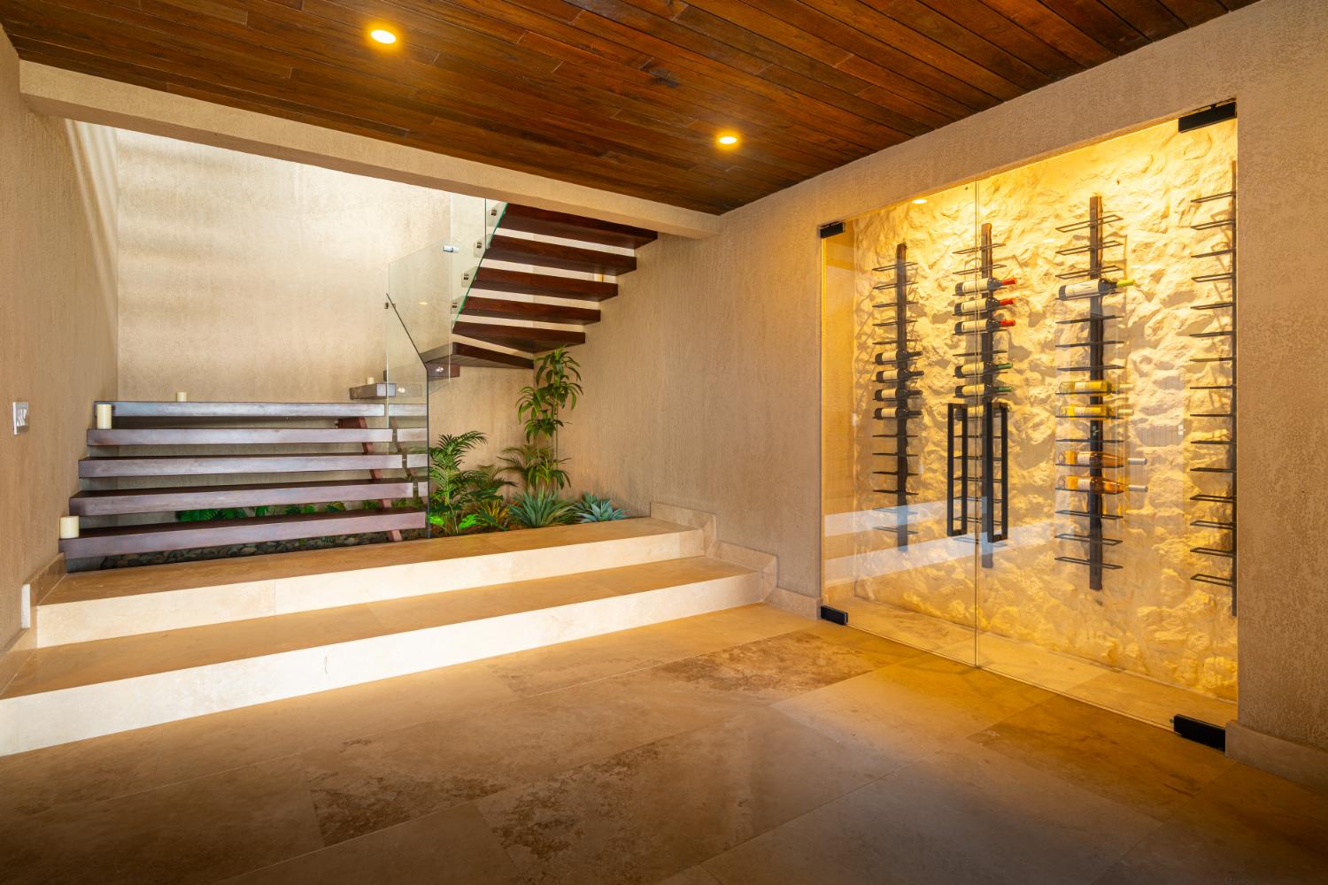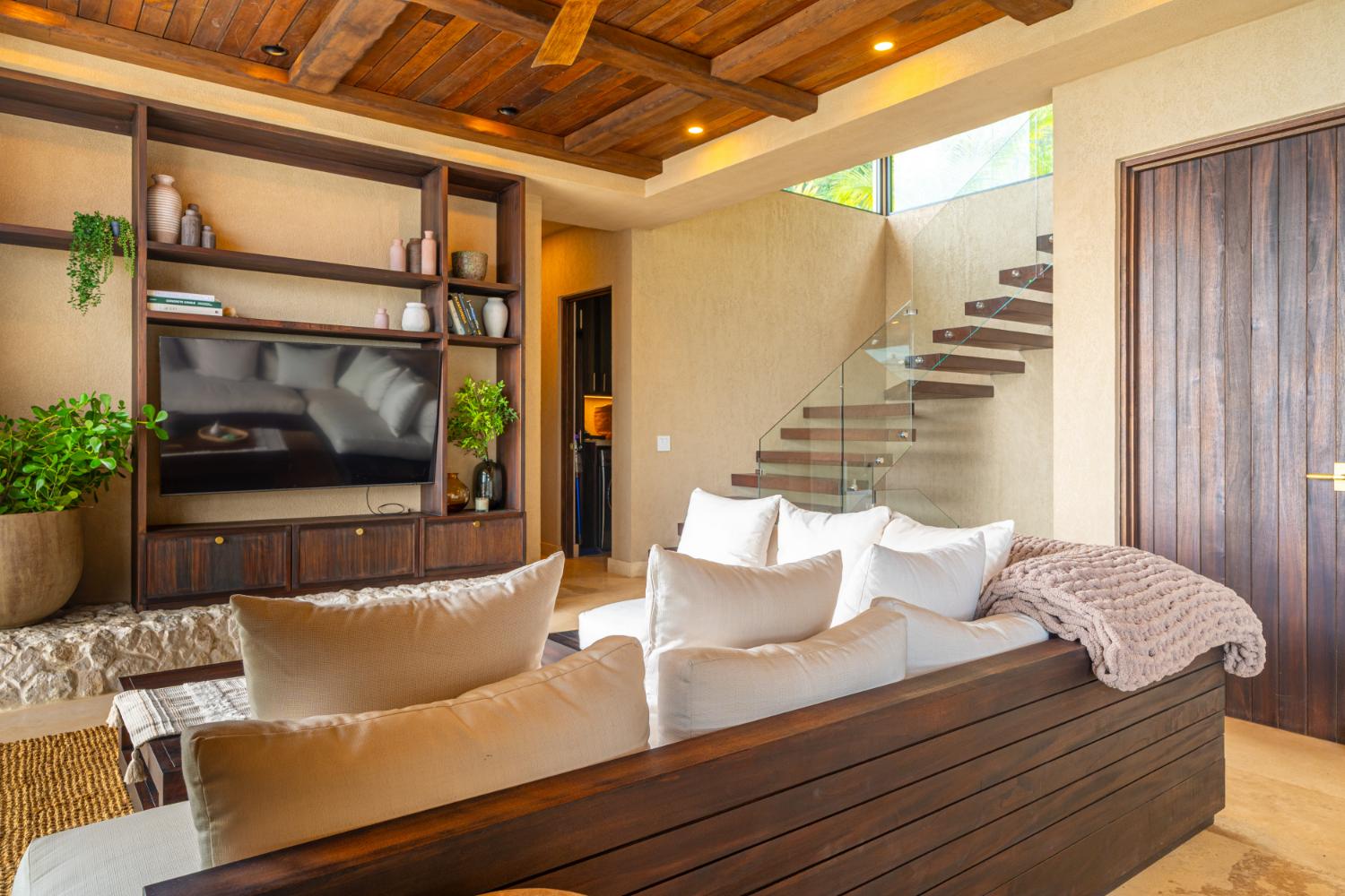 From the moment you arrive, Casa Riverstone unfolds with a sense of space and intention. The entrance level opens onto a generous landing with a wine wall and a flexible family room that works beautifully as a children’s retreat, media lounge, or relaxed workspace. The main residence includes four bedrooms, while a separate casita tucked beneath the entrance level adds an extra layer of privacy with its own kitchen, king bedroom, ensuite bathroom, and private terrace. This layout makes the villa especially well suited to multigenerational stays, two-family holidays, or guests traveling with a nanny, staff, or a couple who would appreciate their own independent space.