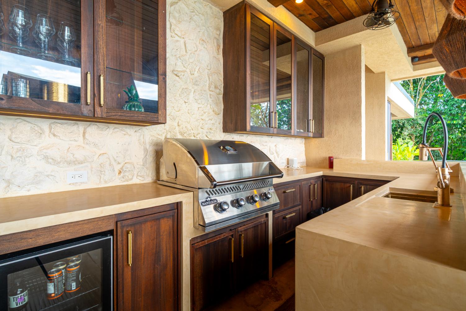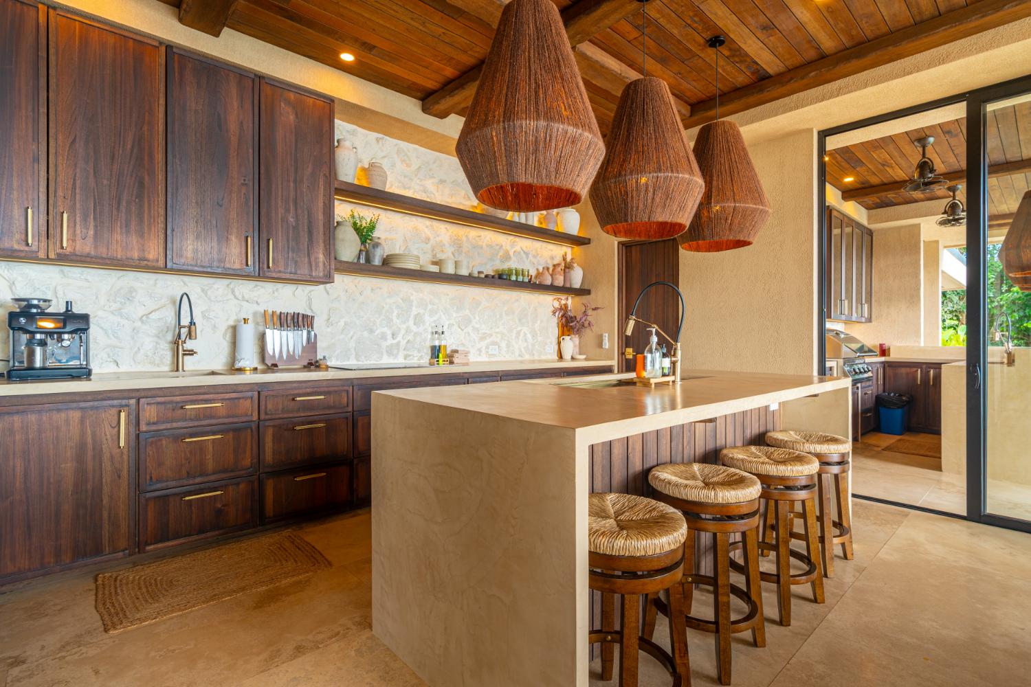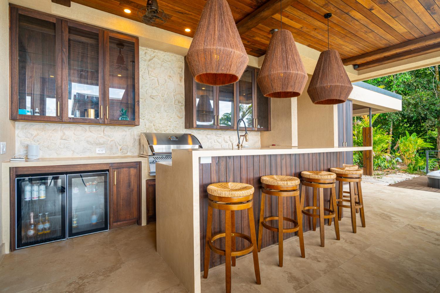 The heart of Casa Riverstone is the main living level, where indoor and outdoor life flow together effortlessly. The living room opens directly onto the terrace, the dining area comfortably seats up to 14 guests between the main table and island, and the kitchen is fully equipped for everything from easy breakfasts to chef-led dinners. Outside, the home becomes even more memorable: an outdoor bar and BBQ area sit just off the kitchen, while a wraparound terrace leads to a cantilevered infinity pool with a glass-sided edge featuring what the listing describes as the largest pool glass panel installed in Costa Rica.