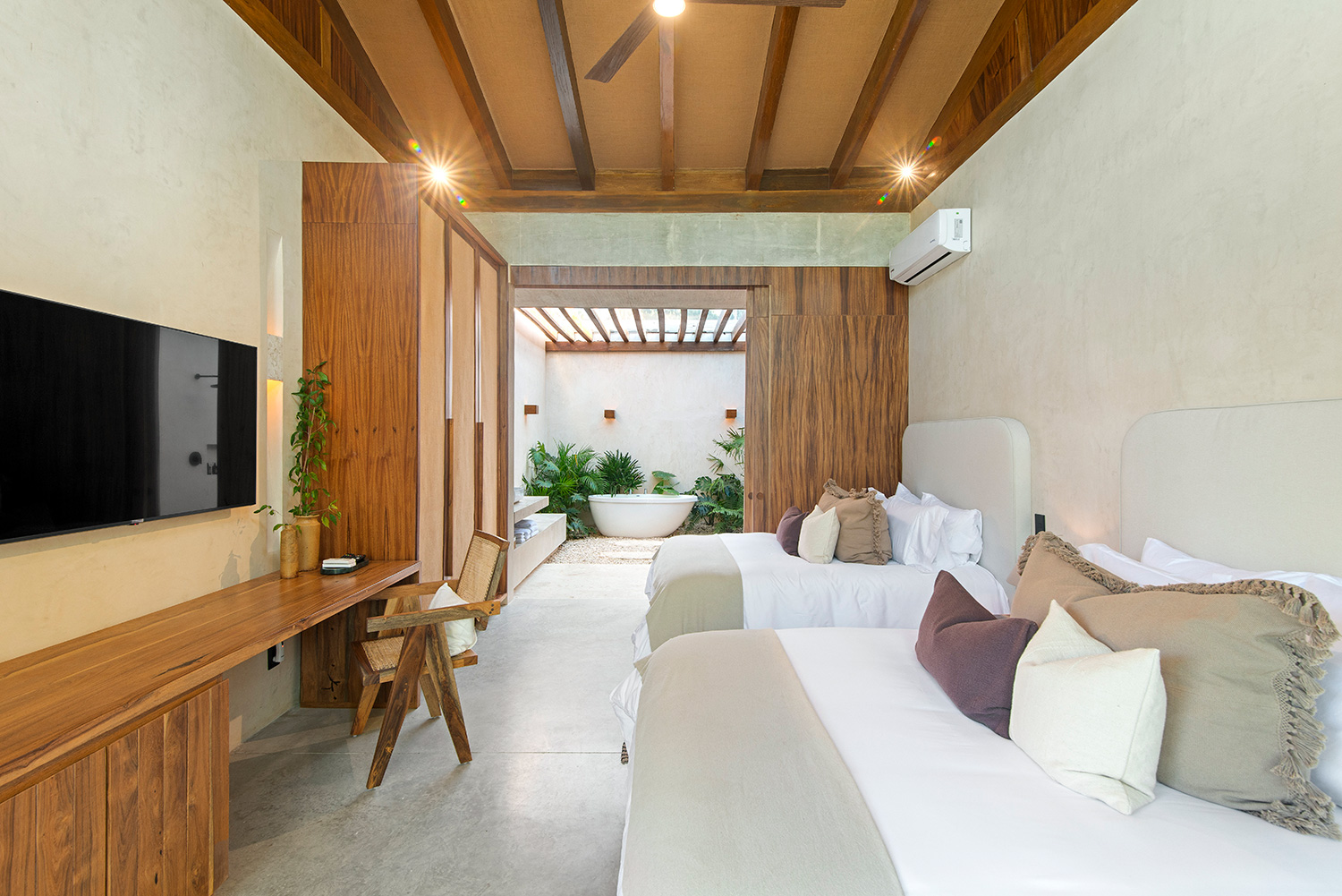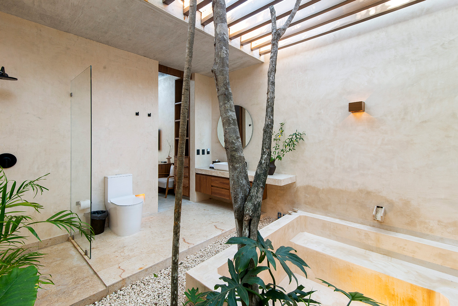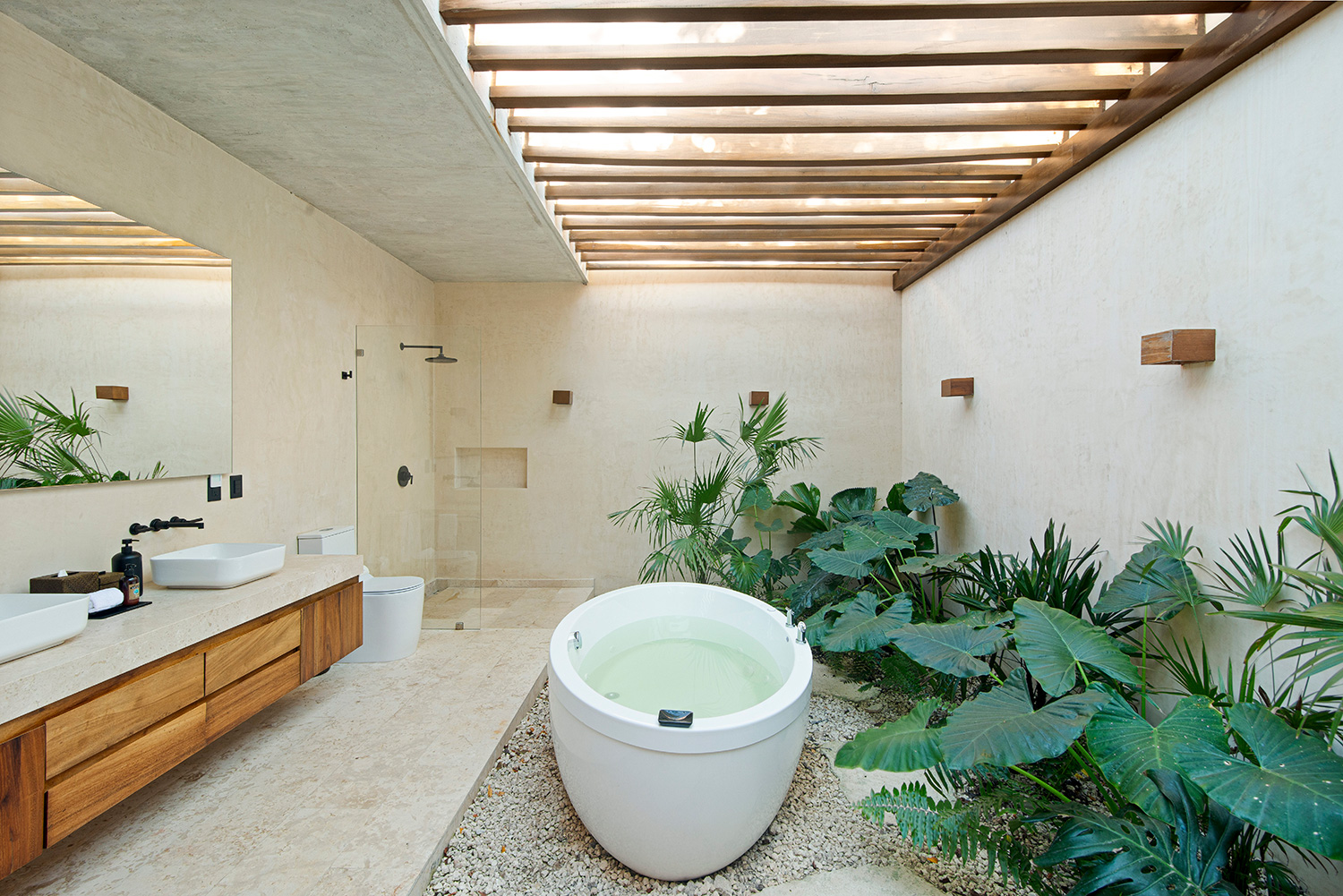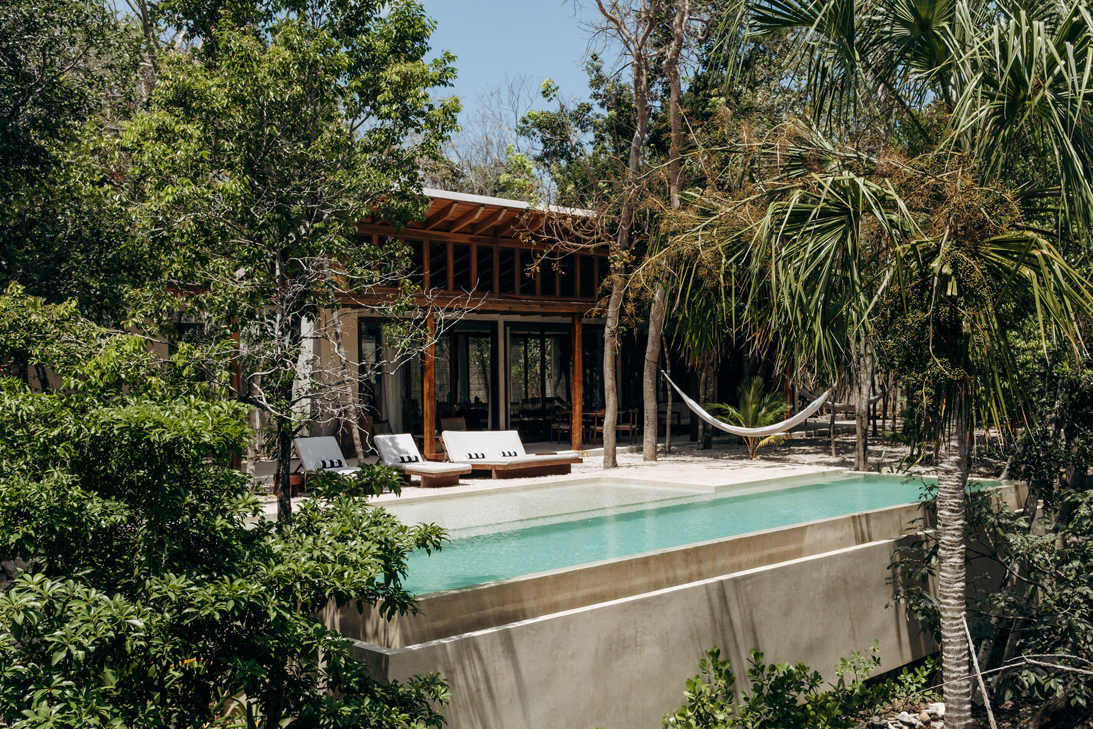 Each serene bedroom boasts its own indoor-outdoor bathroom, enhancing the sense of harmony with the surroundings. An infinity pool extends toward the jungle canopy, while a hidden cenote adds a touch of natural wonder. Completely off-grid and eco-conscious, Casa Tropical embodies sustainable luxury in the heart of Tulum.