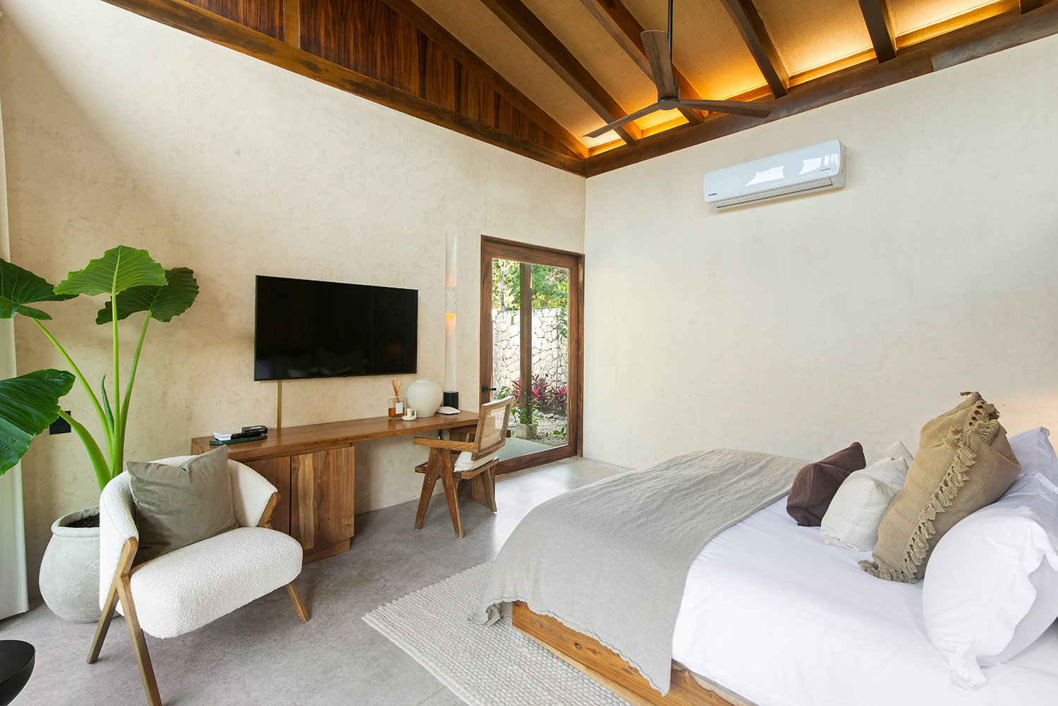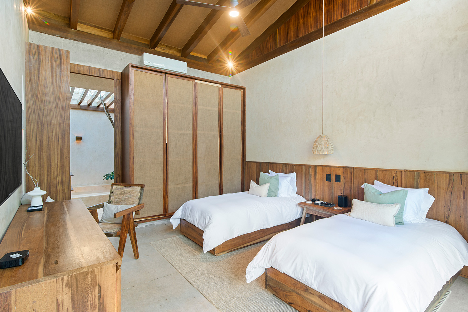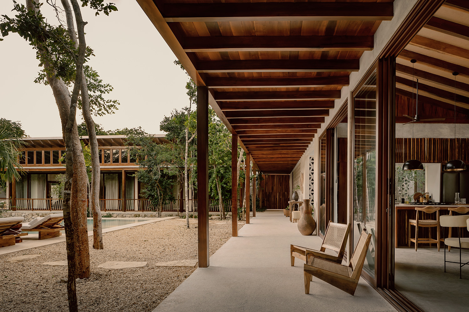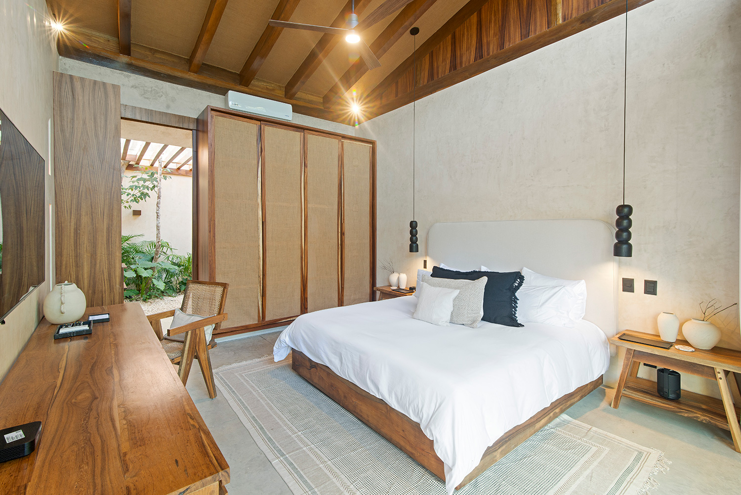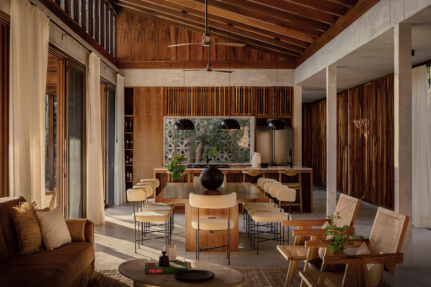Casa Tropical Tulum is nestled within lush greenery, this single-story, L-shaped sanctuary seamlessly merges indoor and outdoor living, offering breathtaking jungle views. With high ceilings and an open-concept design, the home exudes a tranquil, airy ambiance, perfect for relaxation and connecting with nature.