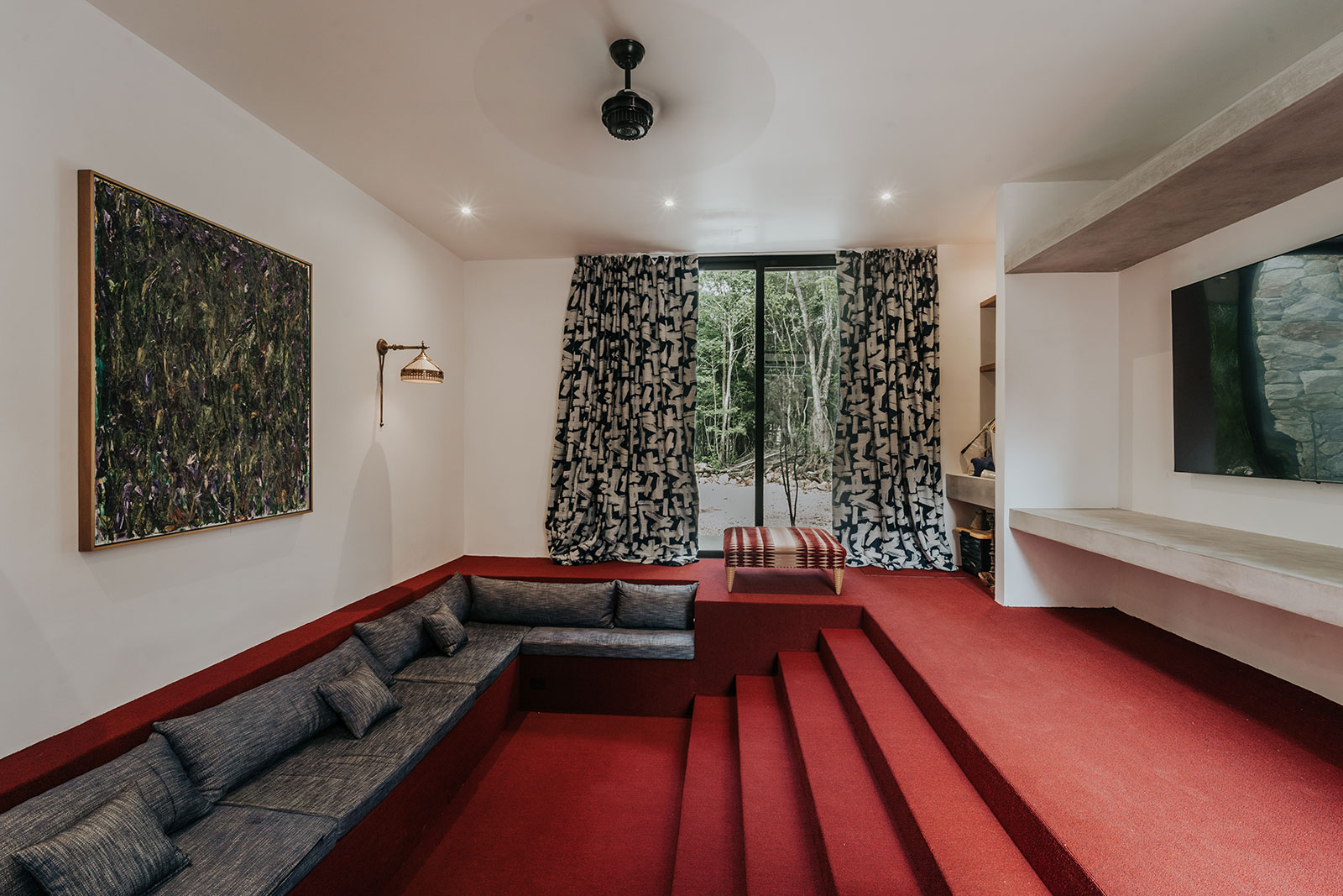 Days naturally orbit the outdoors. A striking 23-meter pool anchors the courtyard like a ribbon of turquoise, made for morning laps, floating afternoons, and sunset dips after beach time. When you’re ready to move, the private tennis court and onsite gym keep routines intact, while the sunken media room turns movie night into an event. Terraces tucked around the home invite slow living: a jacuzzi under the sky, shaded barbecue moments, and jungle views that glow golden as the light drops.